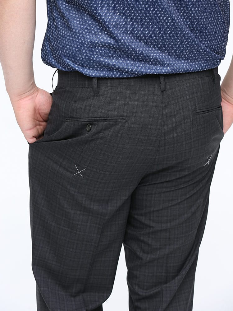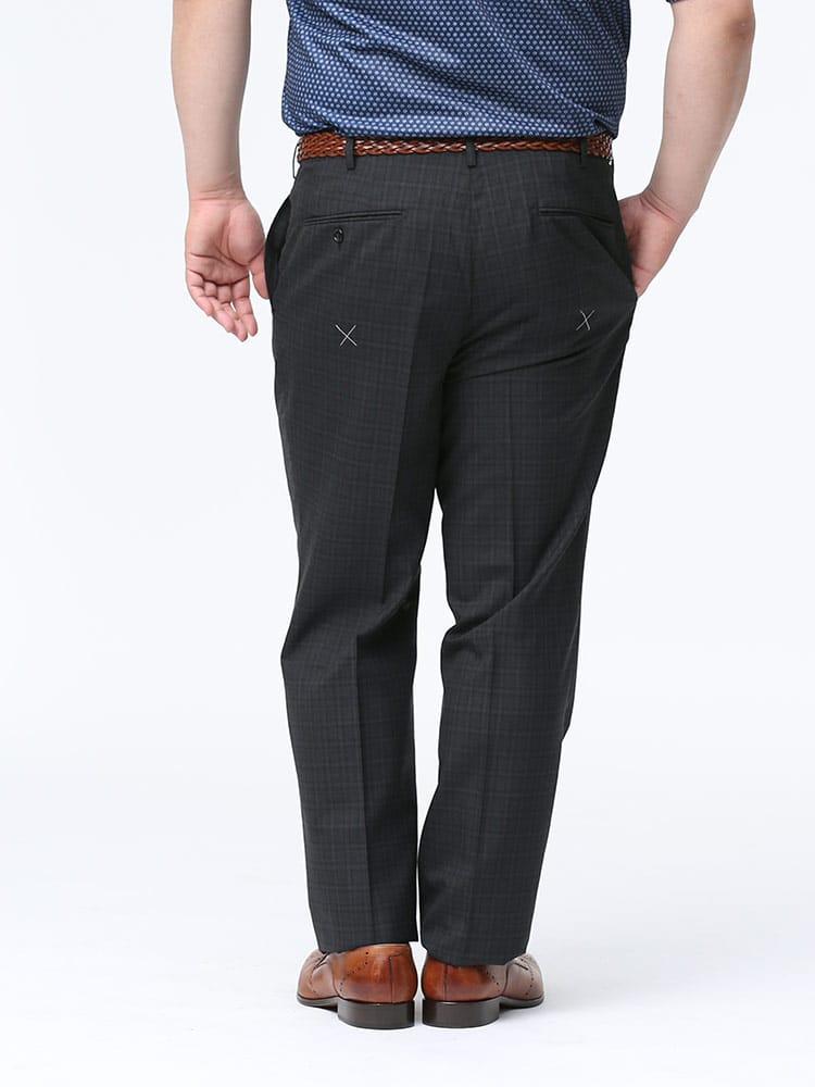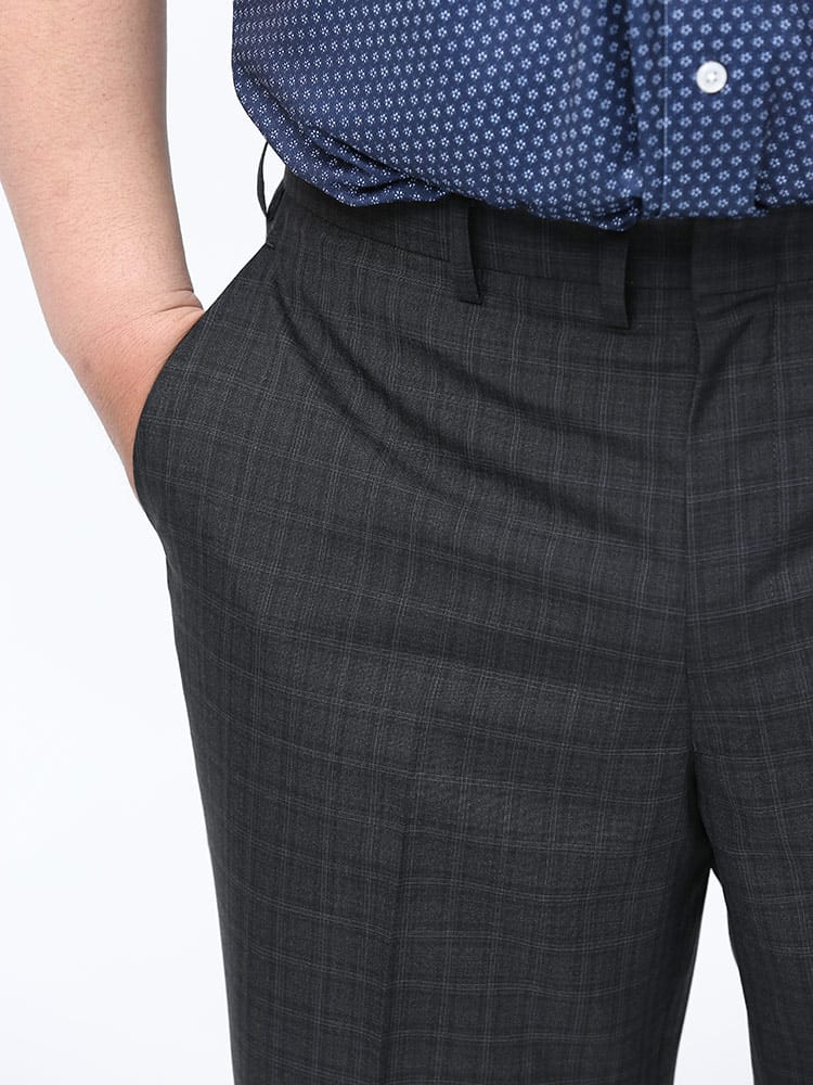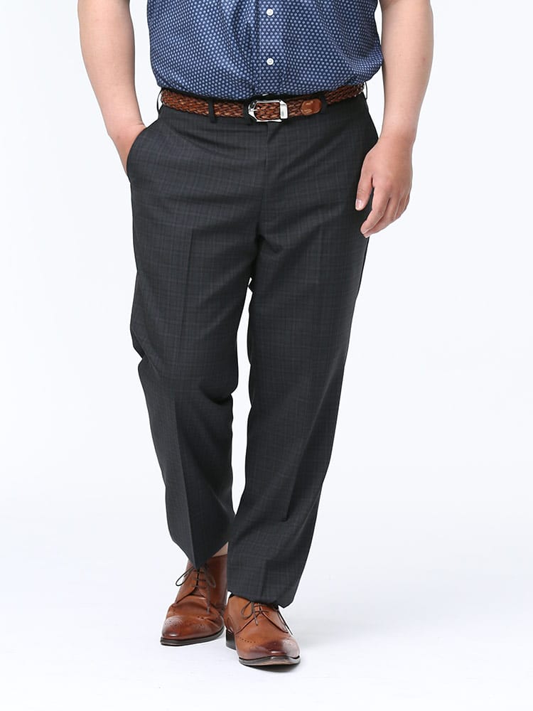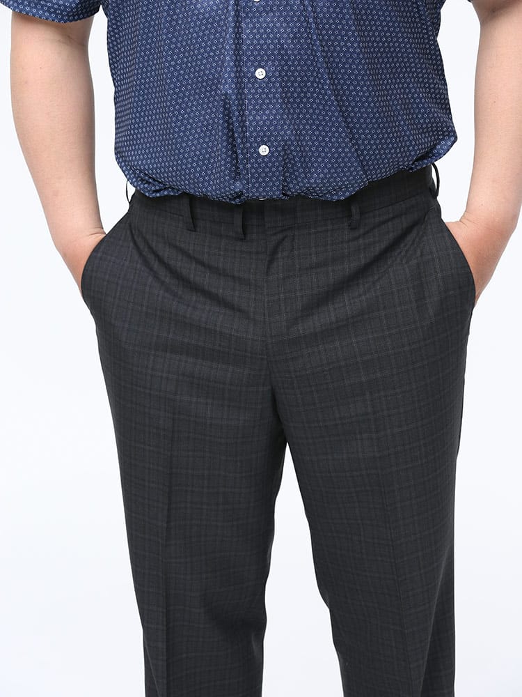 すっきりとしたシルエットが魅力的なノータックスラックスです。素材には上品な印象のウール混を使用しました。上品でスタイリッシュな印象のデザイン。さりげないチェック柄で、お手持ちのジャケットと合わせてジャケパンスタイルもお楽しみいただけます。