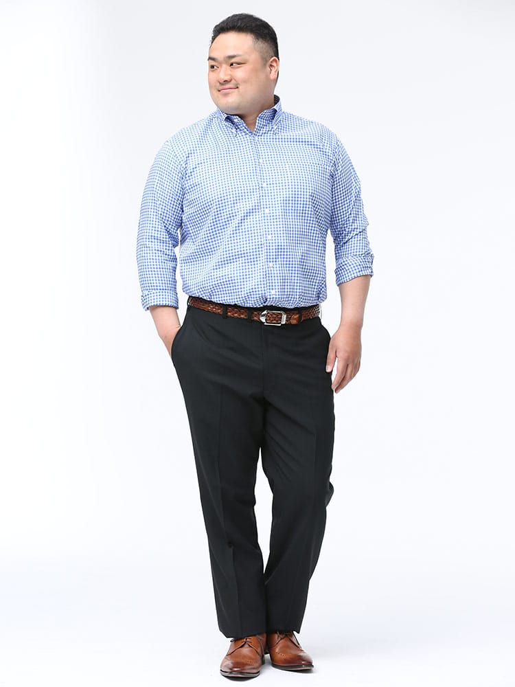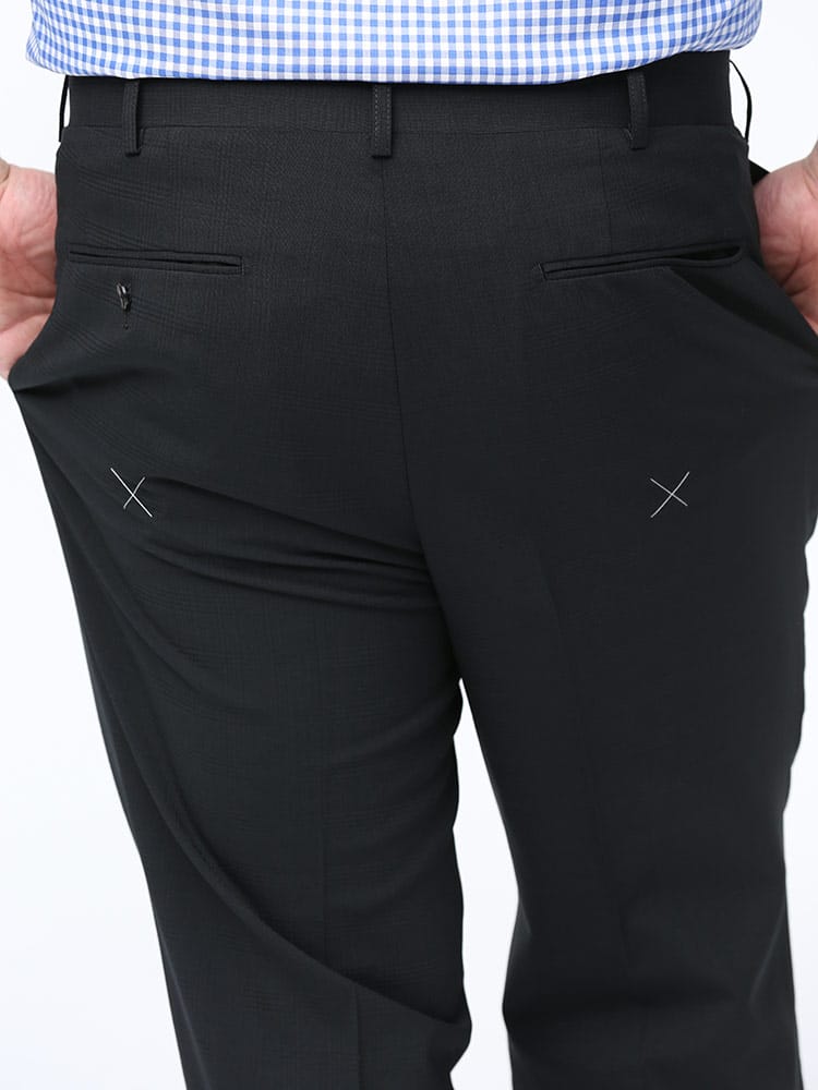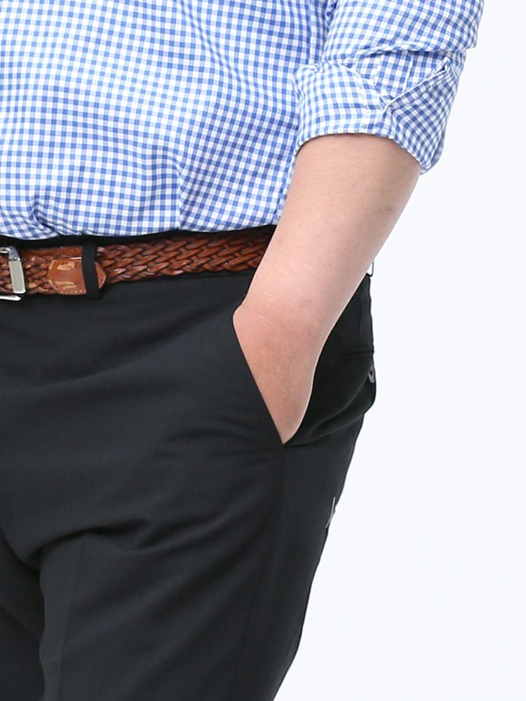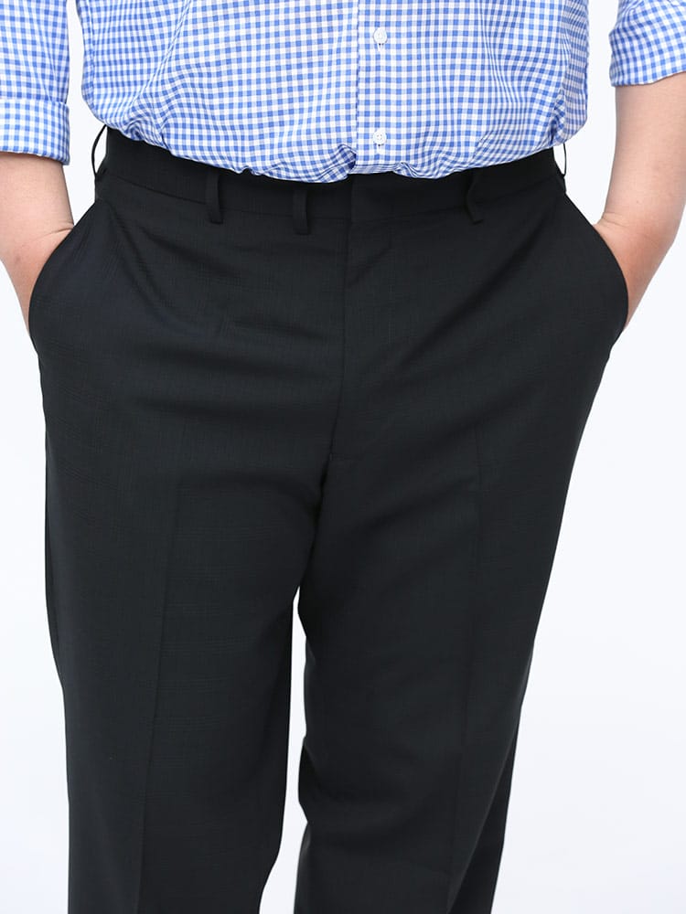 すっきりとしたシルエットが魅力的なノータックスラックスです。素材には上品な印象のウール混を使用しました。上品でスタイリッシュな印象のデザイン。さりげないチェック柄で、お手持ちのジャケットと合わせてジャケパンスタイルもお楽しみいただけます。
