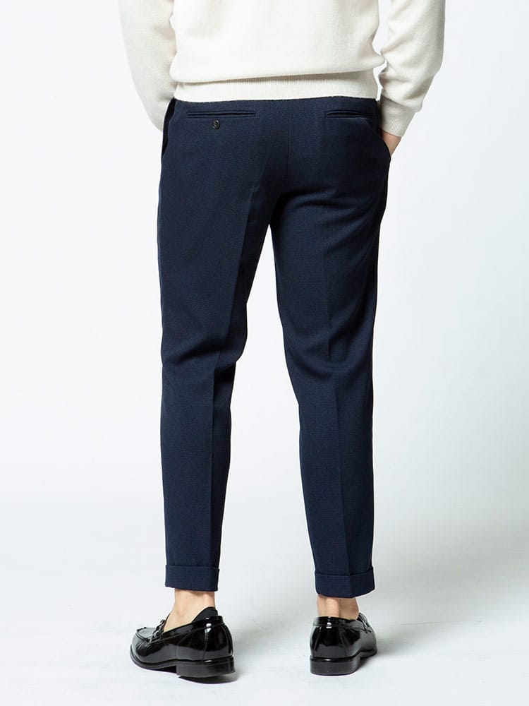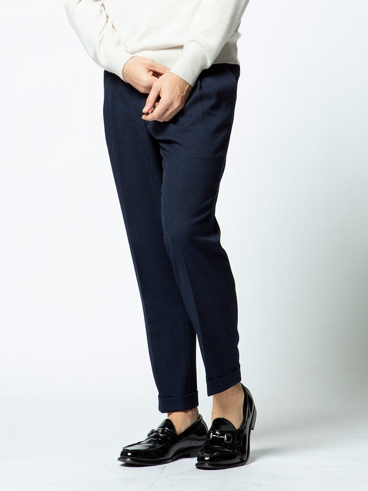 ナチュラルストレッチで快適な着心地のチェック ツータック スラックスです。ツータックでゆとりのあるデザイン。素材に高いイージーケア性があり、ウールライクな質感を表現した高感度、多機能素材のLANATEC(ラナテック)を使用しています。ウォッシャブルでご家庭でお手軽にお手入れ出来るのも魅力です。