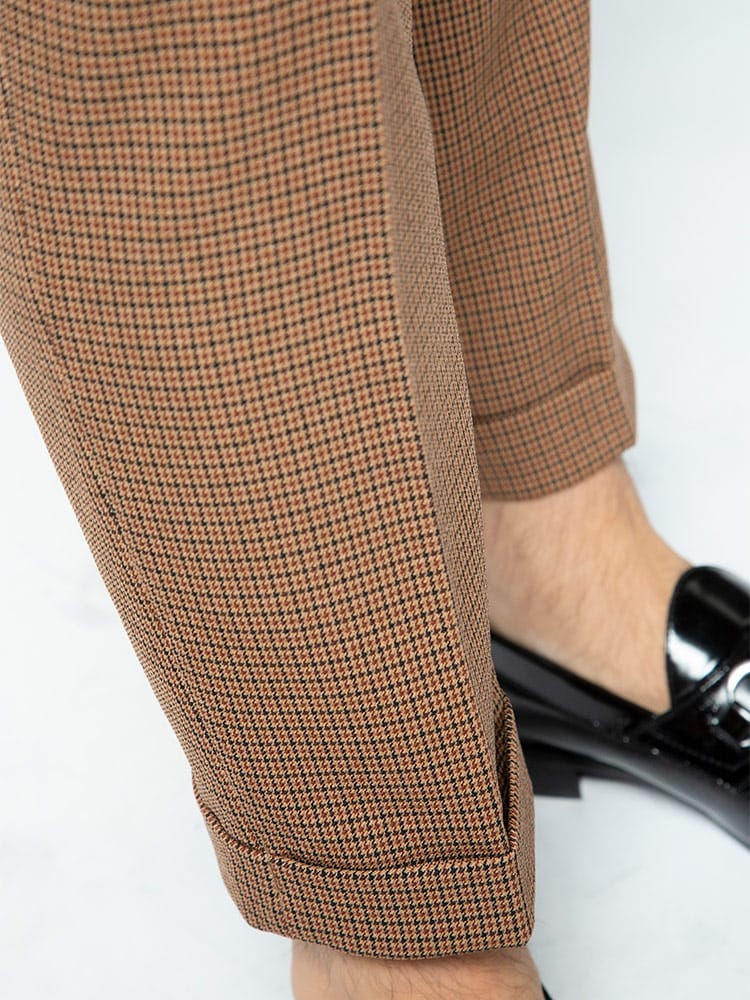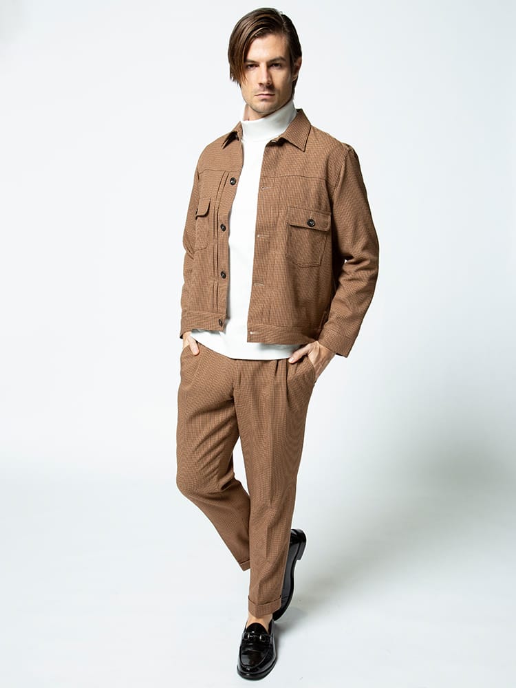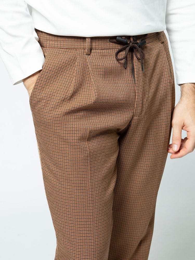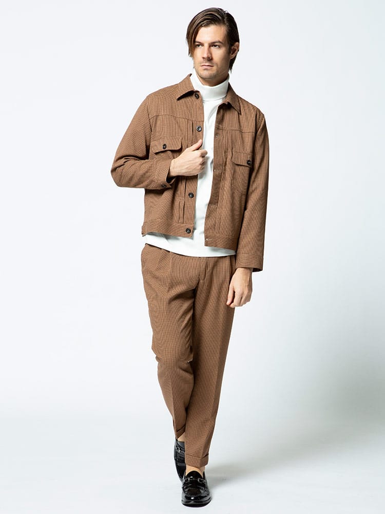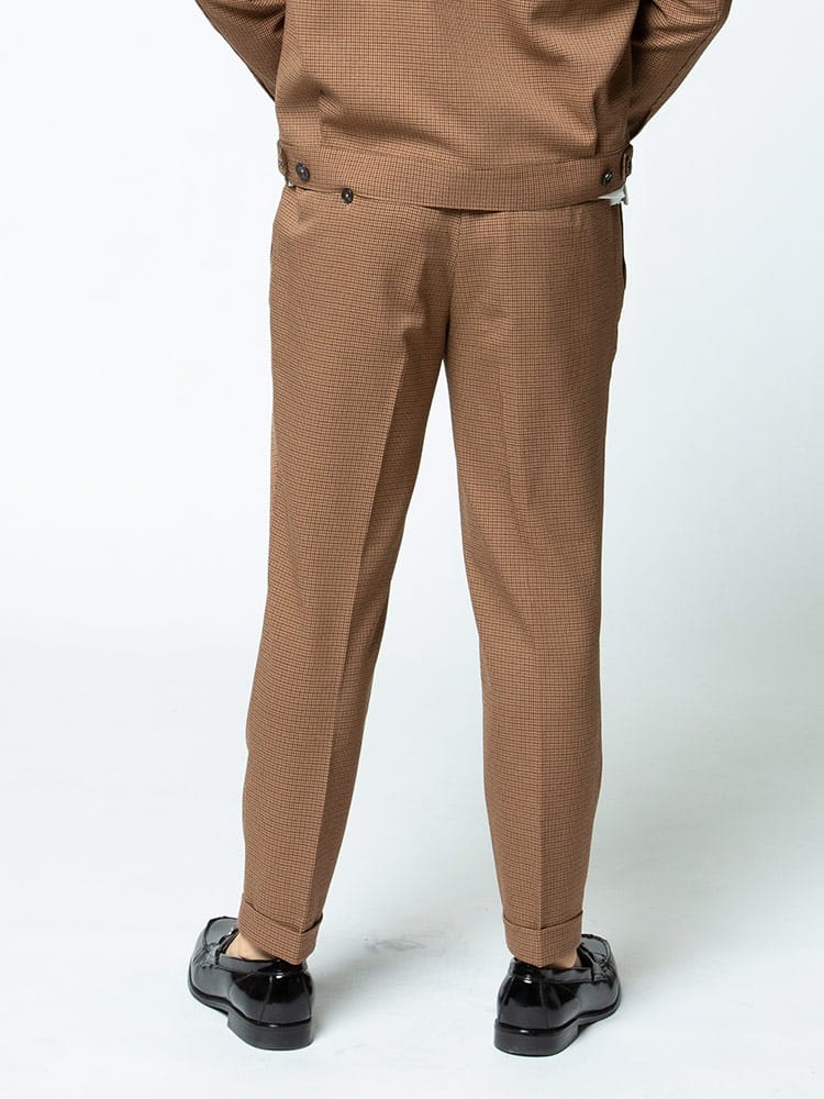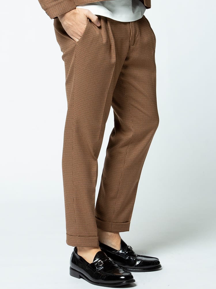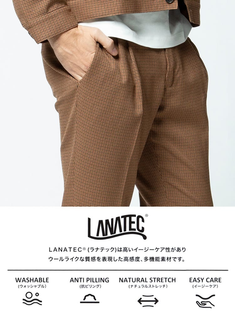 ナチュラルストレッチで快適な着心地の千鳥柄 ツータック スラックスです。ツータックでゆとりのあるデザイン。素材に高いイージーケア性があり、ウールライクな質感を表現した高感度、多機能素材のLANATEC(ラナテック)を使用しています。ウォッシャブルでご家庭でお手軽にお手入れ出来るのも魅力です。