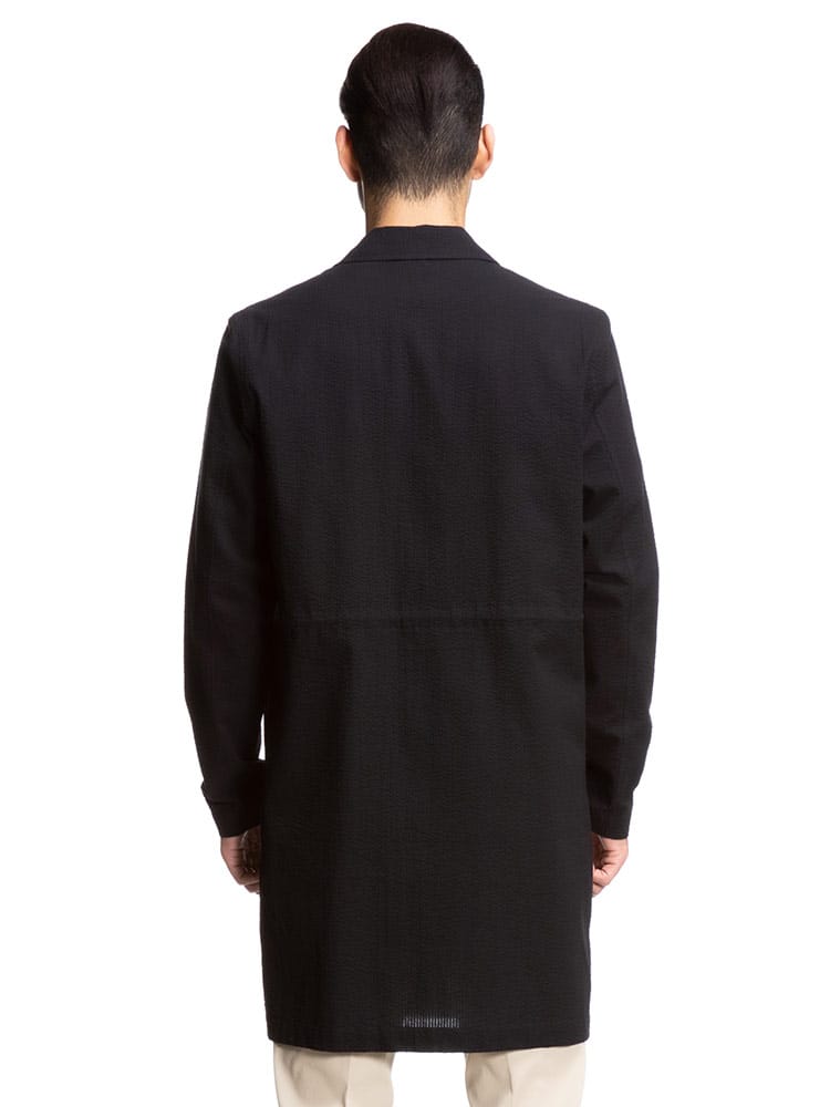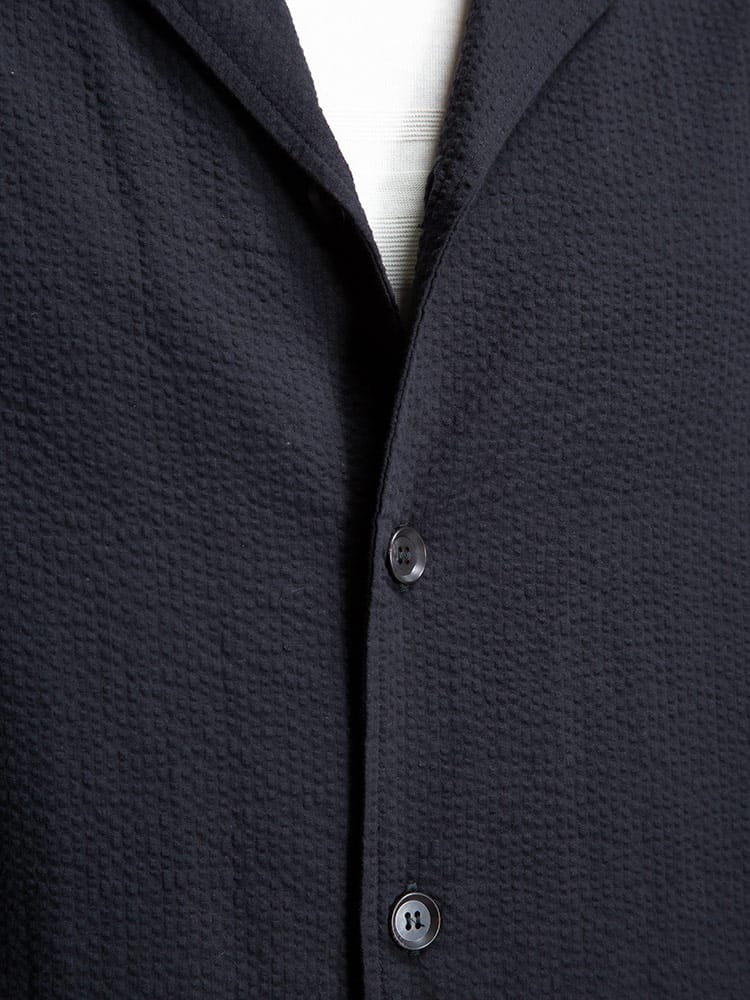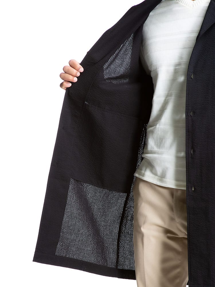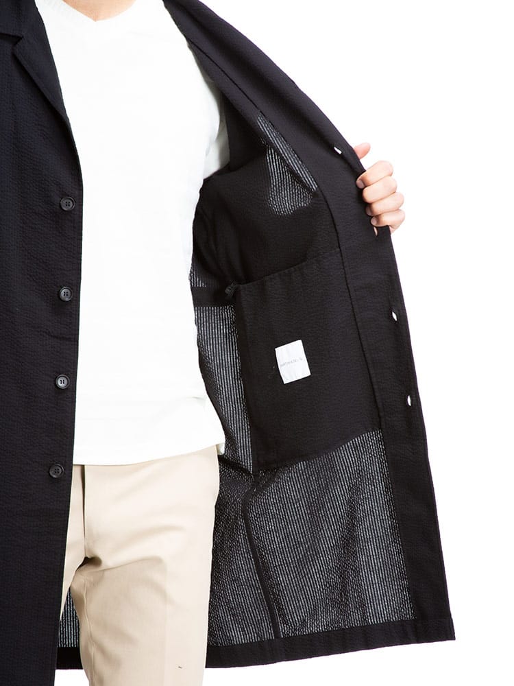 清涼感のあるシアサッカー生地で仕上げたシングル シャツコートです。軽量でサッと軽く羽織っていただけます。後ろ身頃にドローコード付きでシルエットを変えることが出来ます。裏地なしの薄手の生地で暖かくなる春夏のアウターにおすすめの一着です。