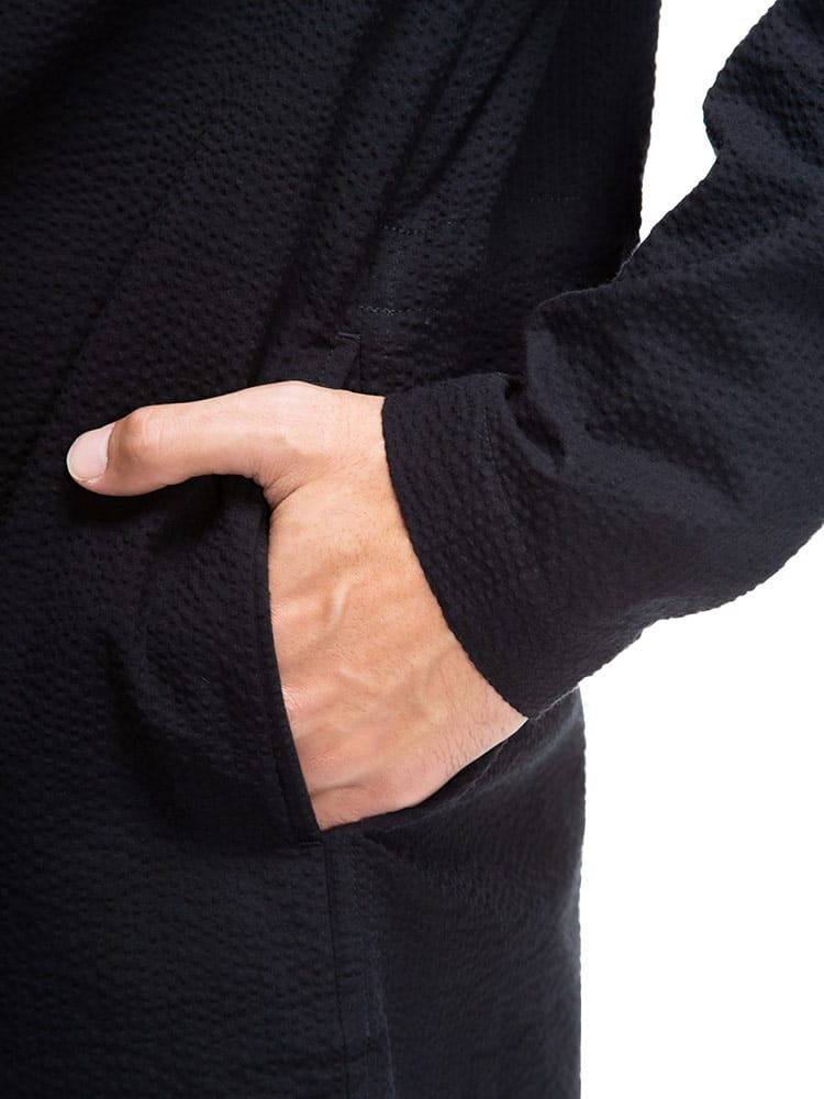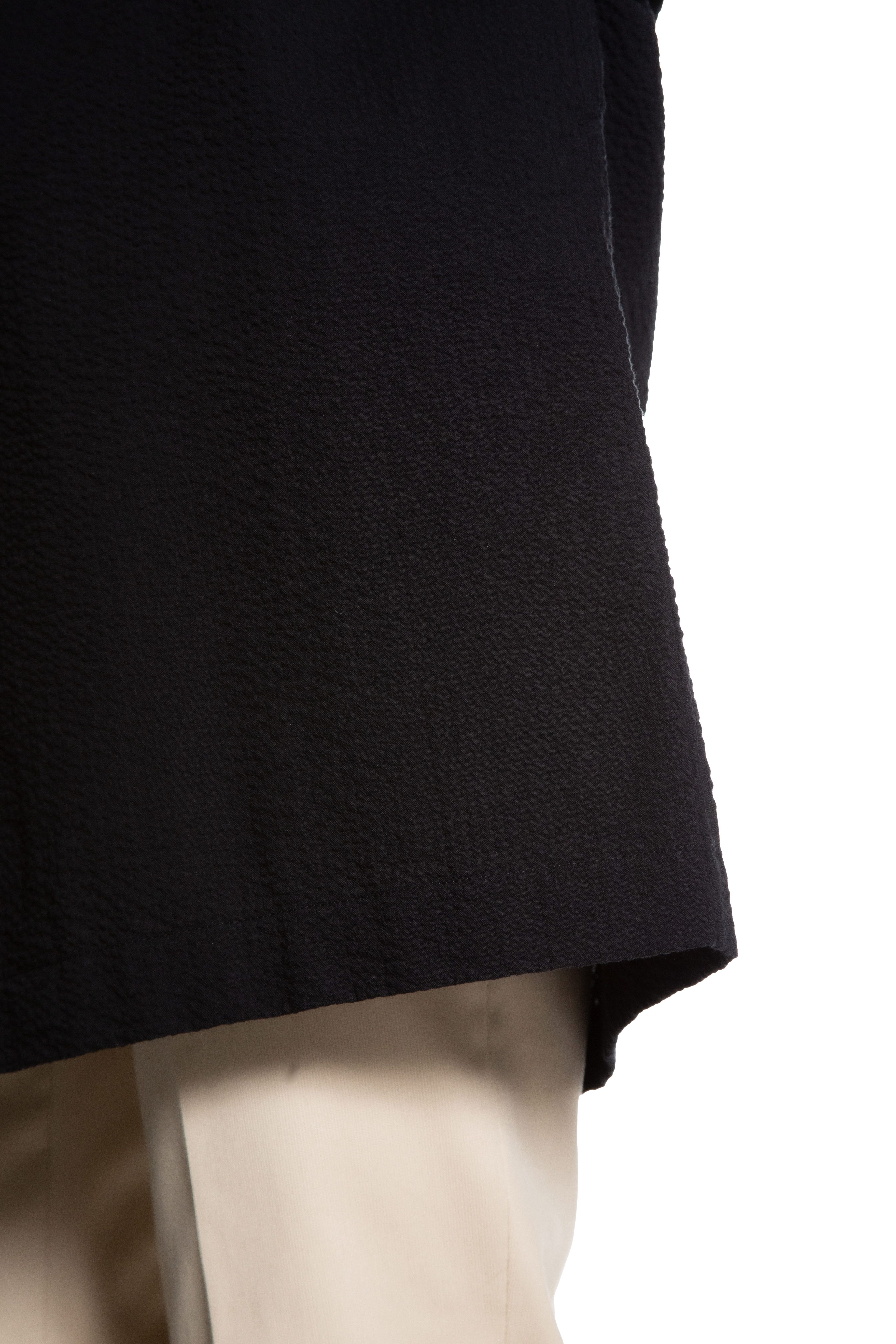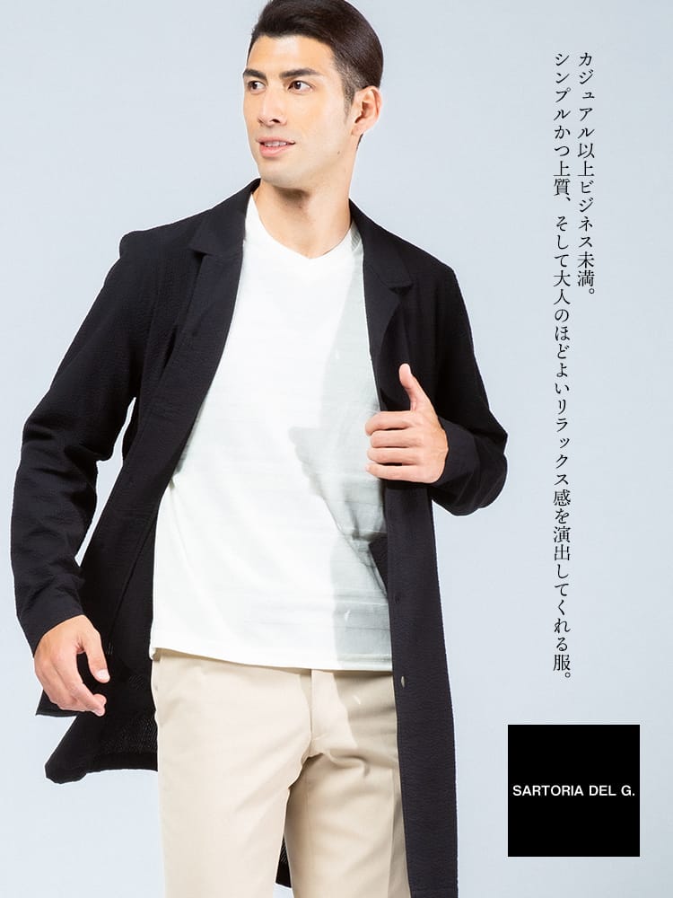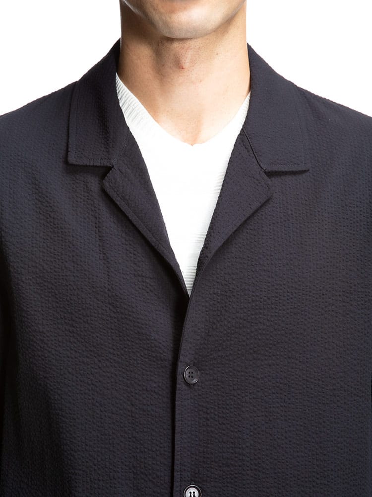 清涼感のあるシアサッカー生地で仕上げたシングル シャツコートです。軽量でサッと軽く羽織っていただけます。後ろ身頃にドローコード付きでシルエットを変えることが出来ます。裏地なしの薄手の生地で暖かくなる春夏のアウターにおすすめの一着です。