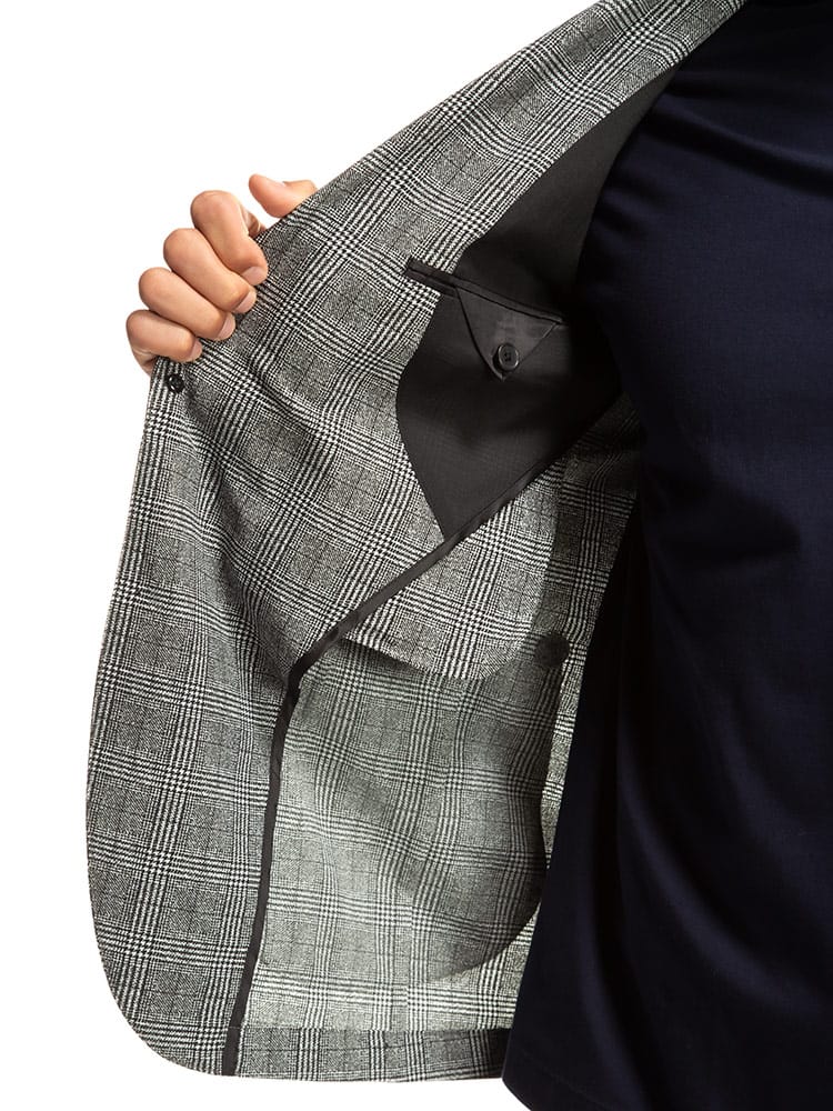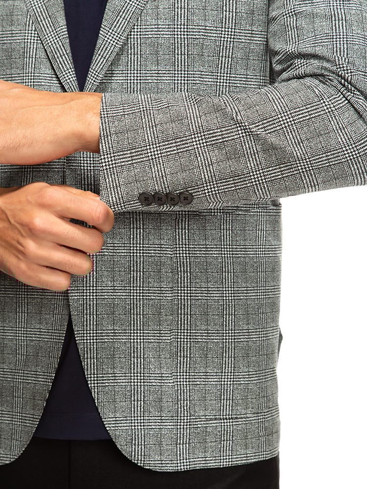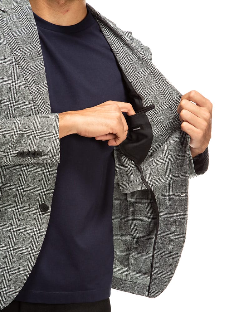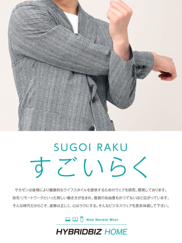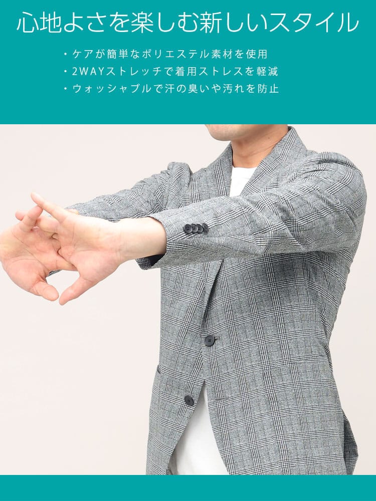 従来の商品より2倍伸びるすごいらくストレッチのチェック シングル 2ツ釦 ジャケットです。制菌性素材(銀イオン効果)リフレッシュPスーパーを使用し、清潔に着ていただけます。ストレッチ抜群で着心地の良さがポイントです。お手持ちのパンツと合わせたジャケパンスタイルやカジュアルなスタイルにマッチするアイテムです。