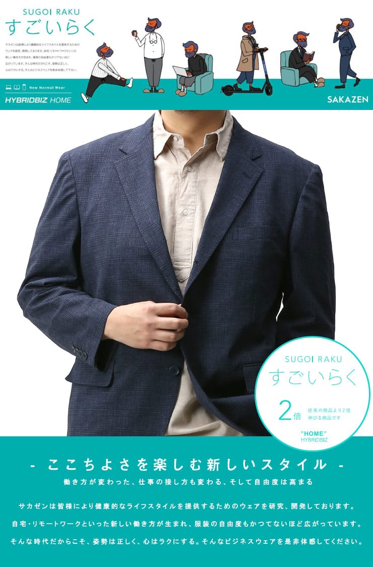 従来の商品より2倍伸びるすごいらくストレッチのヘリンボン 段返り3ツ釦 ジャケットです。制菌性素材(銀イオン効果)リフレッシュPスーパーを使用し、清潔に着ていただけます。クールマックスコアテクノロジーにより、涼しくドライな着心地を提供します。動きやすいサイドベンツ仕様。上品なデザインで幅広いパンツと相性抜群でスラックスと合わせたジャケパンスタイルにもおすすめです。
