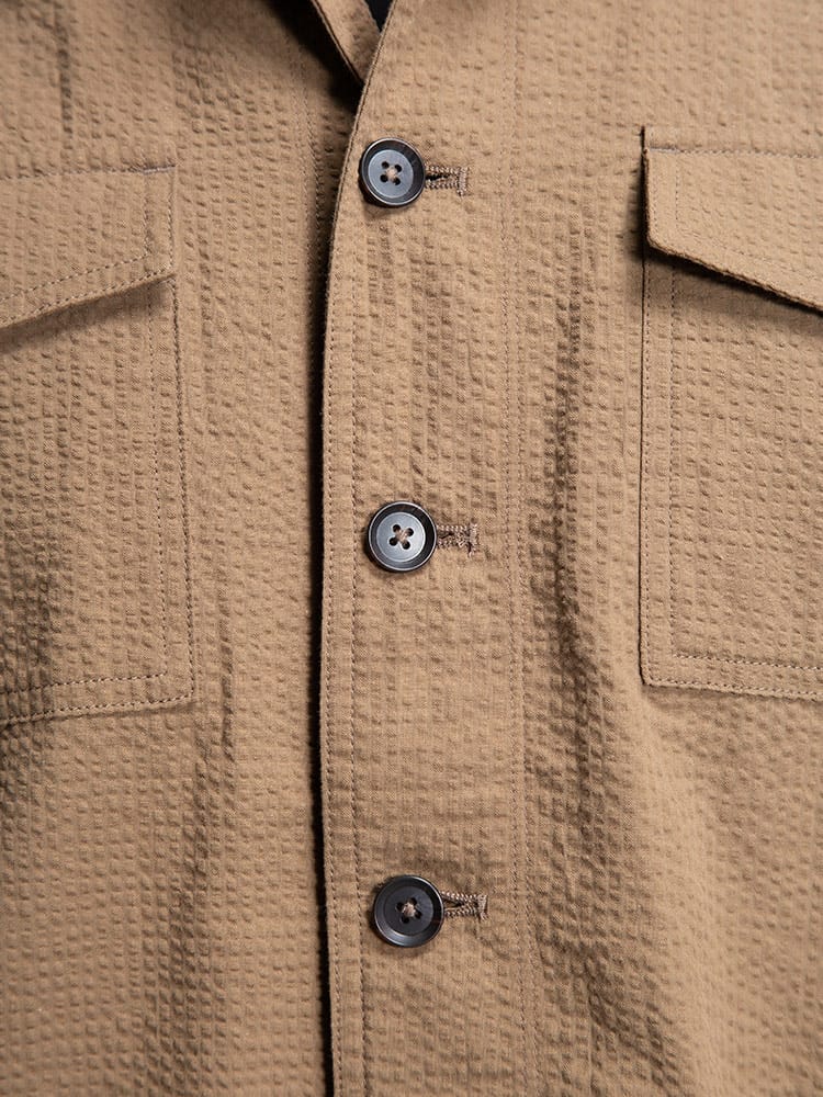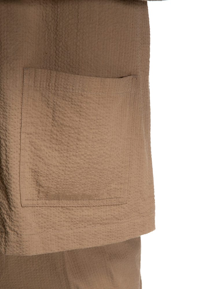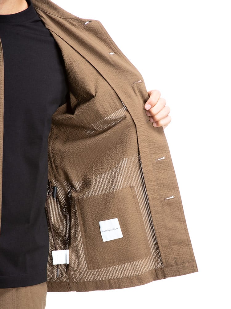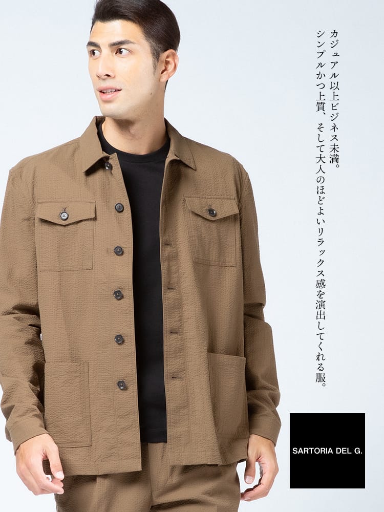清涼感のあるシアサッカー生地で仕上げたカバーオール ジャケットです。軽量でサッと軽く羽織っていただけます。後ろ身頃にドローコード付きでシルエットを変えることが出来ます。裏地なしの薄手の生地で暖かくなる春夏のアウターにおすすめの一着です。