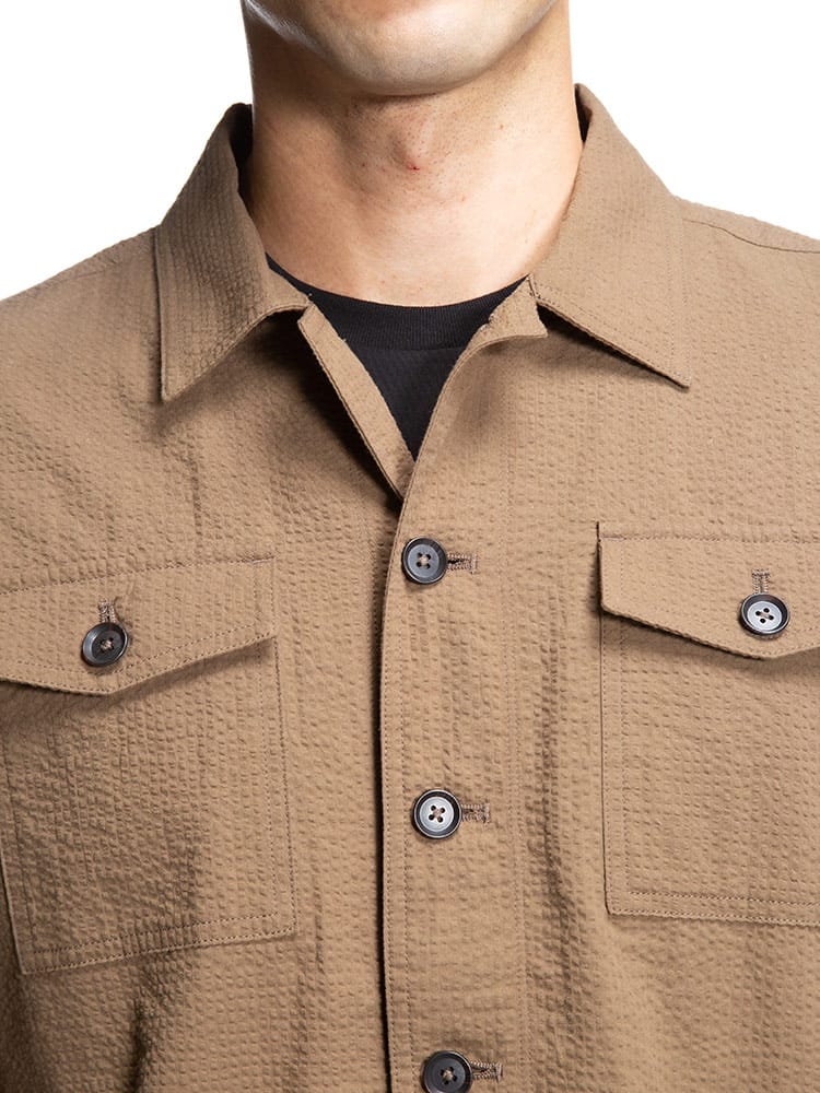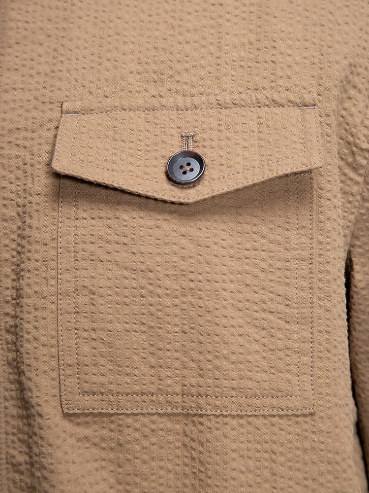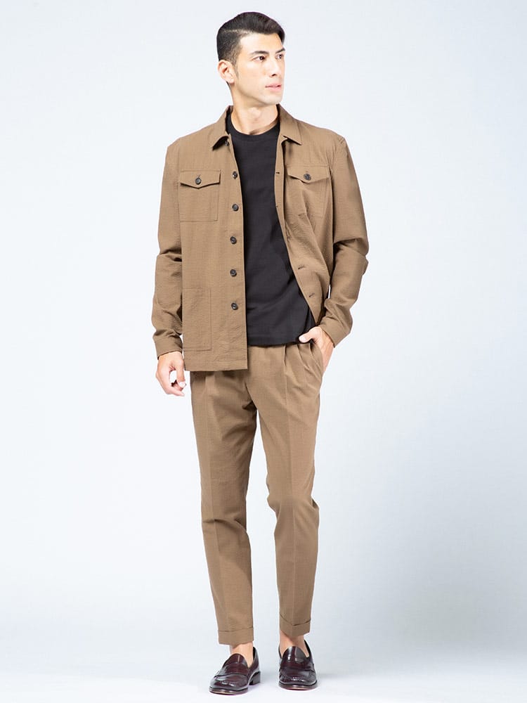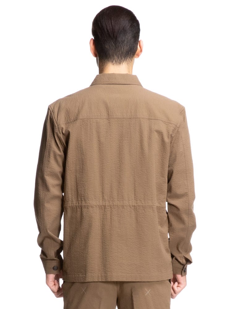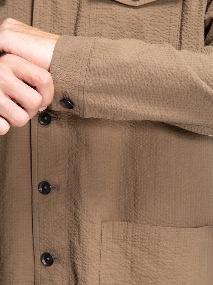清涼感のあるシアサッカー生地で仕上げたカバーオール ジャケットです。軽量でサッと軽く羽織っていただけます。後ろ身頃にドローコード付きでシルエットを変えることが出来ます。裏地なしの薄手の生地で暖かくなる春夏のアウターにおすすめの一着です。