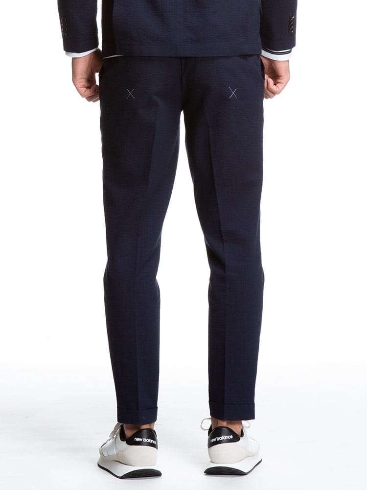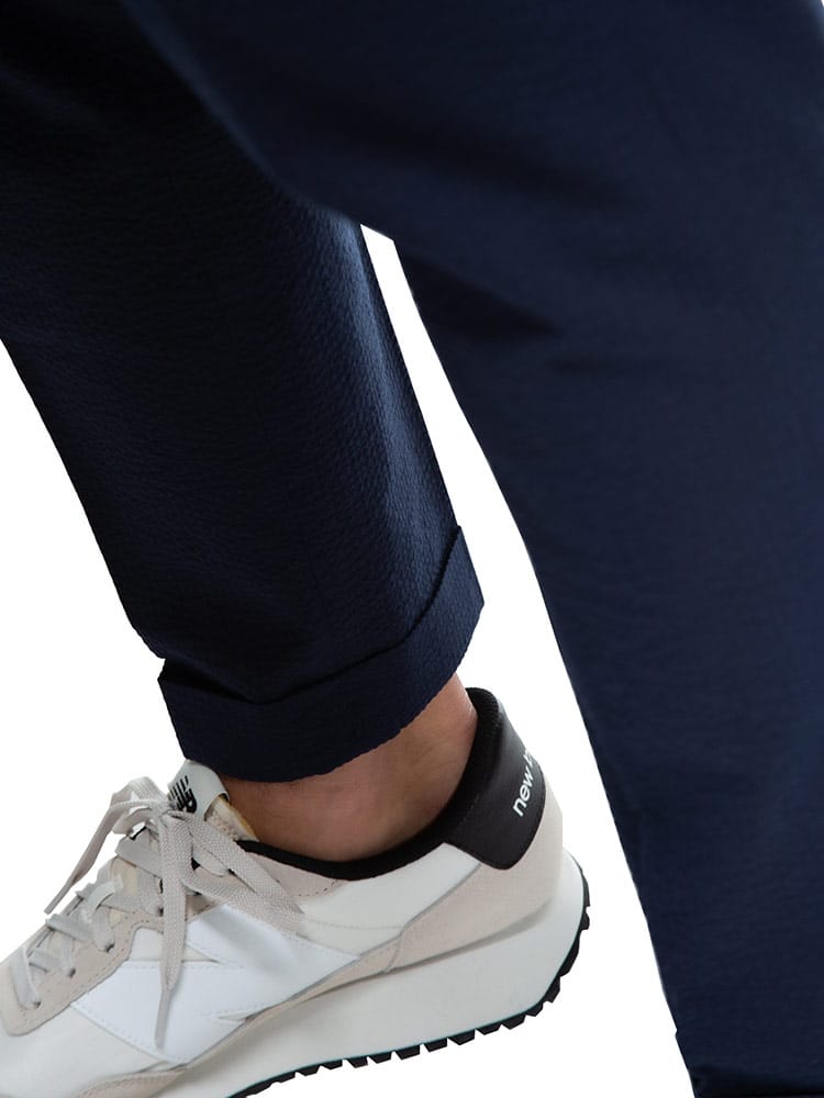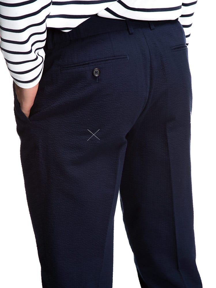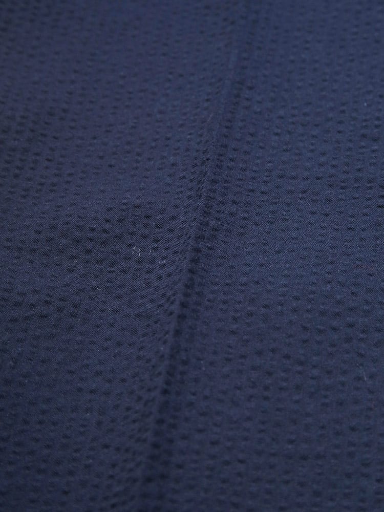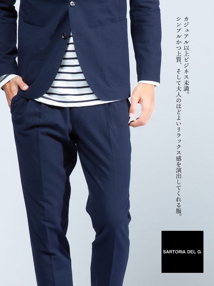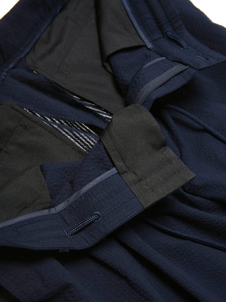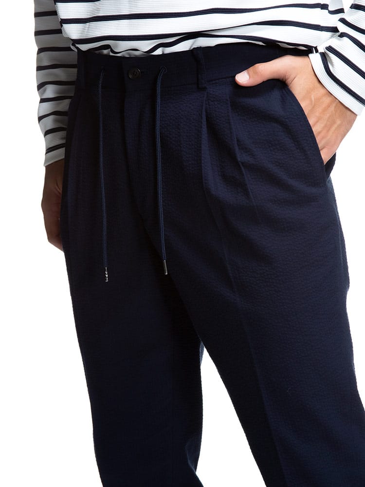 清涼感のあるシアサッカー生地で仕上げたシャーリング ツータック パンツです。ウエストはサイドがギャザーになっており、ドローコードでサイズ調整が出来ます。裾はロールアップデザインでこなれ感を演出します。軽い穿き心地で春夏のスタイリングにおすすめのパンツです。ウエストのドローコードは外側で結ぶ他にも、パンツの内側に引くことで通常のベルトを通してスタイリングすることが可能です。