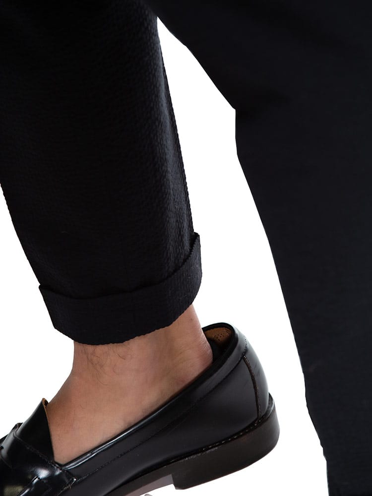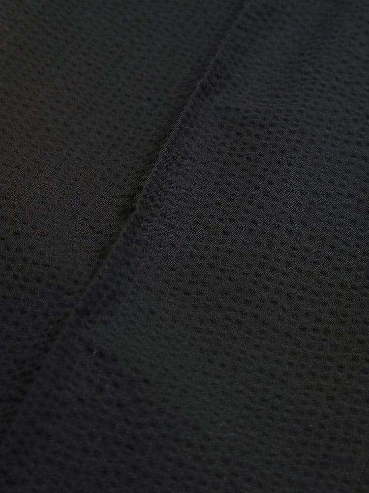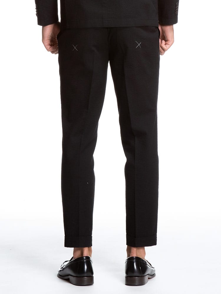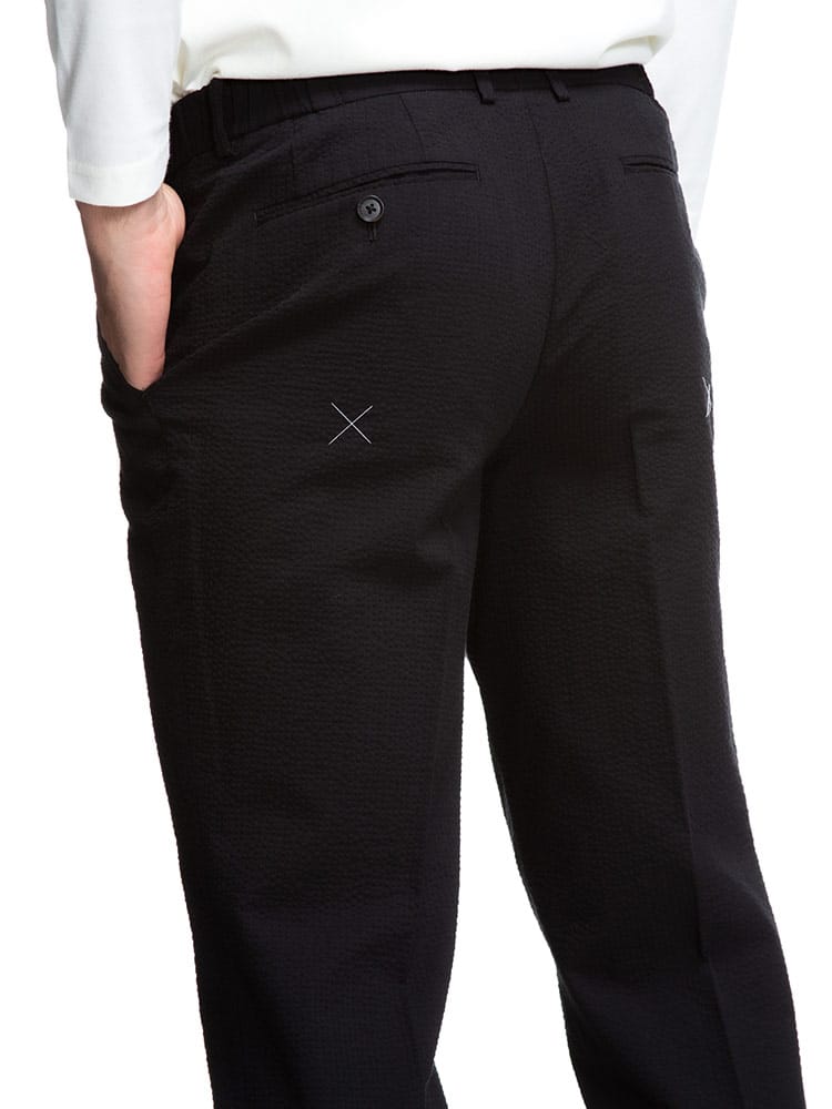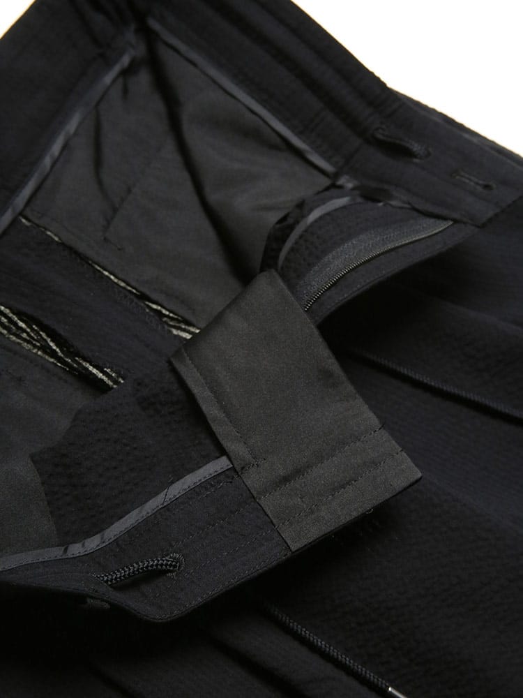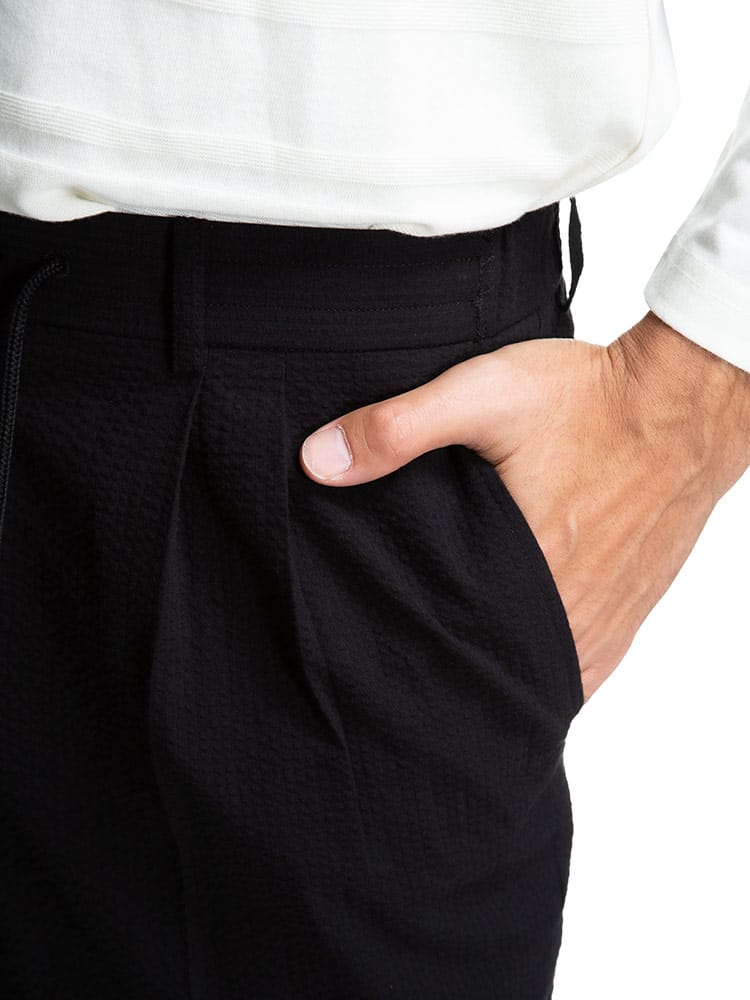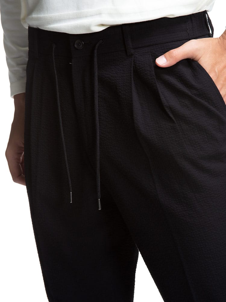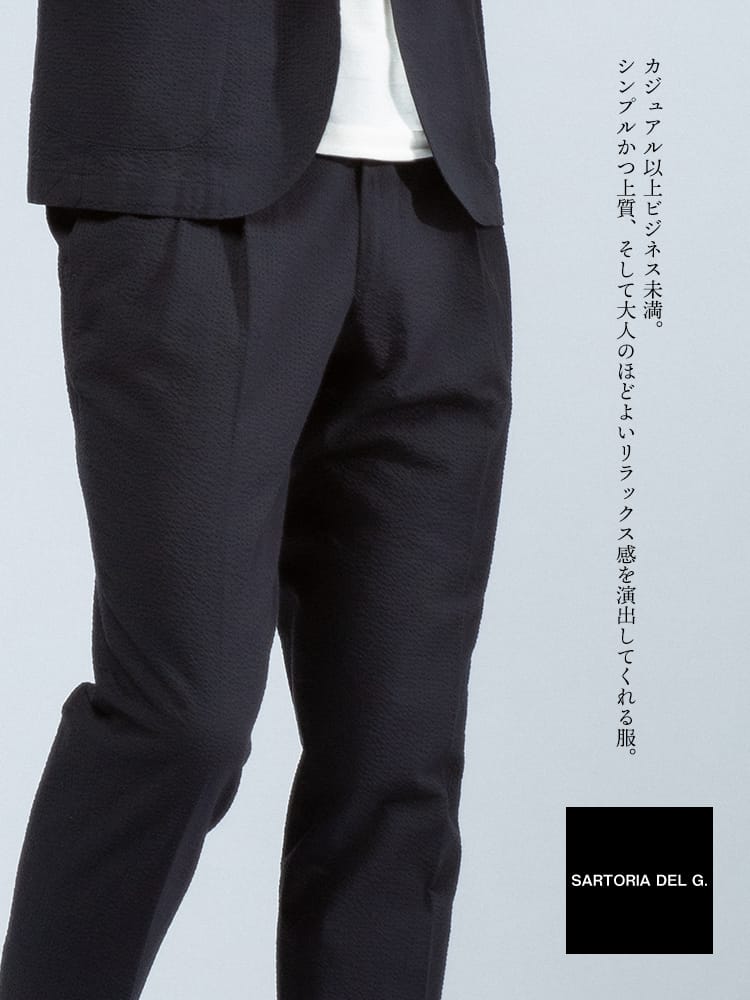 清涼感のあるシアサッカー生地で仕上げたシャーリング ツータック パンツです。ウエストはサイドがギャザーになっており、ドローコードでサイズ調整が出来ます。裾はロールアップデザインでこなれ感を演出します。軽い穿き心地で春夏のスタイリングにおすすめのパンツです。ウエストのドローコードは外側で結ぶ他にも、パンツの内側に引くことで通常のベルトを通してスタイリングすることが可能です。