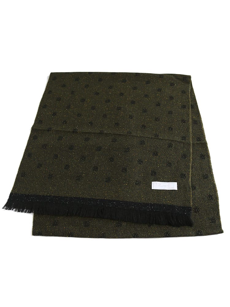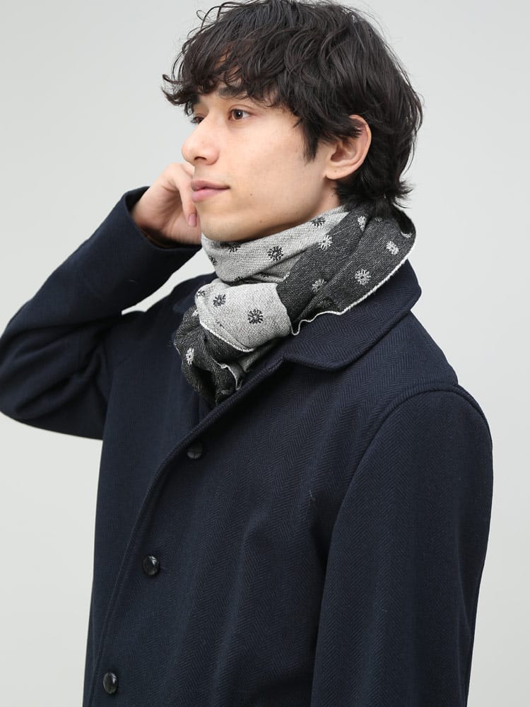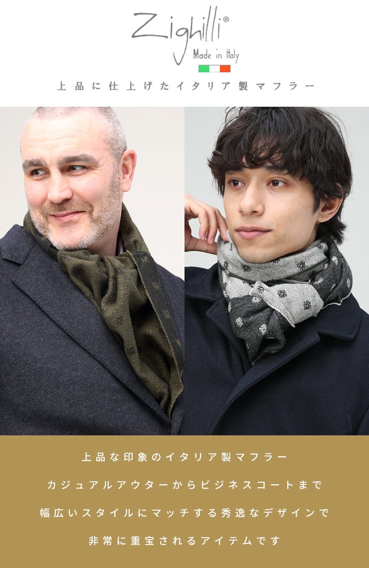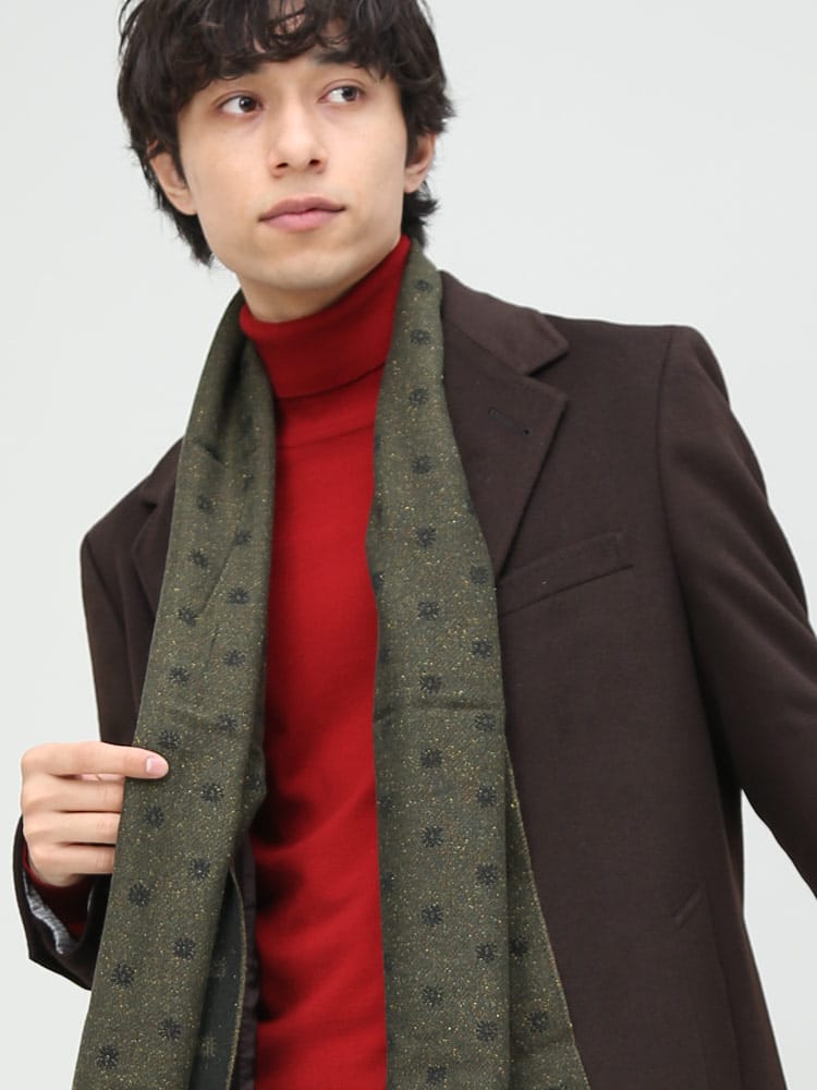MADE IN ITALYの上質感溢れるストールです。クラシカルな総柄はビジネスからフォーマルまで幅広く使えるデザイン。厚手にならないスマートな生地感なので、スーツスタイルからキレイめなジャケットスタイルなどに、コートと組み合わせたアクセントとして活躍してくれるアイテムです。