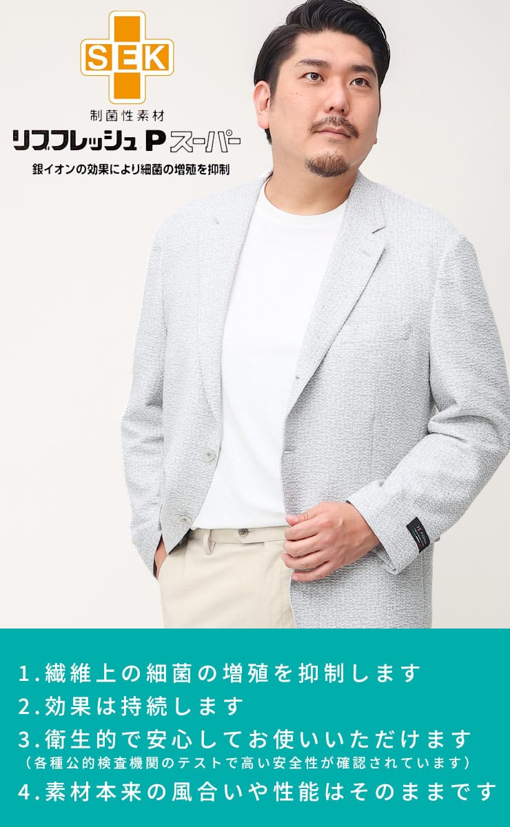 清涼感のある制菌 シングル 段返り3ツ釦 ジャケットです。制菌性素材(銀イオン効果)リフレッシュPスーパーを使用し、清潔に着ていただけます。動きやすいストレッチ性とサイドベンツ仕様。カジュアルスタイルにもぴったりな上品なデザインで様々なパンツと相性抜群で、スラックスと合わせたジャケパンスタイルにもおすすめです。