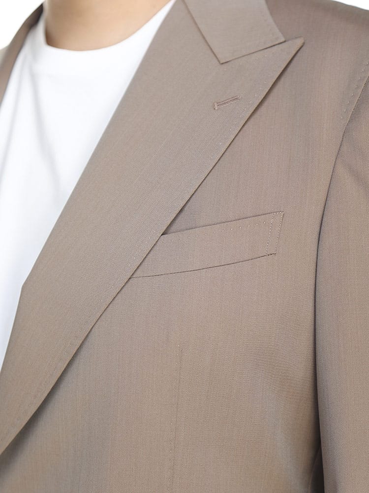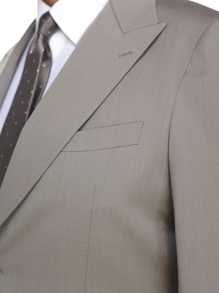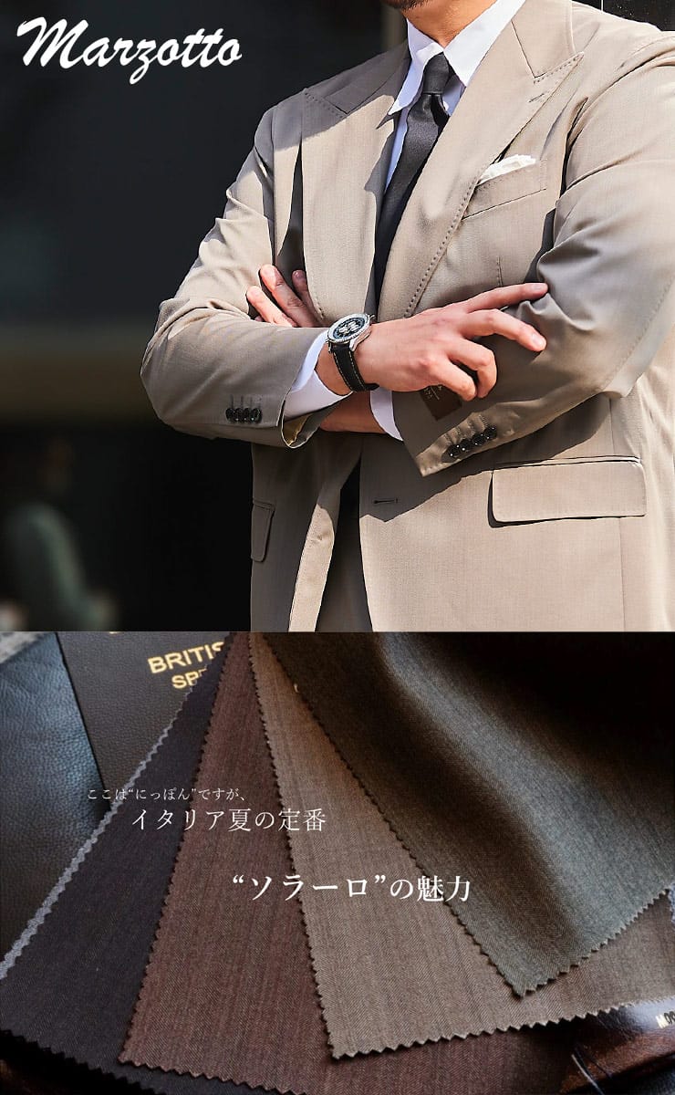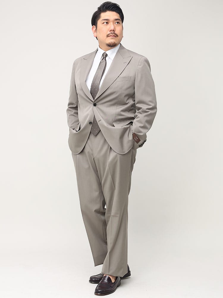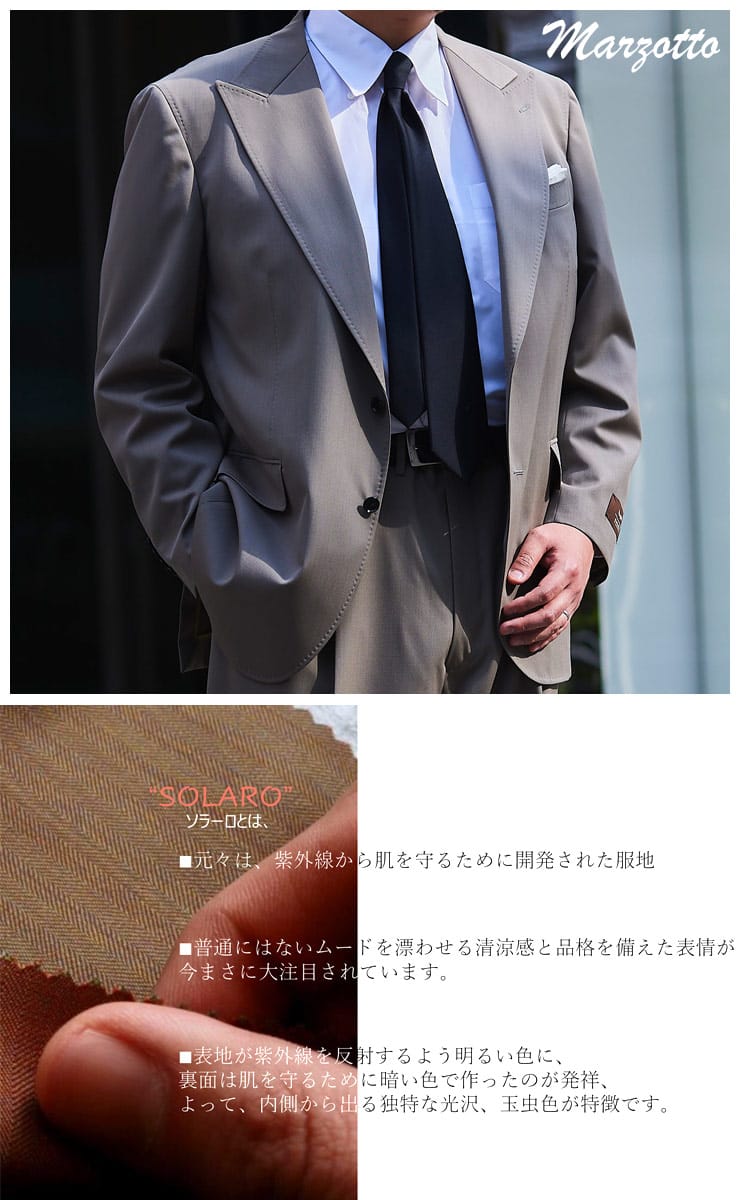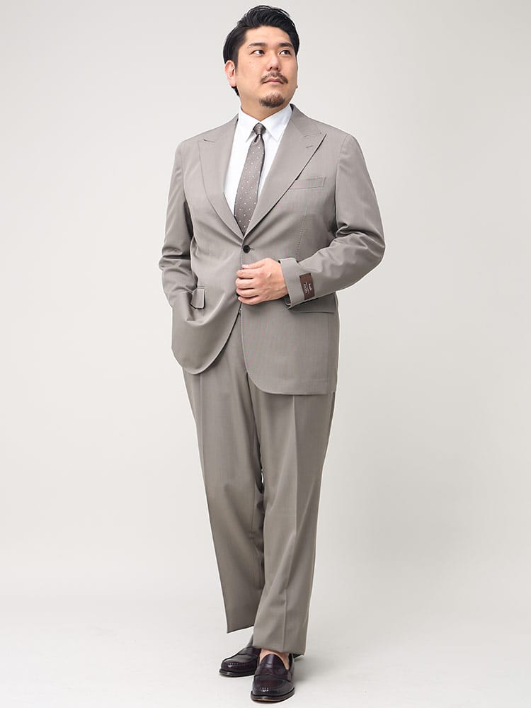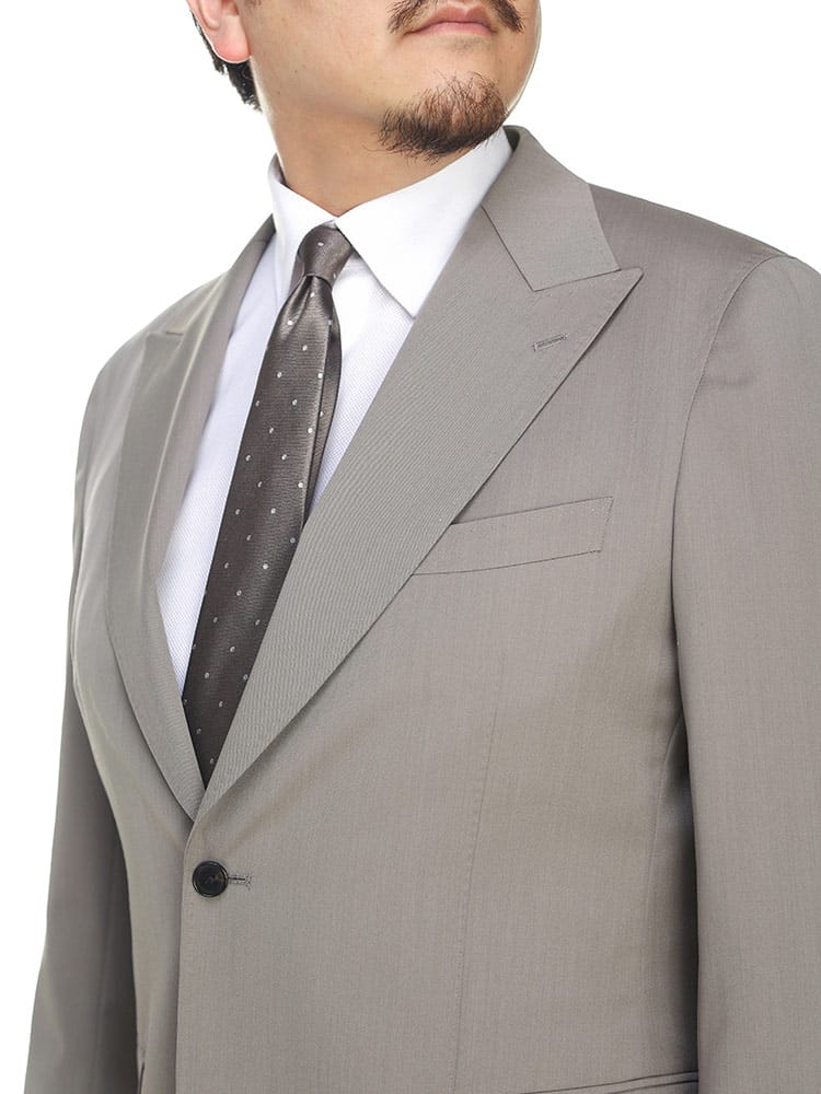 クラシカルなシルエットの無地 ピークドラペル シングル 2ツ釦 スーツです。ドレッシーなピークドラペルの襟元と特徴的なステッチラインが、ビジネスシーンだけでなくプライベートシーンにも対応してくれるオシャレなデザイン。イタリアのMarzotto(マルゾット)の生地を使用した上品な質感のスーツ。