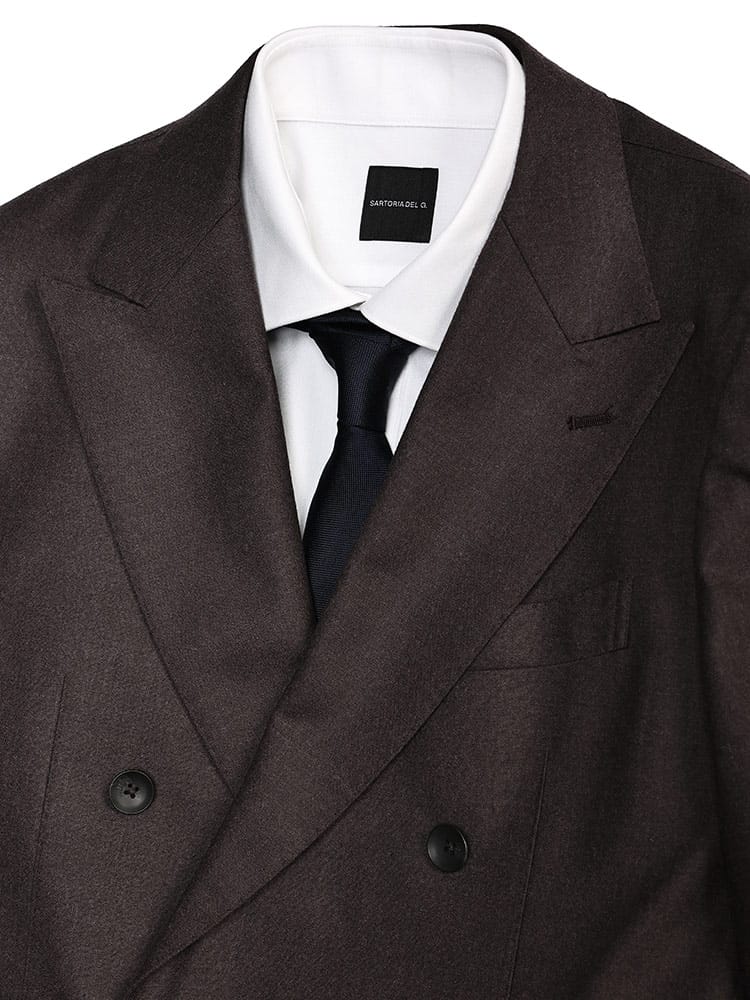 このスーツは、イタリア製の高級ウール生地を使用しており、ビジネスシーンに最適なクラシックでスタイリッシュなデザインを特徴としています。ダブルブレストの6つボタン仕立てで、3つのポケットと2つのタックを備え、洗練された印象を与えます。上質な素材と細部へのこだわりが、長時間の着用でも快適さを保ちつつ、プロフェッショナルなルックを演出します。