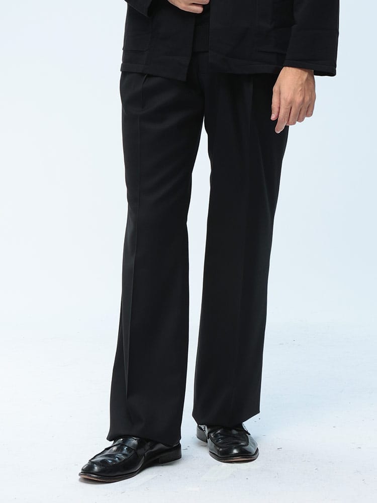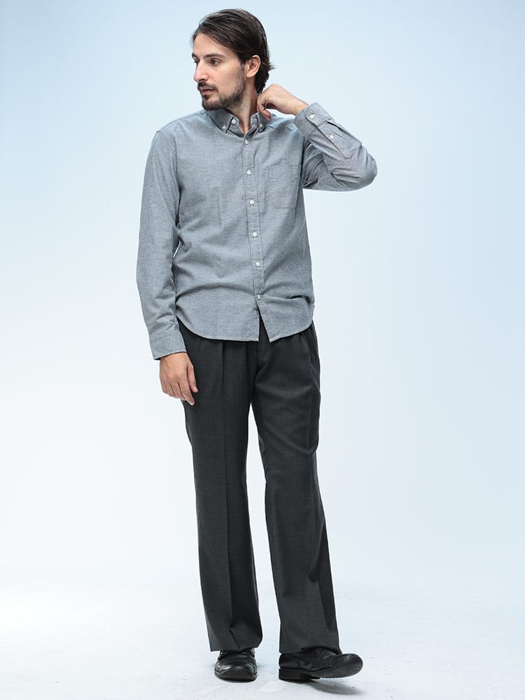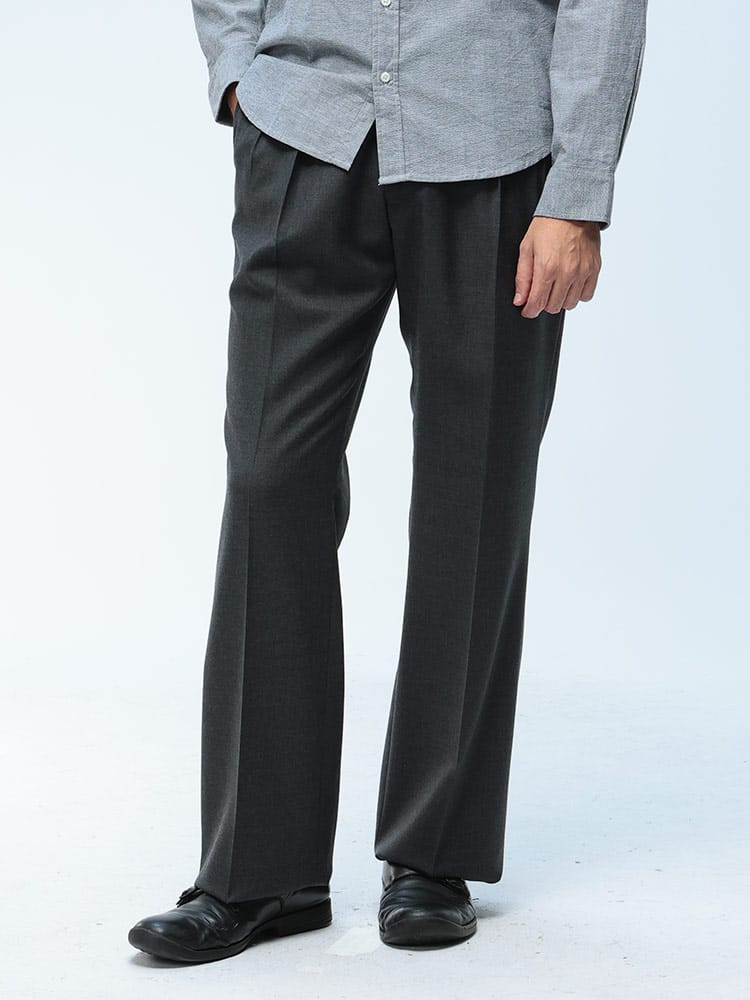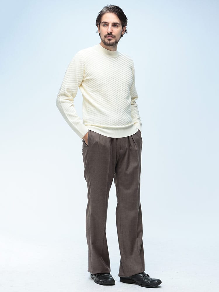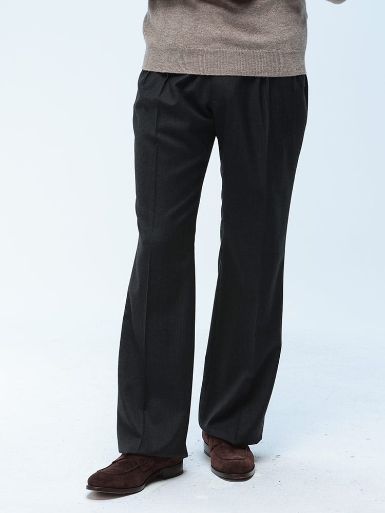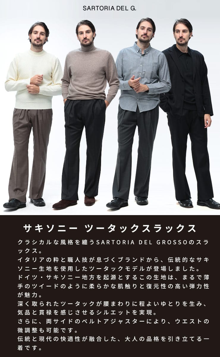 クラシカルな風格を纏う「SARTORIA DEL GROSSO」スラックス。イタリアの粋を感じさせるSARTORIA DEL GROSSOから、伝統的なサキソニー生地を使用したツータックスラックスが登場。ドイツ・サクソニー地方が起源とされるこの生地は、まるで薄いツイードのような柔らかな肌触りと、復元性の高い弾力性が魅力。ウールにポリエステルとポリウレタンを混紡することで、クラシックな見た目ながらもシワになりにくく、快適な伸縮性を実現しました。深く入ったツータックは、腰周りにゆとりを持たせ、クラシカルで貫禄のあるシルエットを演出。さらに両サイドのベルトアジャスターでウエストの微調整も可能です。洗練された大人のための、風格あるビジネスパンツです。