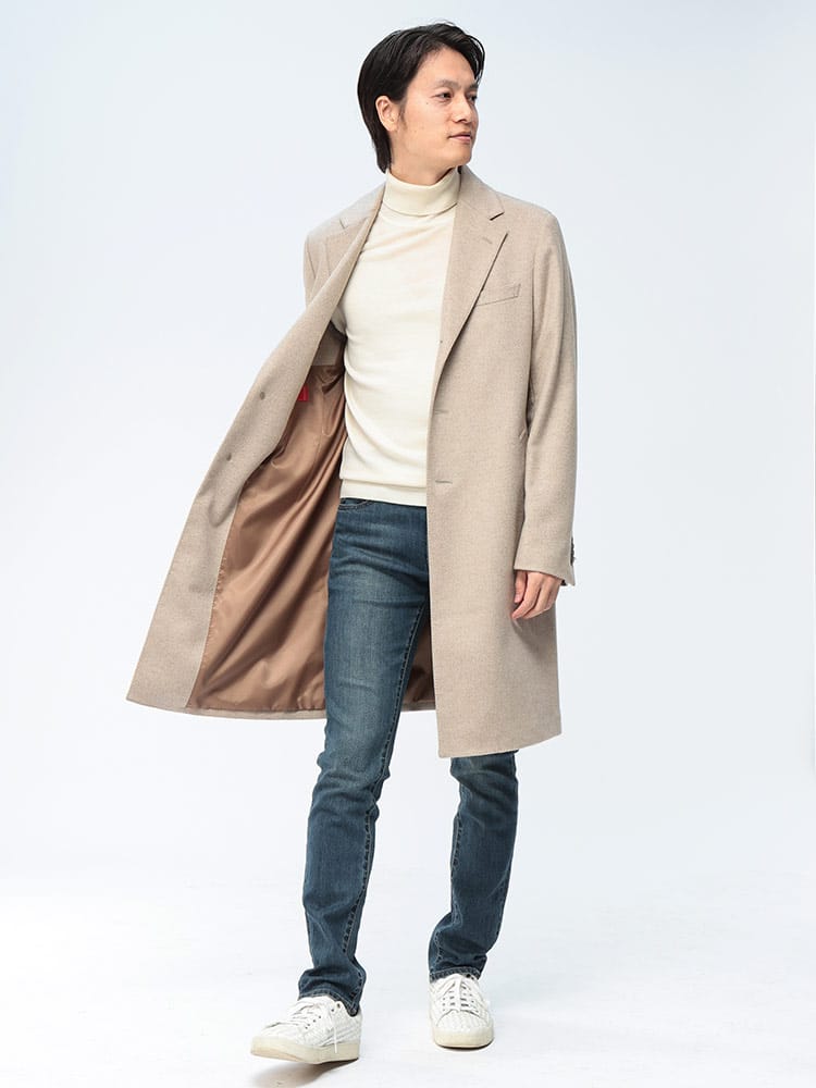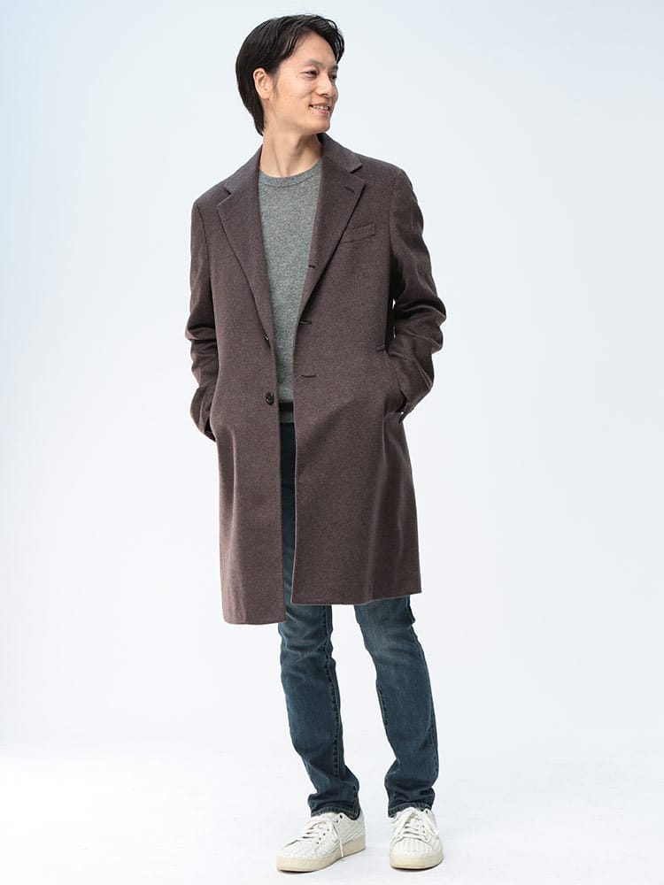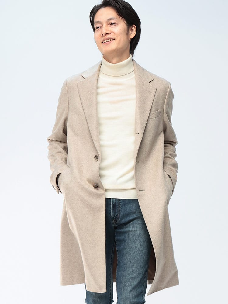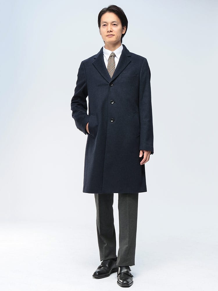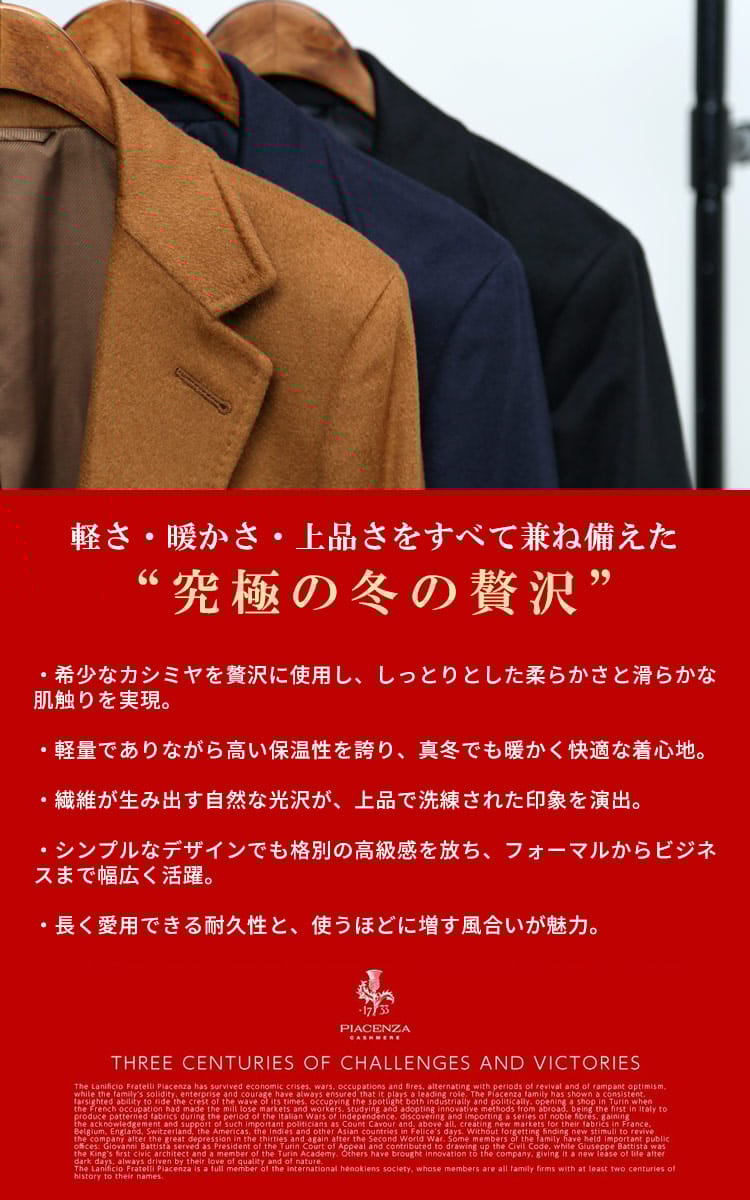 纏う贅沢。極上カシミヤで魅せる大人の品格。イタリアの老舗生地メーカーPIACENZA(ピアチェンツァ)のカシミヤ100%を贅沢に使用した、COLLEZIONEのシングルチェスターコート。触れた瞬間にわかる滑らかな肌触りと、カシミヤならではの圧倒的な保温性が、本格的な冬をエレガントに彩ります。ビジネスのスーツスタイルから、格式高いフォーマルシーンまで対応する洗練されたシルエット。この一着が、貴方の冬の装いを格上げし、揺るぎない自信を与えてくれるでしょう。本物を知る紳士のための、生涯愛せるアウターです。