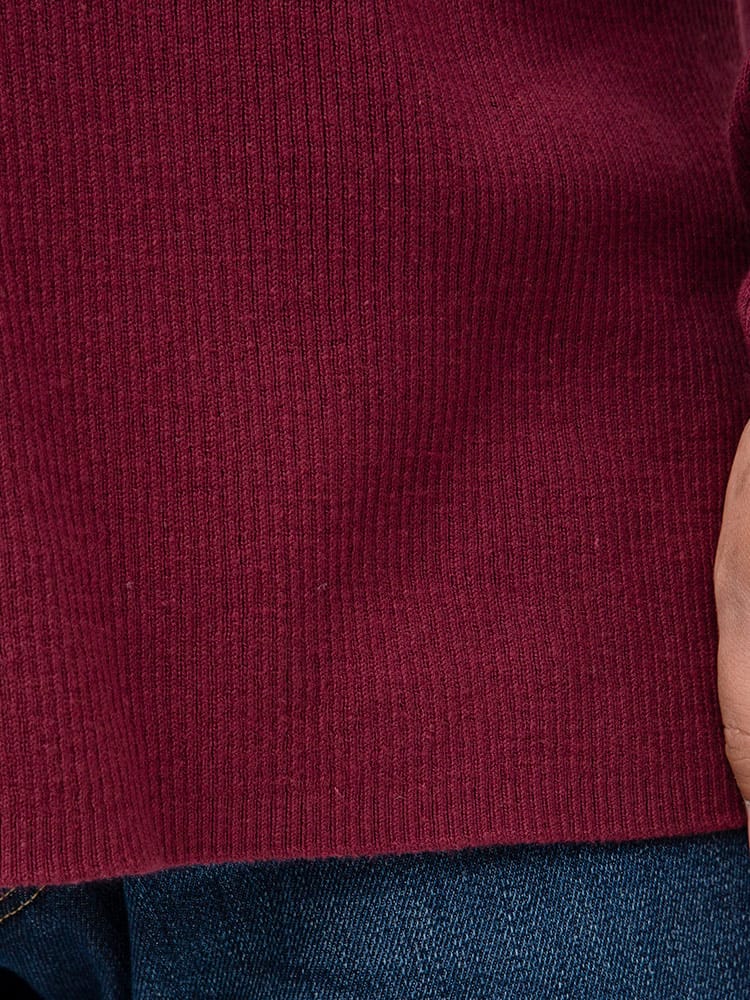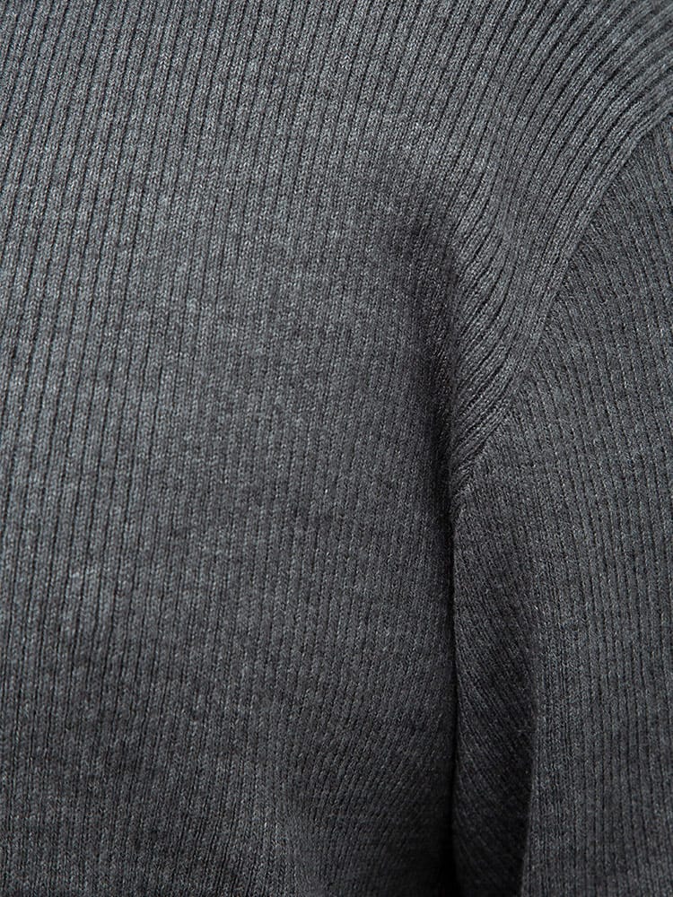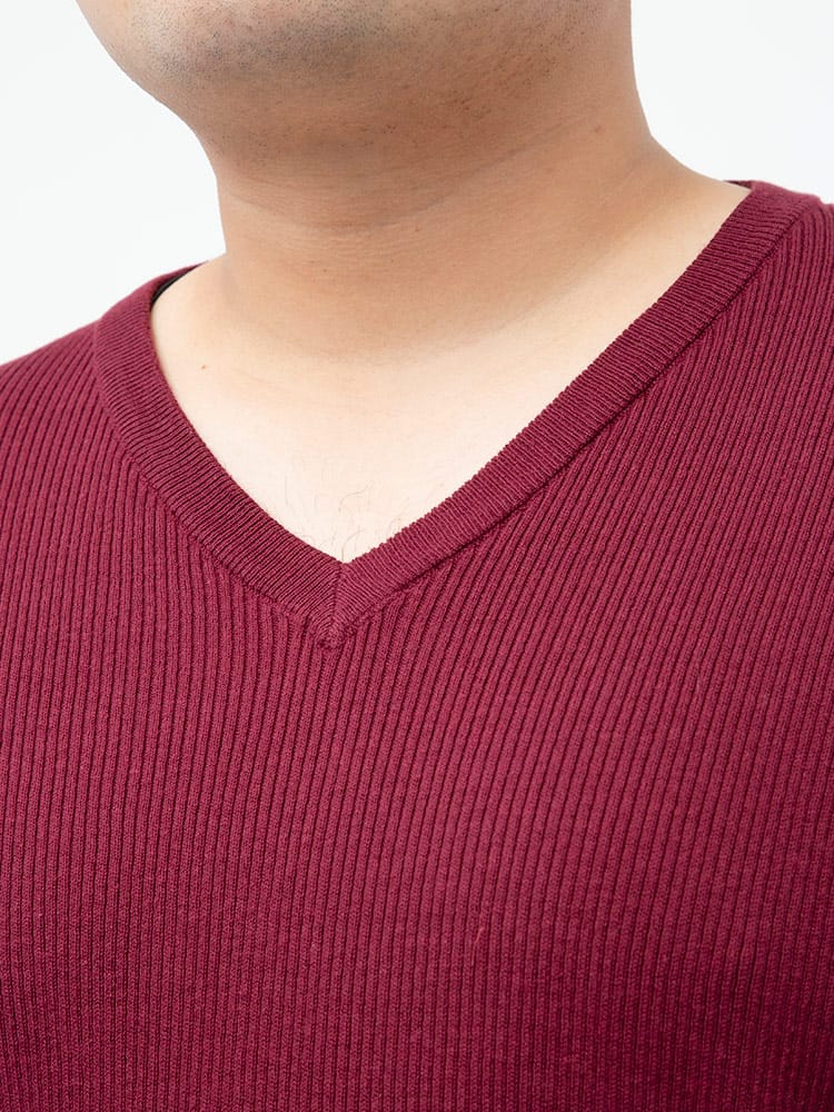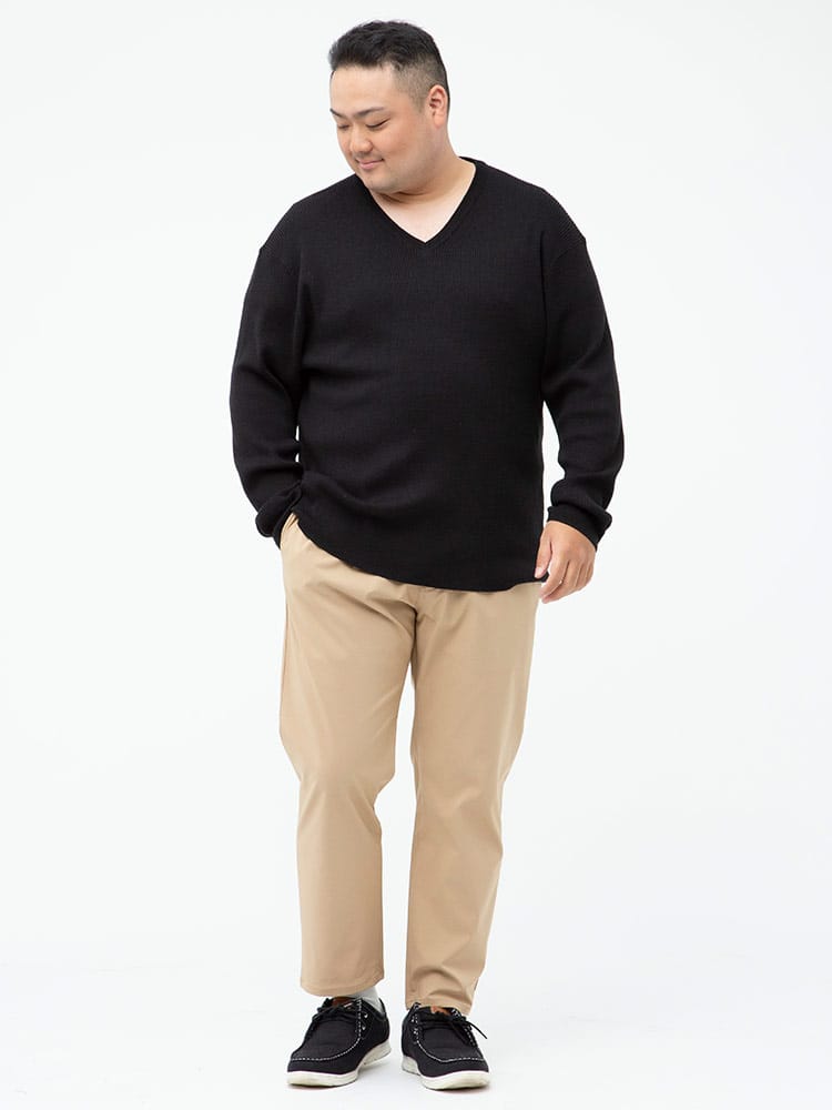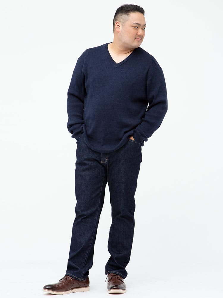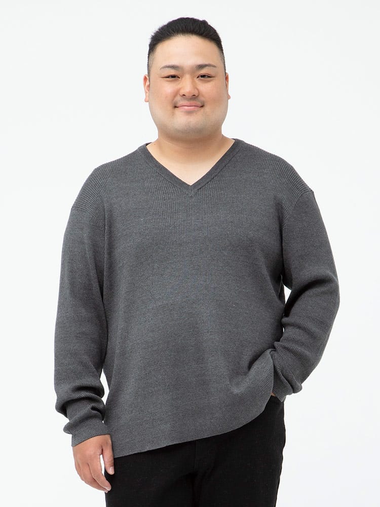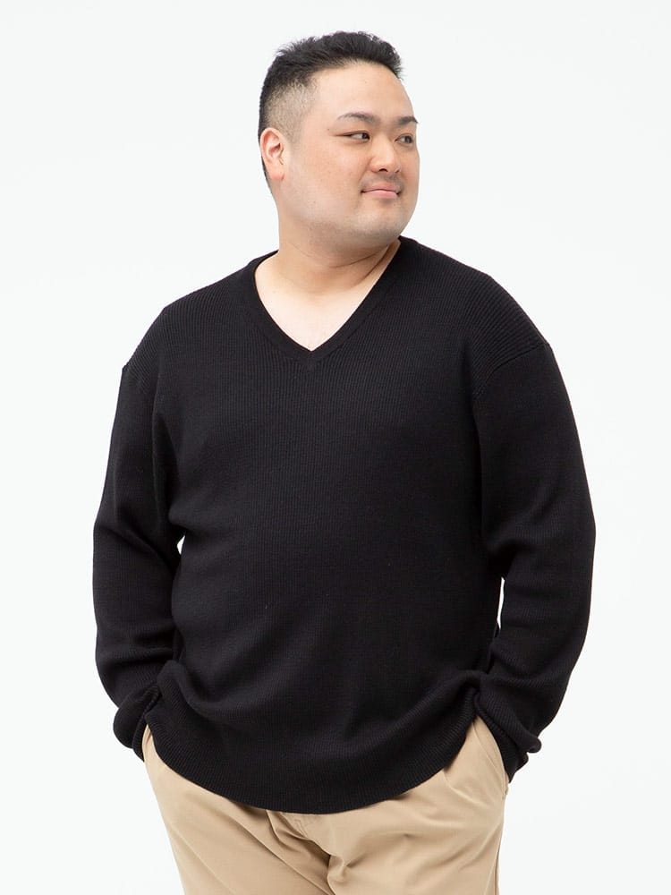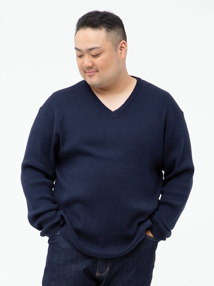 綿混のリブ編みのVネック 長袖 セーターです。無地のシンプルデザインで大人のカジュアルスタイルにおすすめです。首元はスッキリとした印象のVネックデザイン。ベーシックデザインでどんなスタイルにもマッチします。