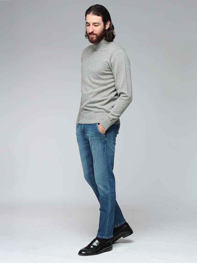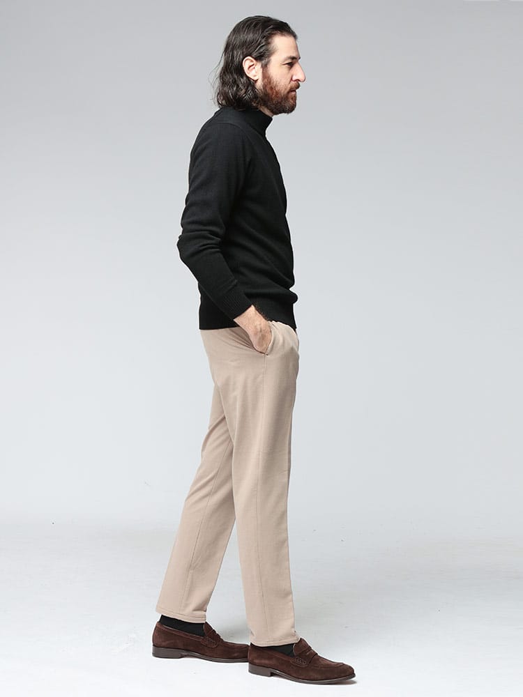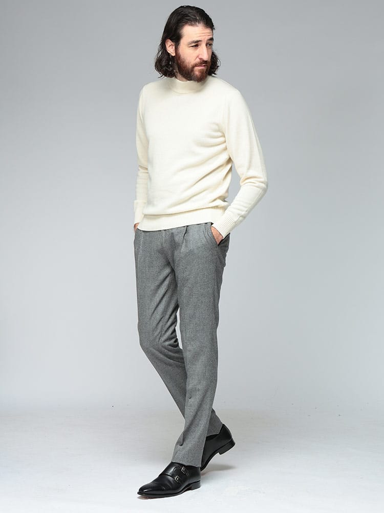 カシミヤ100%の贅沢なモックネックニット。軽くて暖かく、柔らかな肌触りと上品な光沢が魅力です。程よい高さのモックネックが顔周りをすっきりと見せ、一枚で着ても、ジャケットやコートのインナーとしてもエレガントな着こなしを叶えます。長く愛用できる上質なベーシックアイテムです。