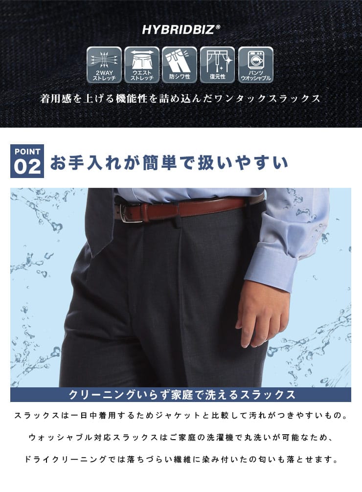 すっきりとしたシルエットが魅力的なHYBRIDBIZ「ハイブリッドビズ」のワンタック チェック柄 スラックスが登場。素材には上品な印象のウール混を使用しました。品のあるがスタイリッシュな印象を与えてくれます。無地で合わせやすいデザインだから、お手持ちのジャケットと合わせてジャケパンスタイルもお楽しみいただけます。