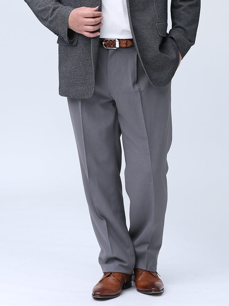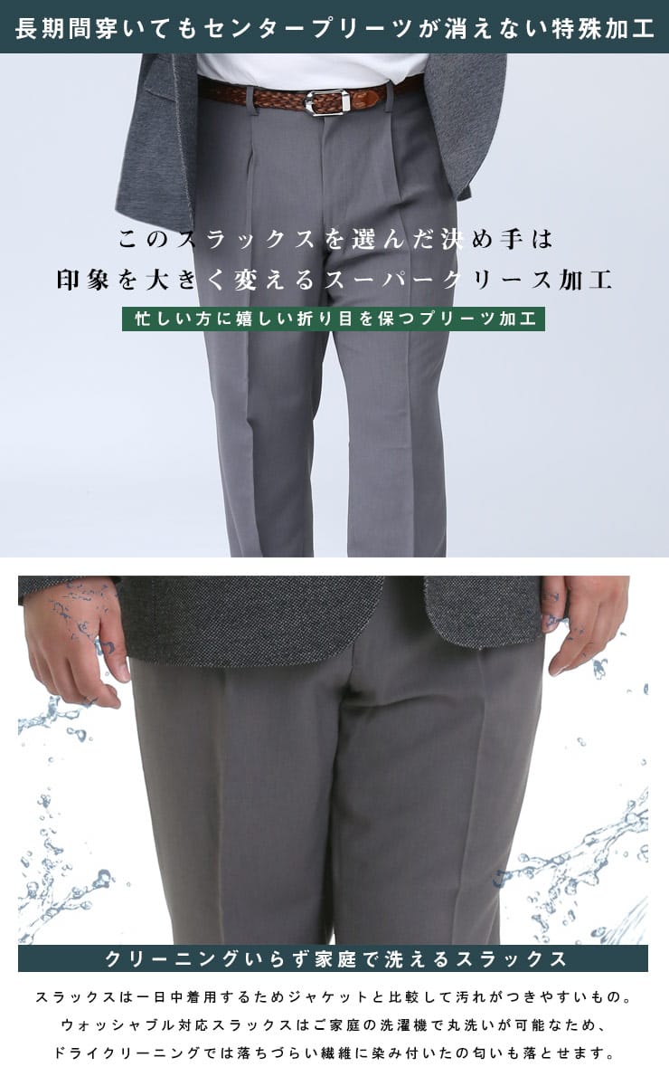 すっきりとしたシルエットが魅力的なHYBRIDBIZ「ハイブリッドビズ」のワンタックスラックスです。洗練された印象でスタイリッシュに穿いていただけるアイテム。生地の構造はSupercrease仕様。現代の忙しい生活様式に向けて企画されたSupercreaseは、独特なパーマネント加工のヒダを生地に与えます。洋服の耐久性に合わせて形作るヒダは、安定感がある自然な最初のプレス状態を保ちます。洗濯やドライクリーニングまた日常的な擦り切れに耐える構造です。ご家庭でお手軽にお手入れが出来るウォッシャブル機能付き。使いやすいシンプルデザインで、お手持ちのジャケットと合わせてジャケパンスタイルもお楽しみいただけます。