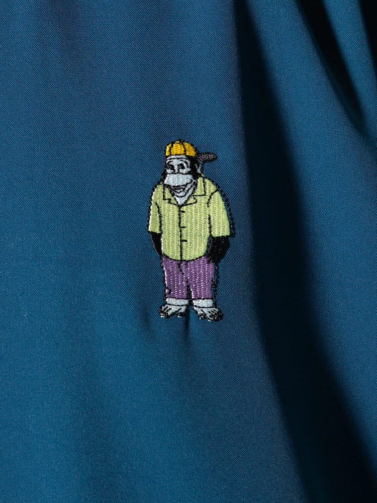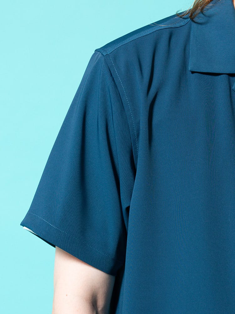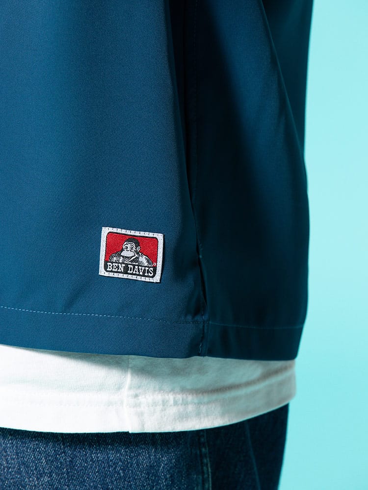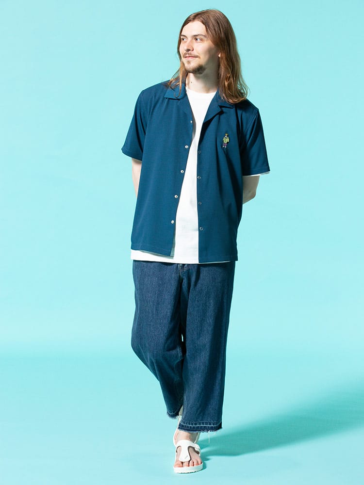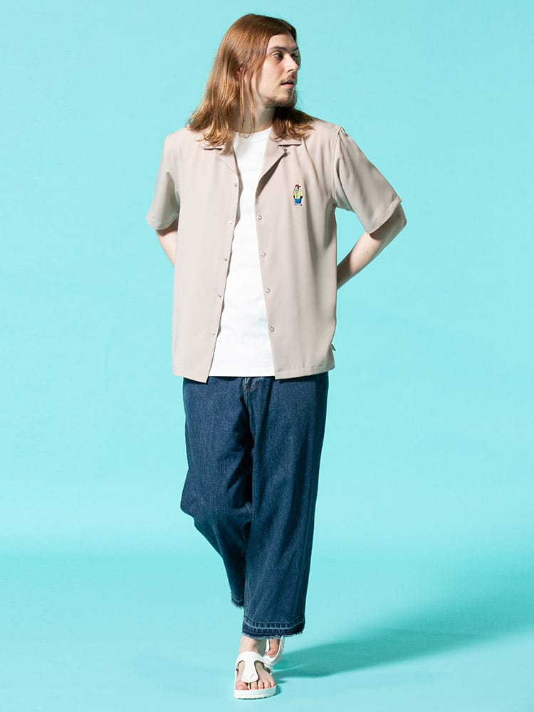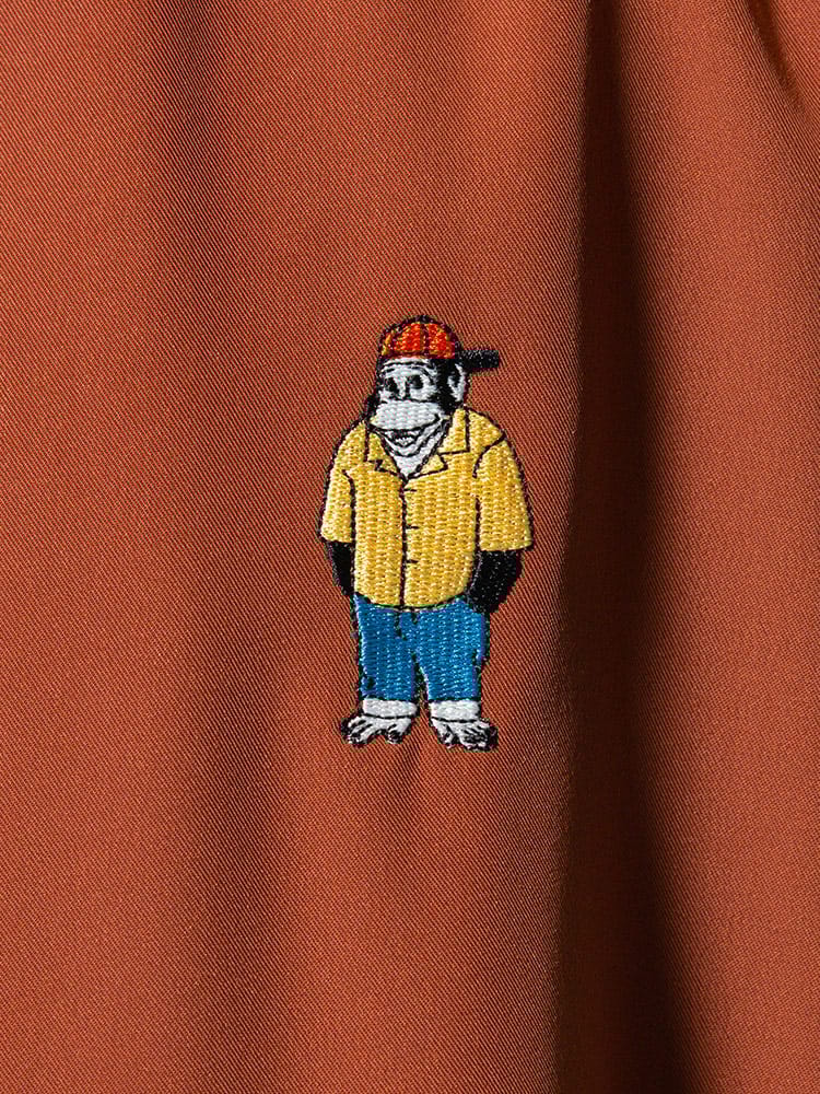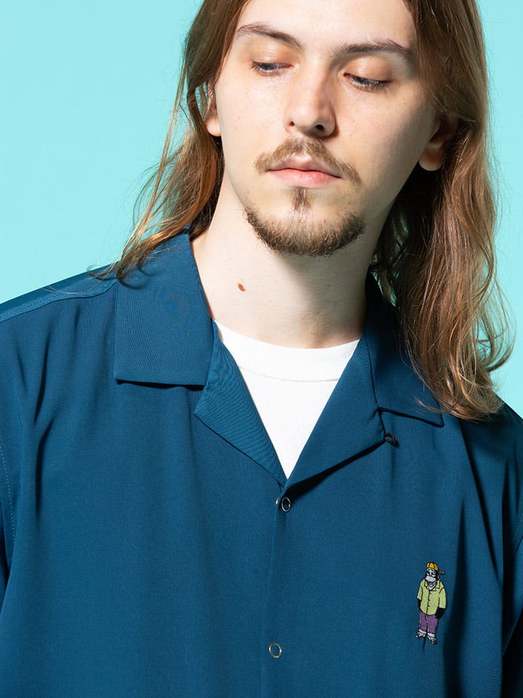 アイコンのゴリラ刺繍を左胸にあしらったBEN DAVISのワンポイント オープンカラー 半袖 シャツ。フロント左裾にゴリラタグ。首元はこなれた印象のオープンカラー。テロっとした生地感でどこか涼し気な着用感です。裾サイドにスリット入り。フロントはスナップボタンで開閉出来ます。