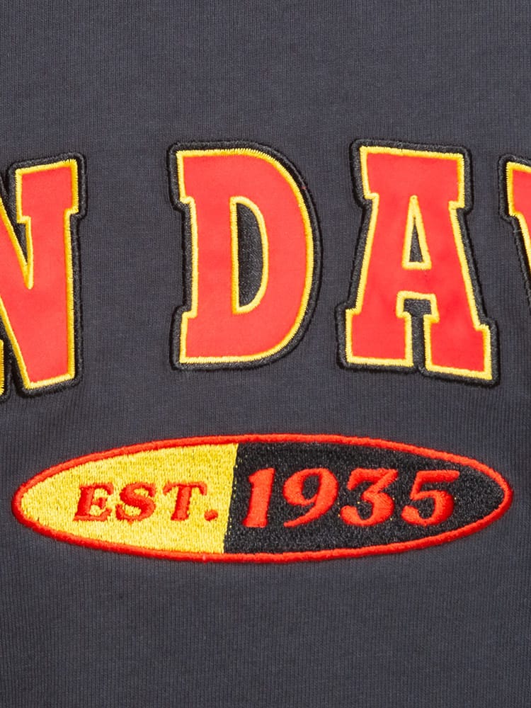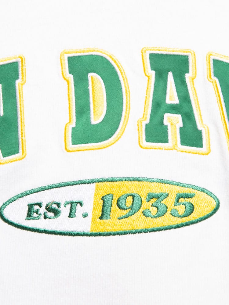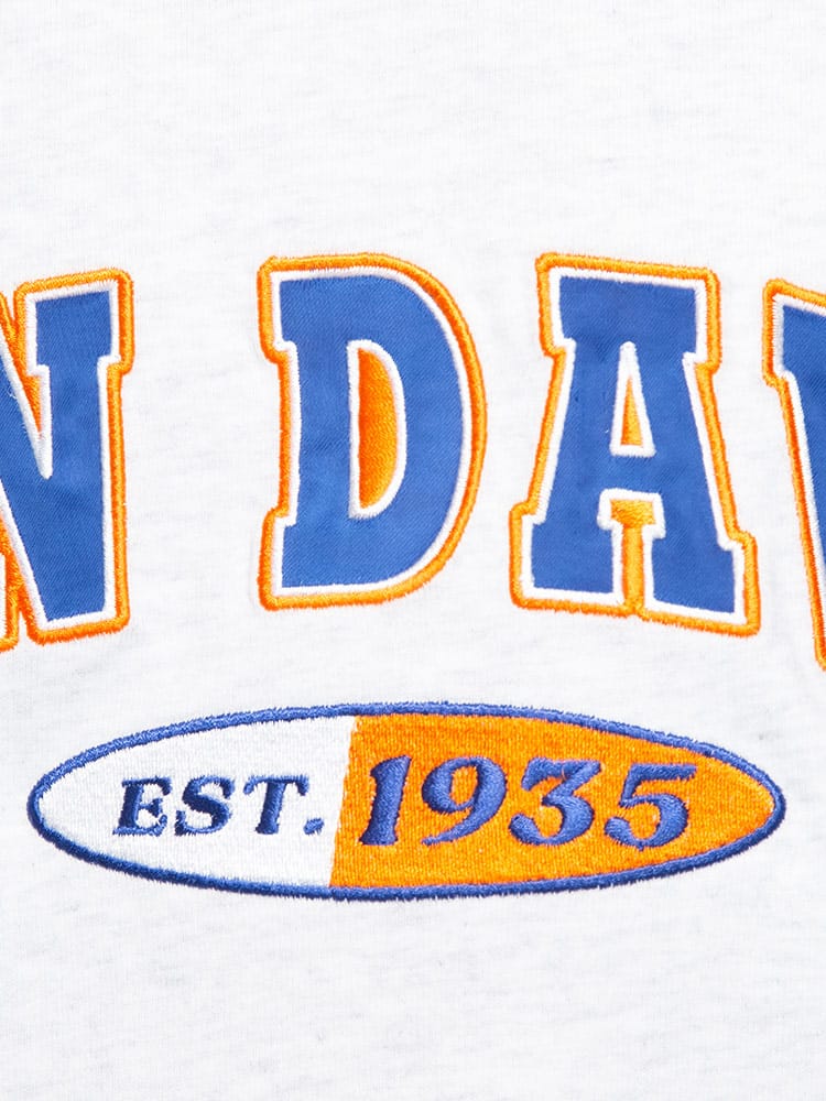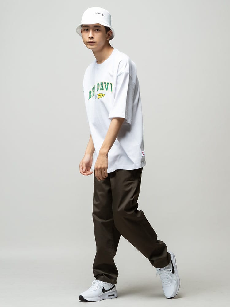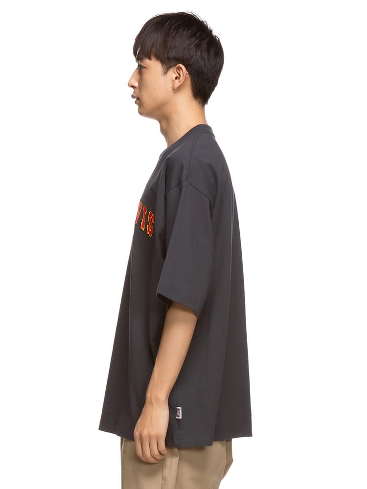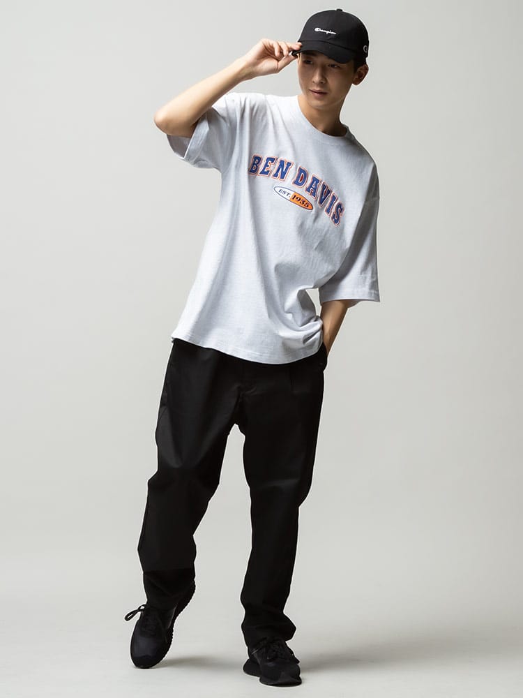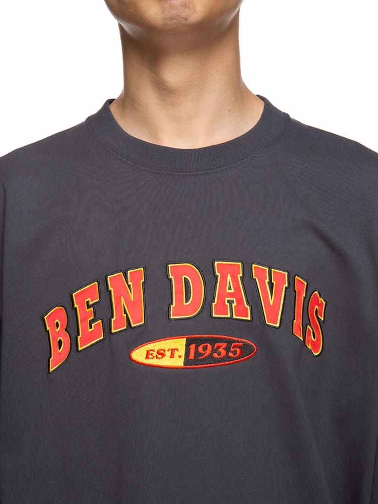 ベースボールチーム風ロゴをサテン地ワッペンでデザインした、BEN DAVISのクルーネック 半袖 Tシャツ STADIUM TEE 2。トレンドのオーバーサイズシルエット。袖は肘くらいまであるのでストリートな着こなしにおすすめのアイテム。首元はベーシックなクルーネックデザイン。左裾にブランドタグ付き。生地には、肌触りの良いコットン生地を使用しています。