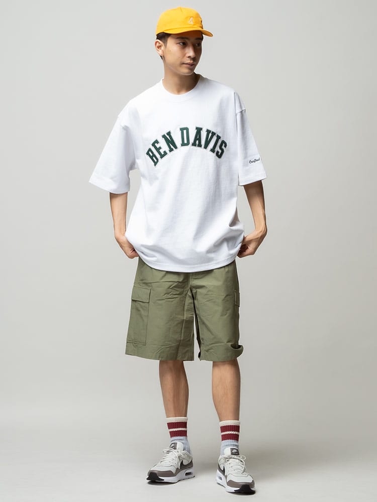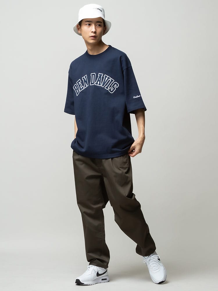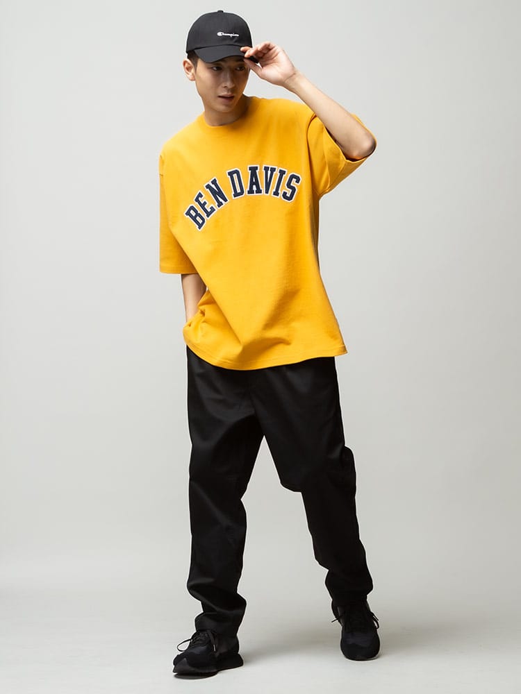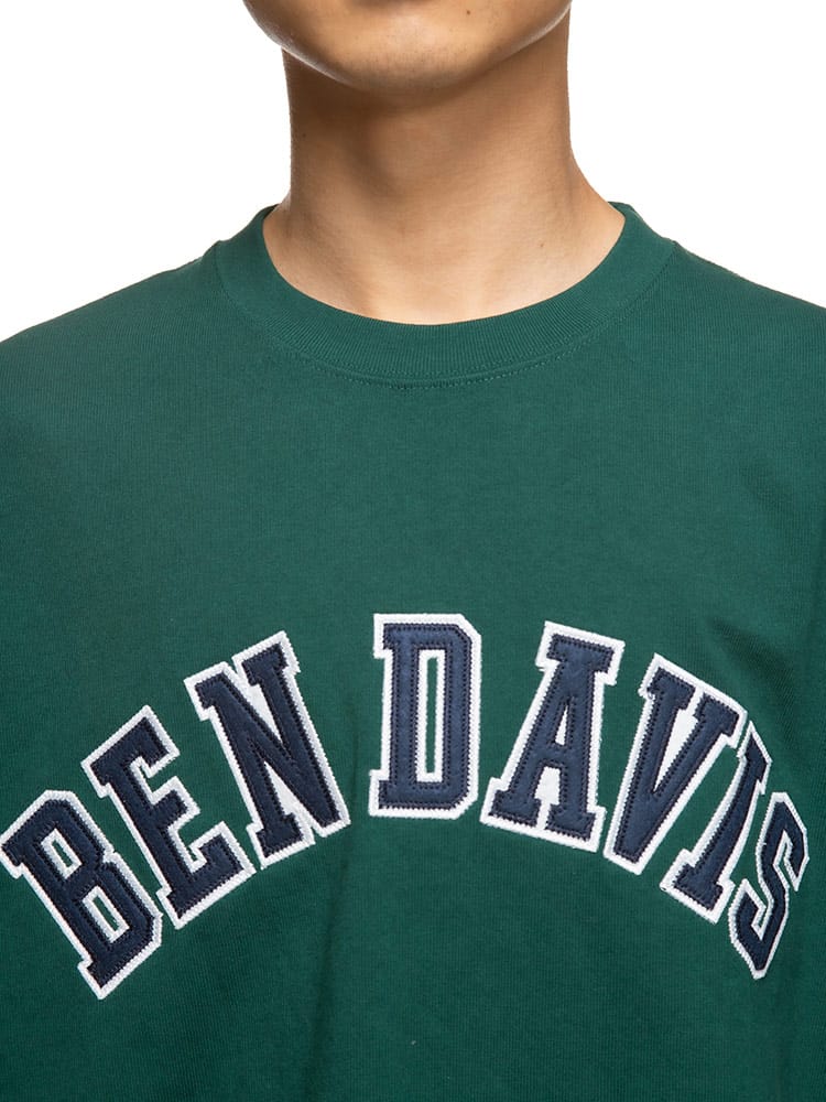 立体的なカレッジロゴ刺繍が雰囲気抜群なBEN DAVISのクルーネック 半袖 Tシャツ COLLEGE LOGO UH TEE。左袖のロゴ刺繍もポイント。トレンドのオーバーサイズシルエット。袖は肘くらいまであるのでストリートな着こなしにおすすめのアイテム。首元はベーシックなクルーネックデザイン。左裾にブランドタグ付き。生地には、しっかりとしたコットン生地を使用し、ガシガシ着ていただけます。