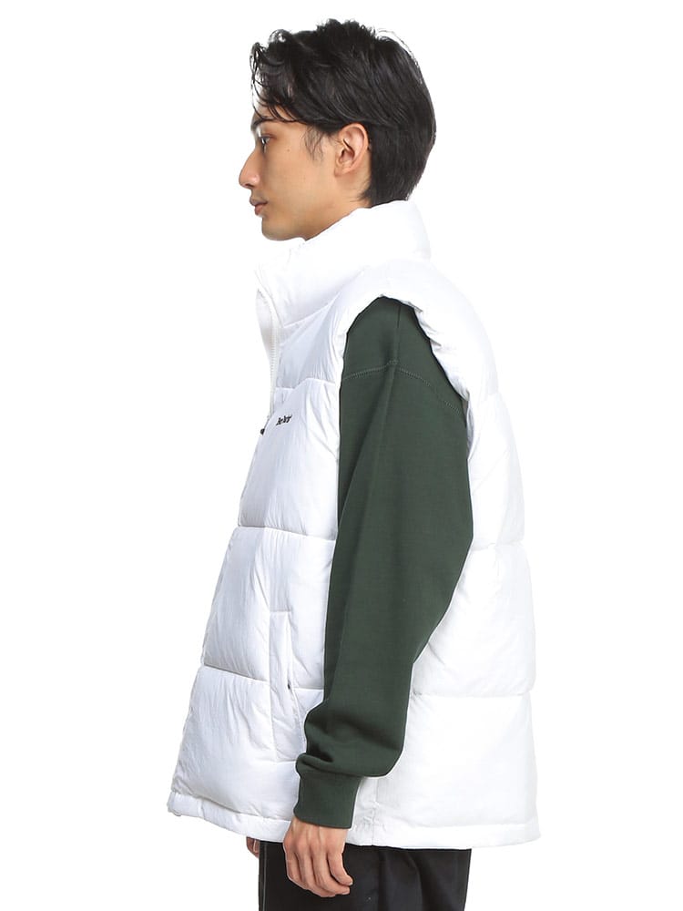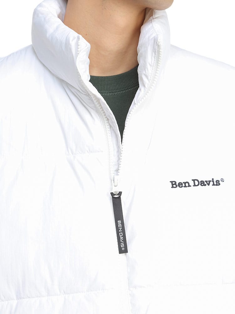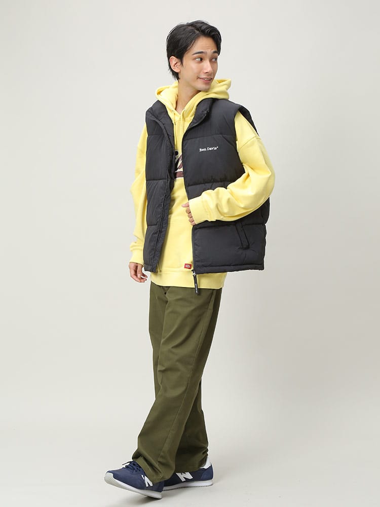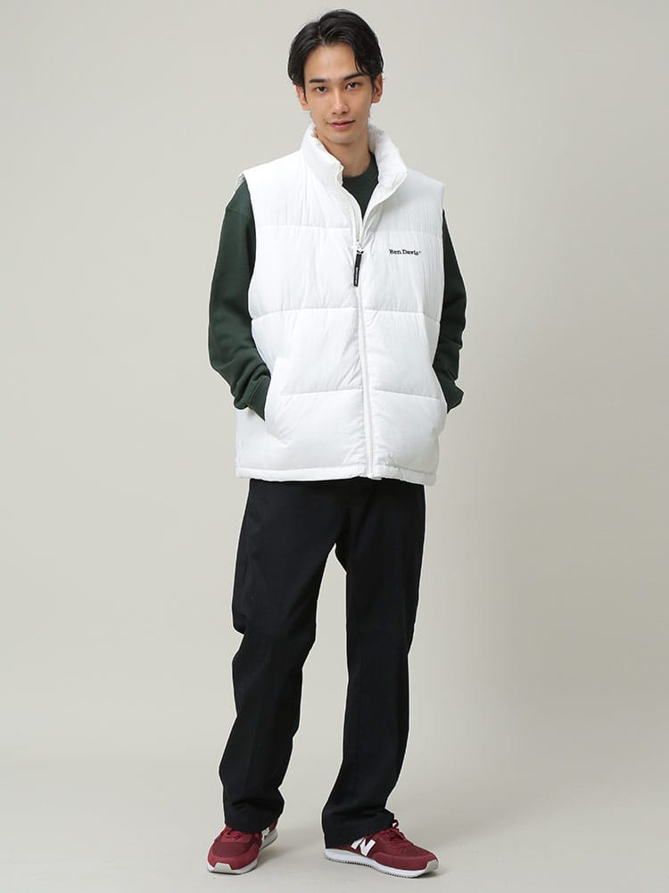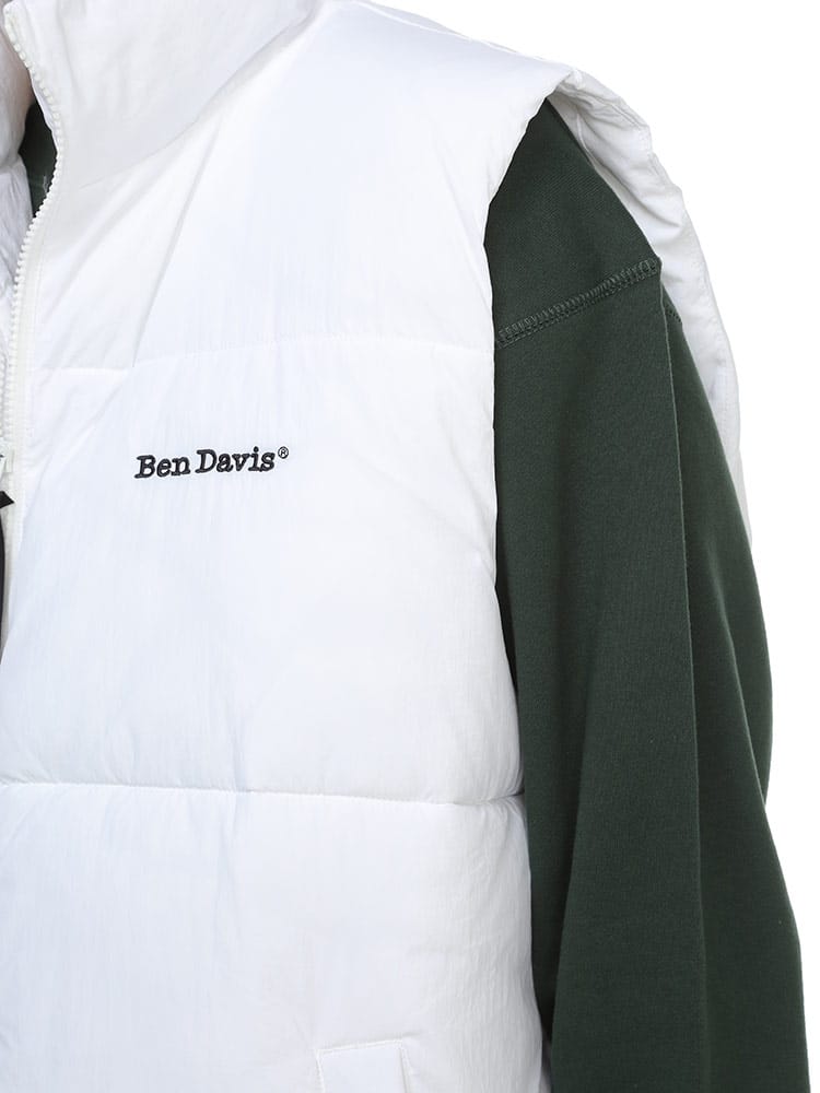 BEN DAVISの中綿ベストです。胸に入ったロゴ刺繍がワンポイント。表地はマットな質感で派手になりすぎない落ち着いたビジュアル。ロングTシャツやネルシャツなどと相性ばっちりなので、秋から冬まで様々なコーディネートが楽しめる一着です。