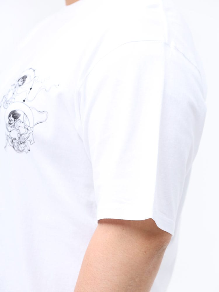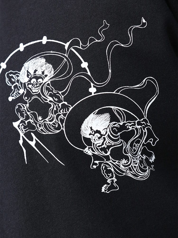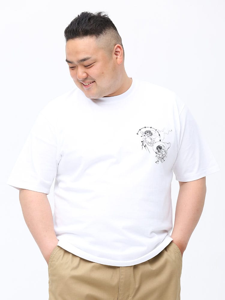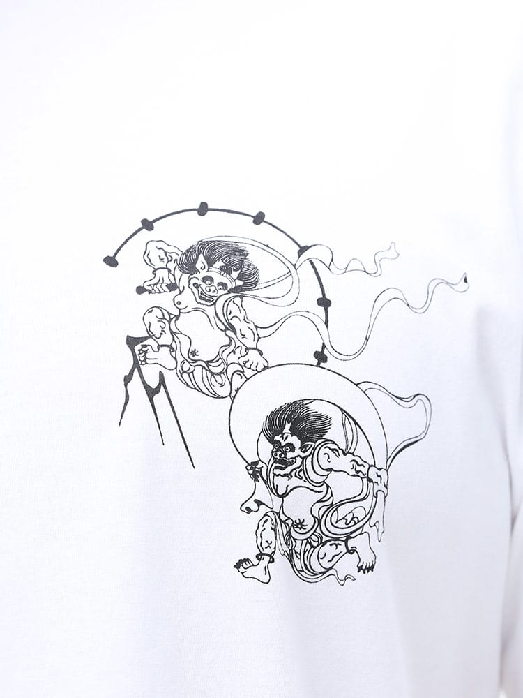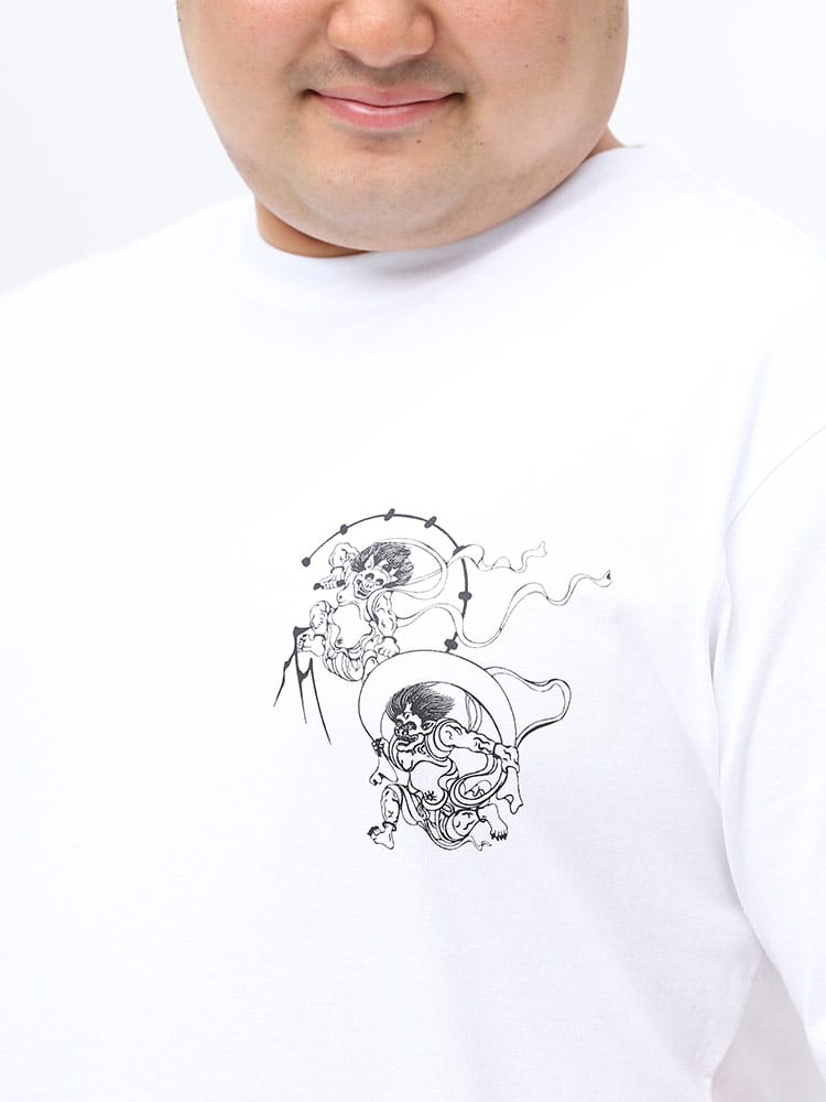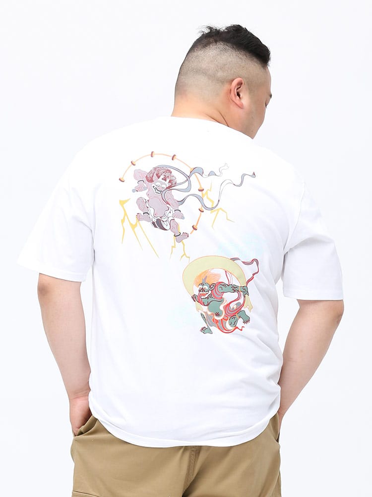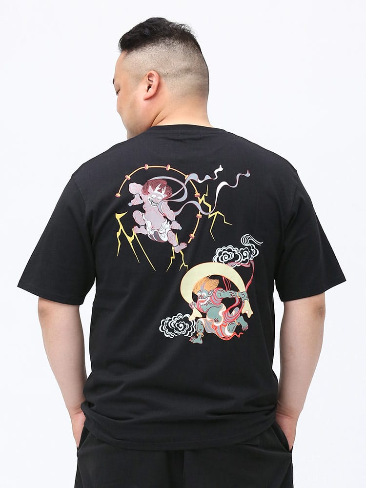 風神雷神の和柄プリントが特徴的なクルーネック 半袖 Tシャツです。バックの風神雷神プリントが目を引くデザイン。首元はベーシックなクルーネック。肌触りの良いコットン生地を使用し、着心地抜群です。インパクトのあるデザインでコーデの主役になる一枚です。