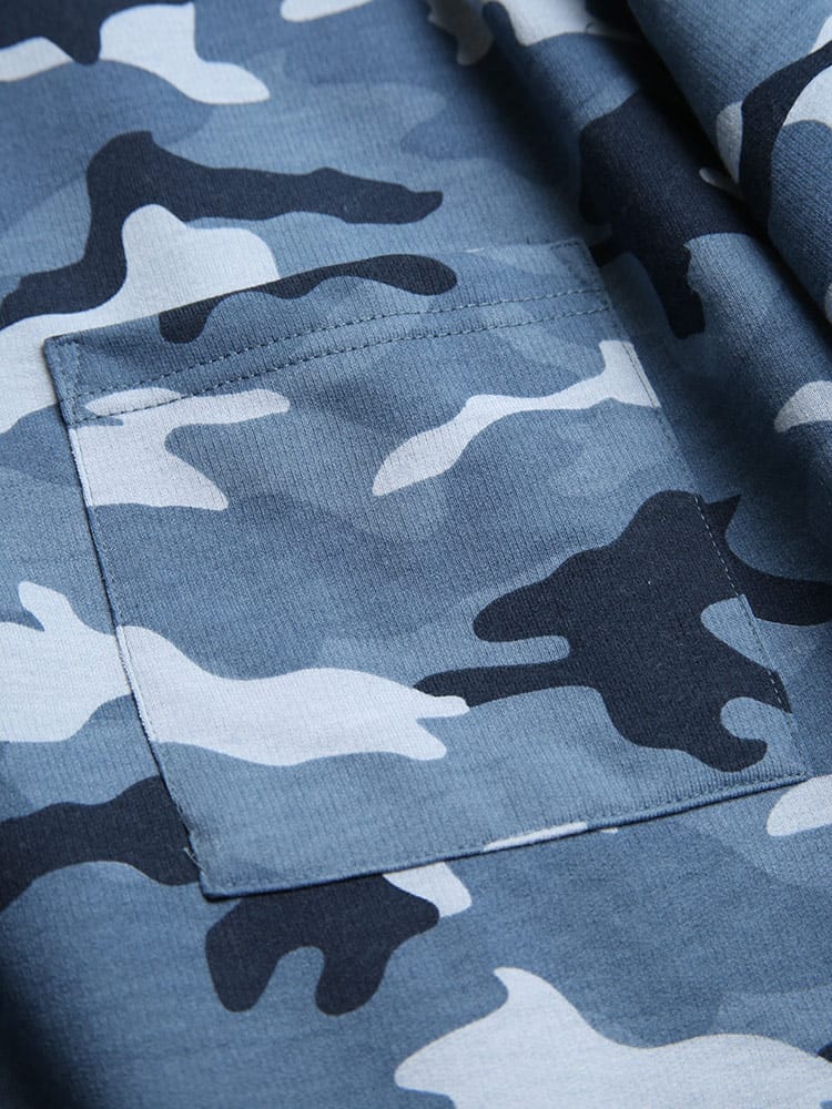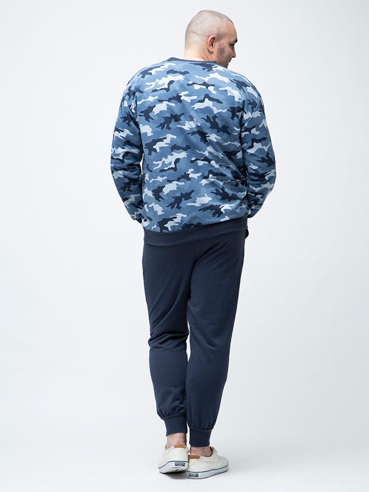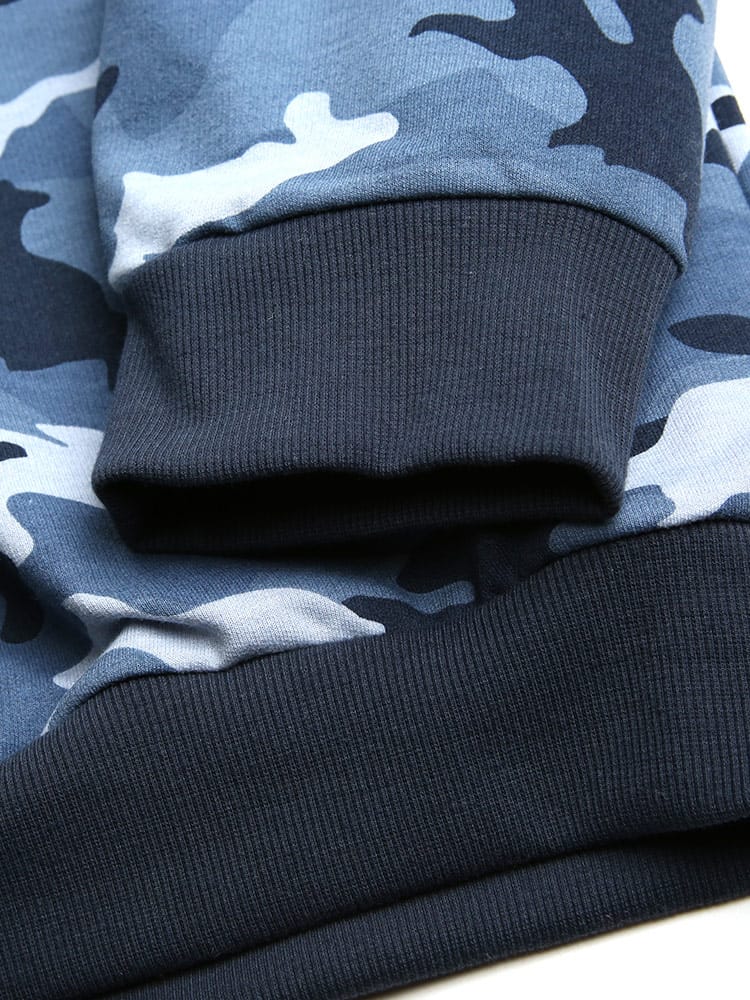 迷彩柄がお洒落な長袖 Tシャツとロングパンツのセットアップです。袖、裾はリブデザイン。パンツのウエストはゴムとドローコード付きでサイズ調整出来ます。裏地は裏毛でサラッとしています。リラックス感のあるアイテムでルームウェアにおすすのアイテムです。