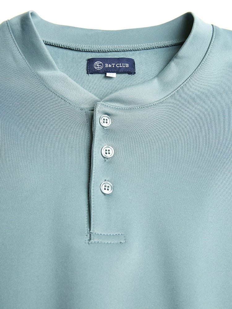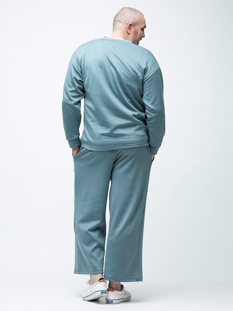 ダンボール生地でハリ感のあるストレッチ ヘンリーネック 長袖 Tシャツとロングパンツのセットアップです。無地デザインのシンプルなアイテム。Tシャツの首元はヘンリーネックデザイン。パンツのウエストはゴムとドローコード付きでサイズ調整出来ます。リラックス感のあるアイテムでルームウェアにおすすのアイテムです。