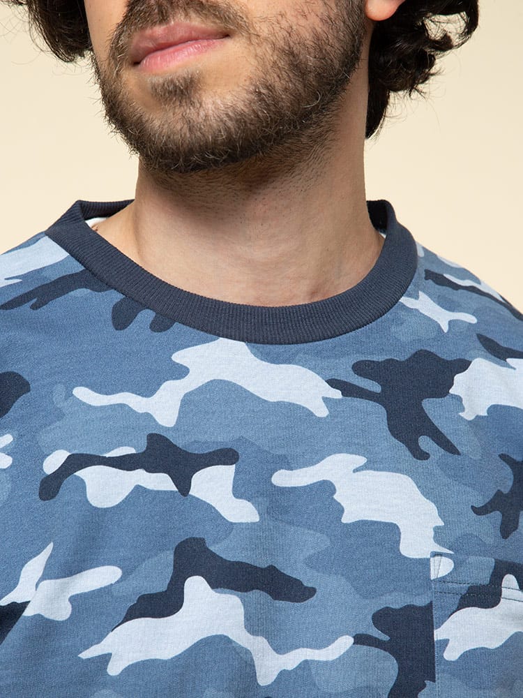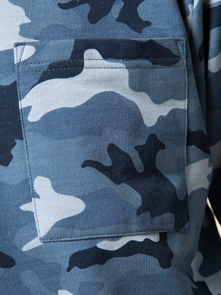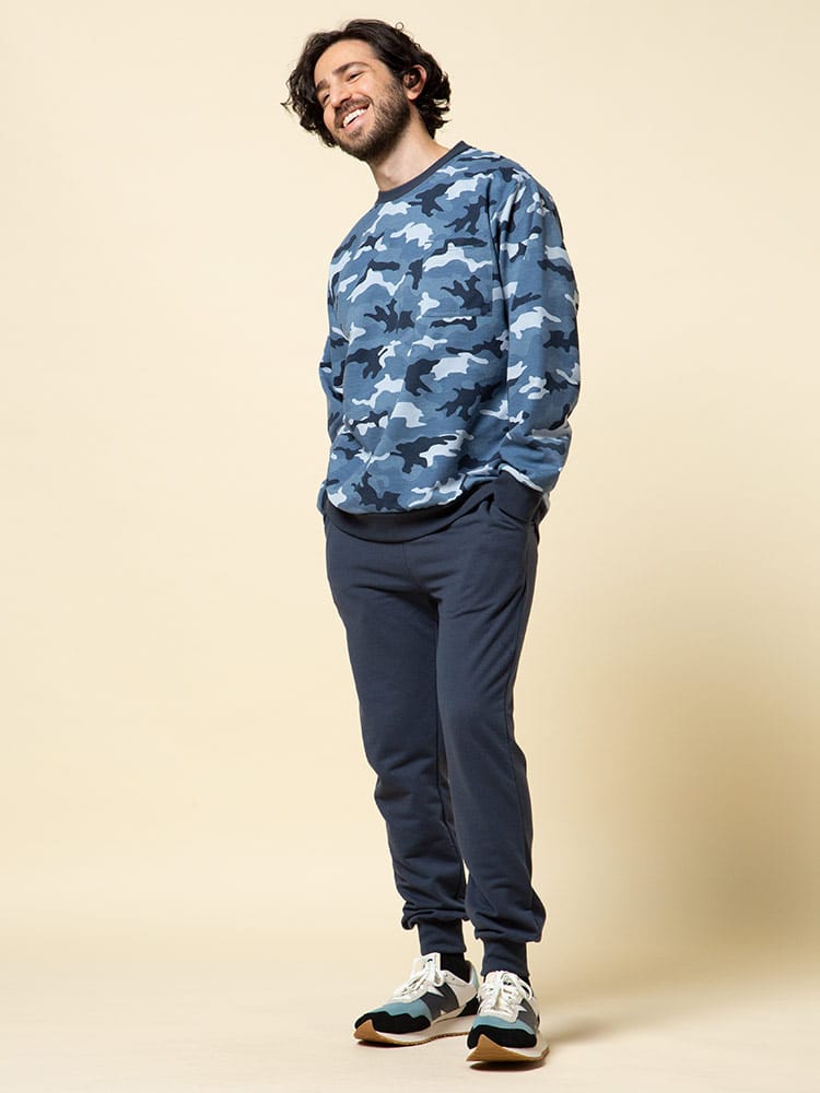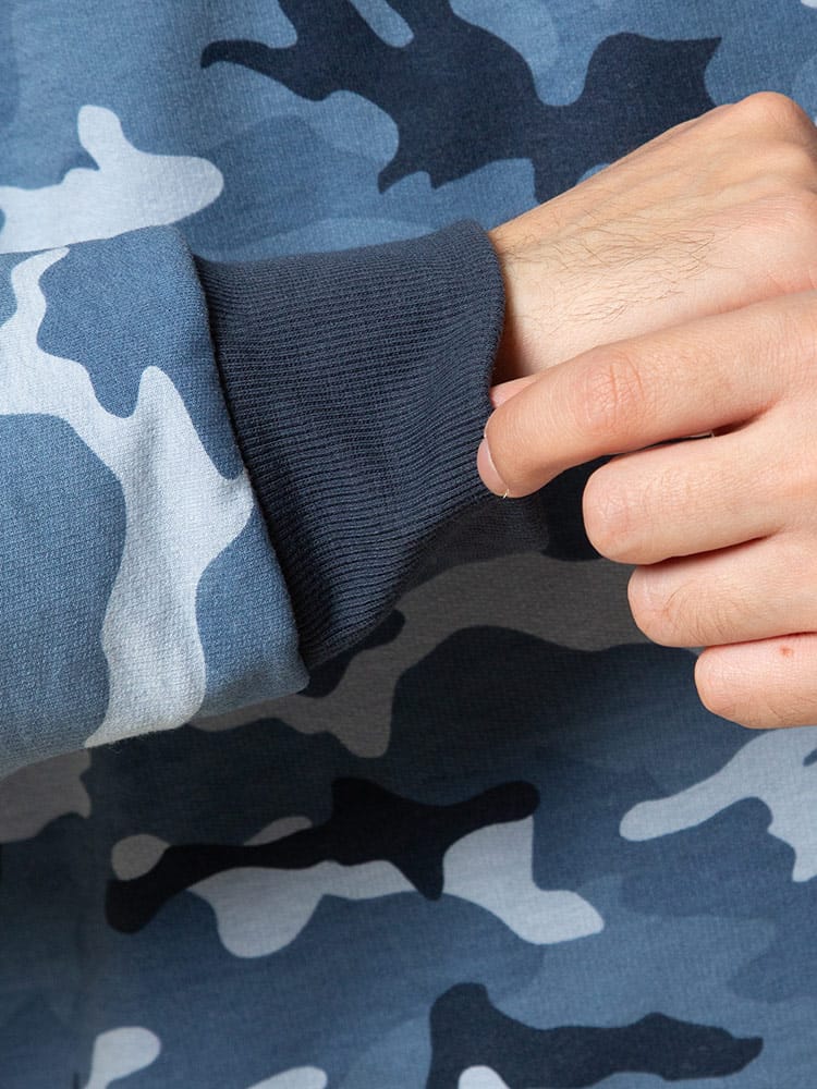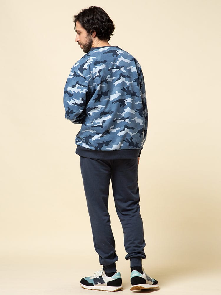 迷彩柄がお洒落な長袖 トレーナーとロングパンツのセットアップです。袖、裾はリブデザイン。パンツのウエストはゴムとドローコード付きでサイズ調整出来ます。裏地は裏毛でサラッとしています。リラックス感のあるアイテムでルームウェアにおすすのアイテムです。