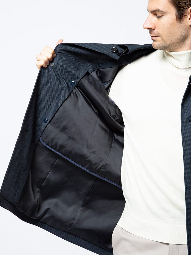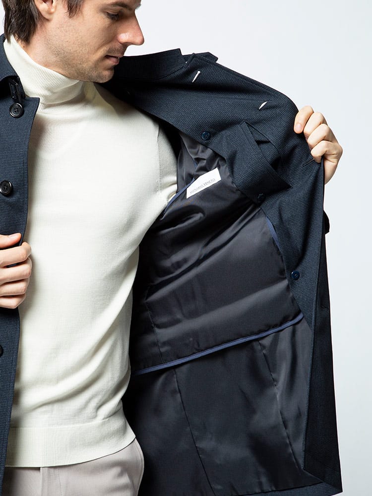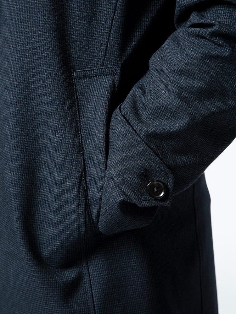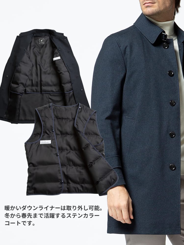 裏面ラミネート加工を施したダウンライナー 千鳥柄 コートです。取り外しが出来る保温性抜群のダウンライナー付きでロングシーズンご着用いただけます。襟ベルト付きで首元の冷気もシャットアウト。バックサイドにサイズを調整出来るベルト付き。ベーシックなデザインでビジネスシーンにおすすめです。