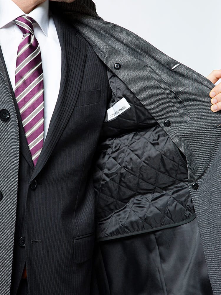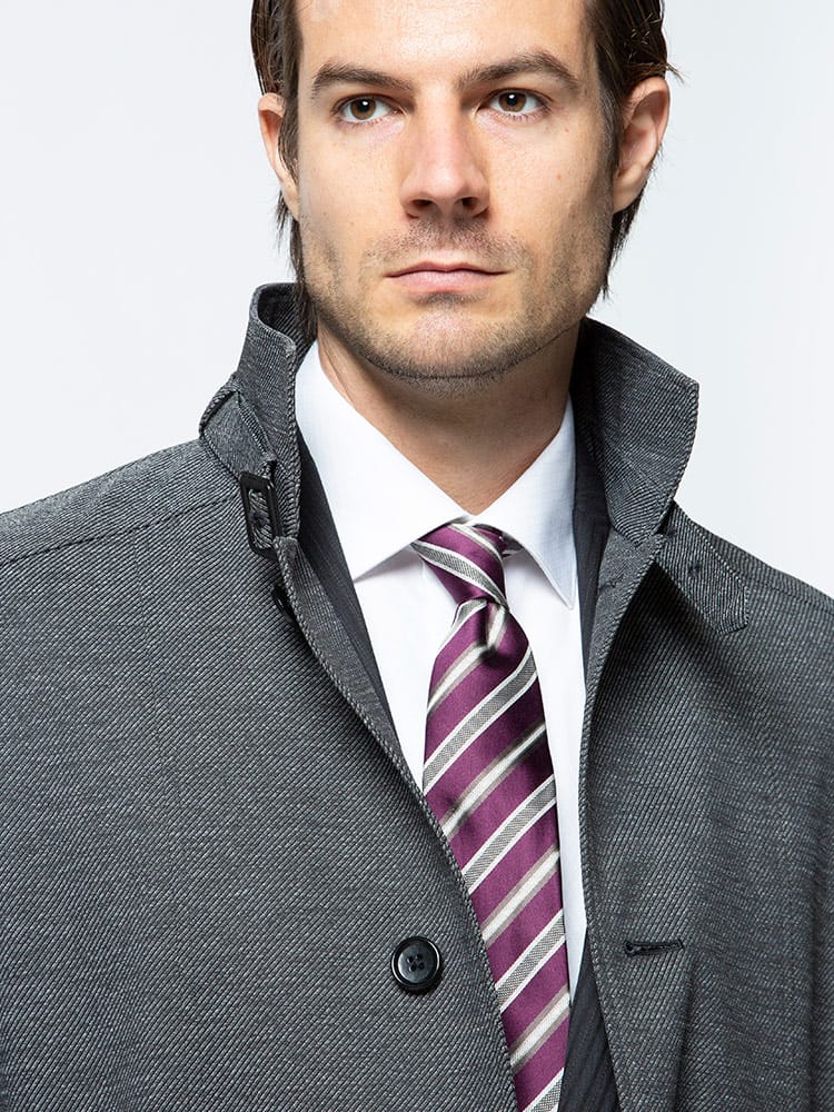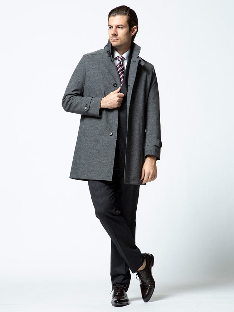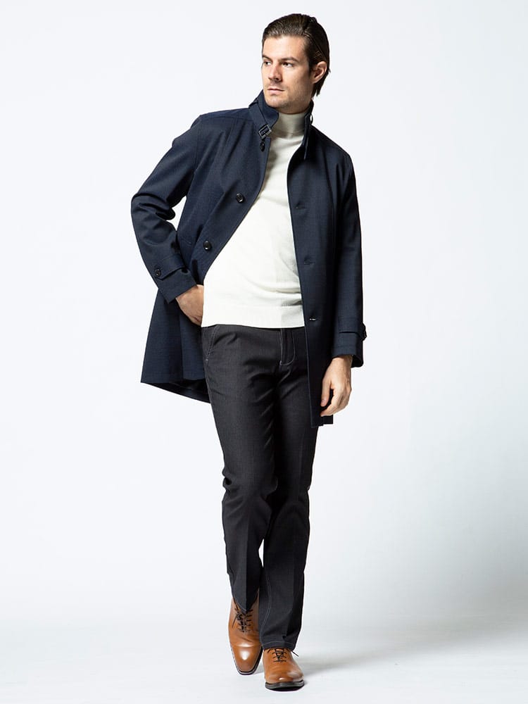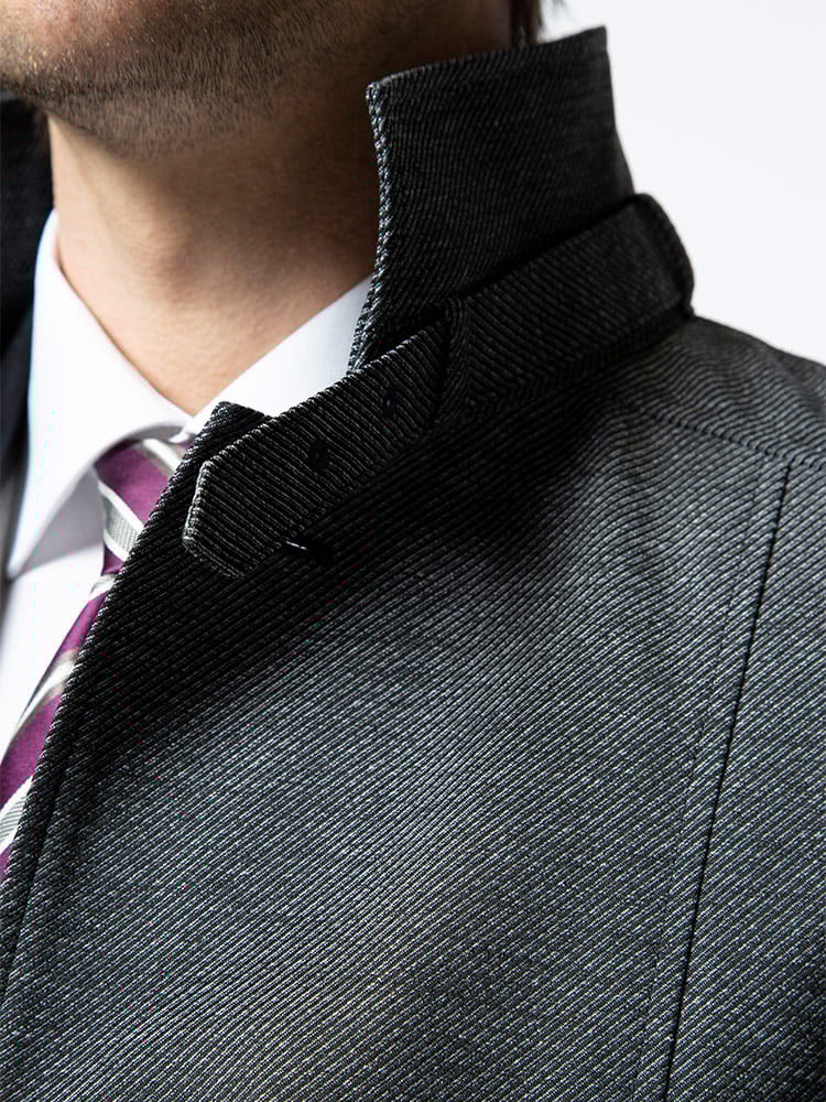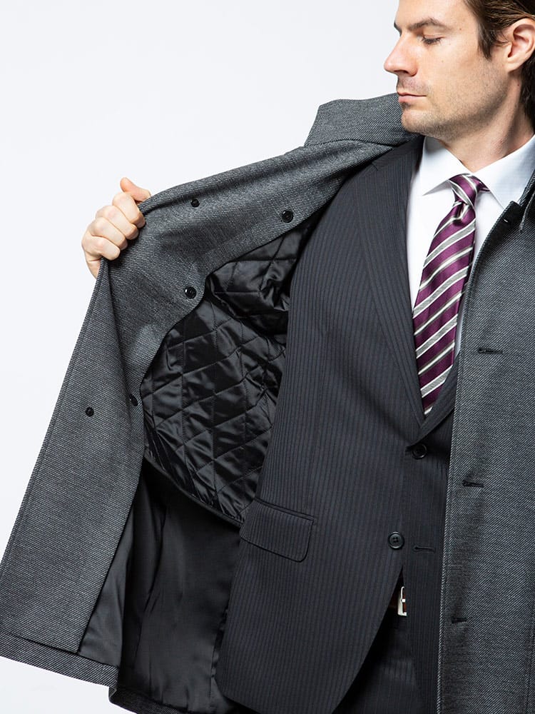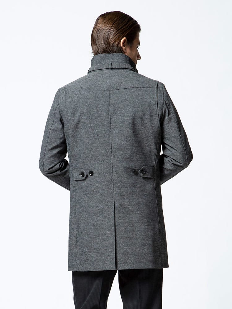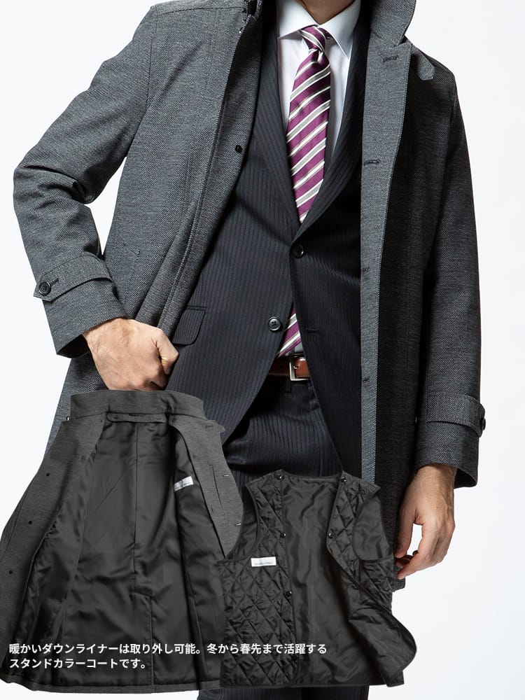 裏面ラミネート加工を施した中綿ライナー スタンド コートです。取り外しが出来る中綿ライナーには高い保温性と通気性を持つ断熱素材「comfortemp」を使用しています。バックサイドにサイズ調整出来るベルト付き。無地のベーシックなデザインはビジネスシーンに最適な一着です。