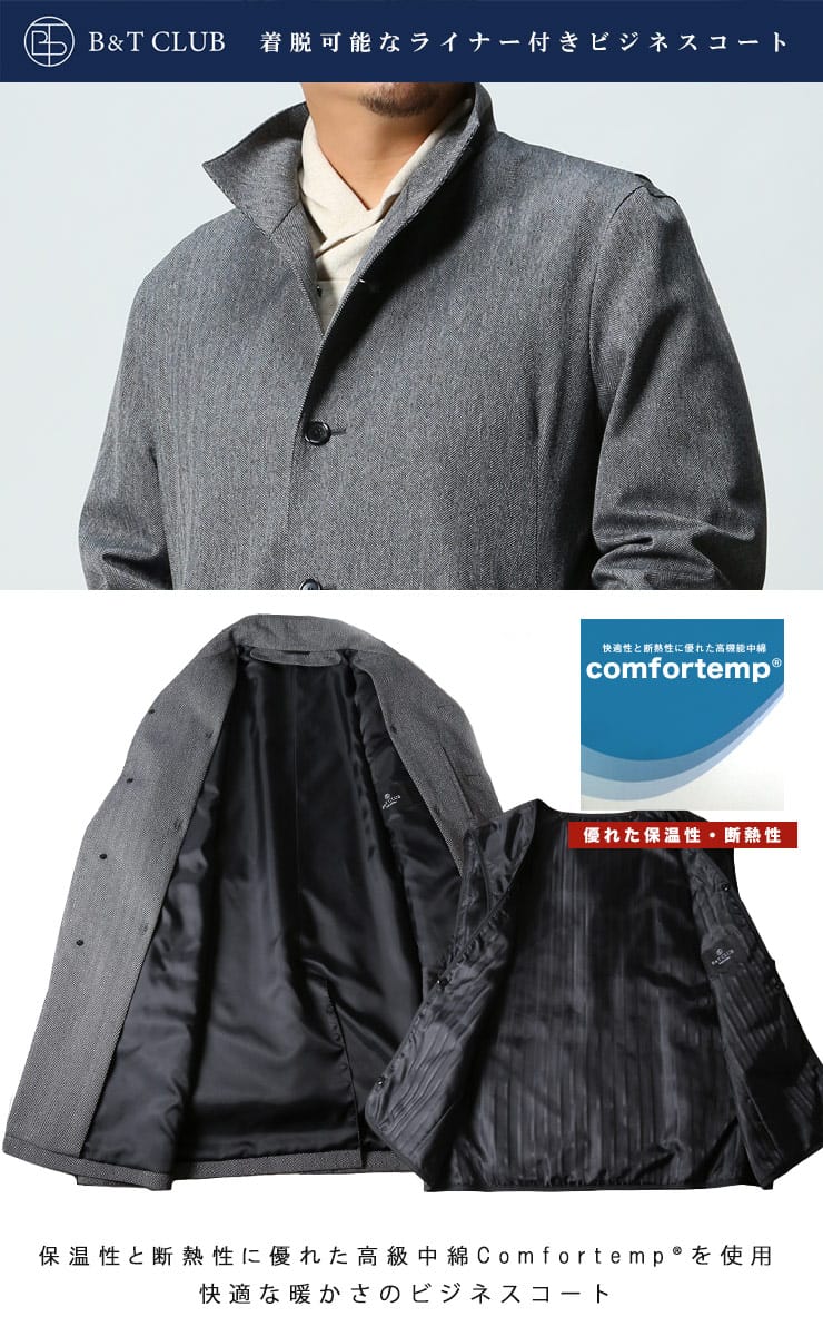 ビジネススタイルにマッチするB&T CLUBのヘリンボンコートです。高い保温性と通気性を備えた中綿素材「comfortempR」を使用したライナーは取り外し可能となっていて幅広いシーズン活躍してくれます。