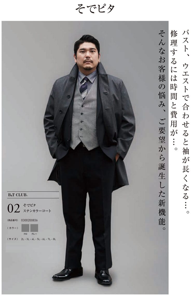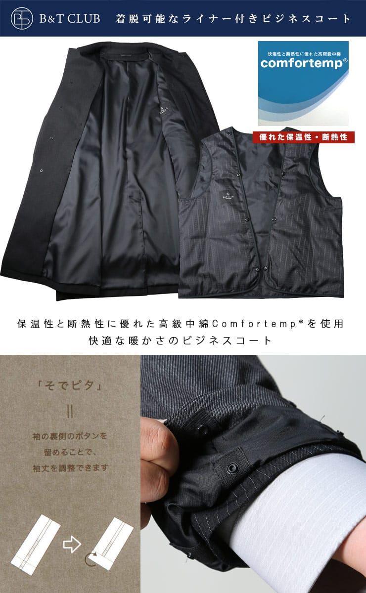 ビジネススタイルにマッチするB&T CLUBのステンカラーコートです。高い保温性と通気性を備えた中綿素材「comfortempR」を使用したライナーは取り外し可能となっていて幅広いシーズン活躍してくれます。また袖口内側にはボタンにより袖の長さを調節できる「そでピタ」機能を搭載しているので、長すぎたり短すぎたりと不格好なシルエットを防ぐ嬉しいつくりとなっています。