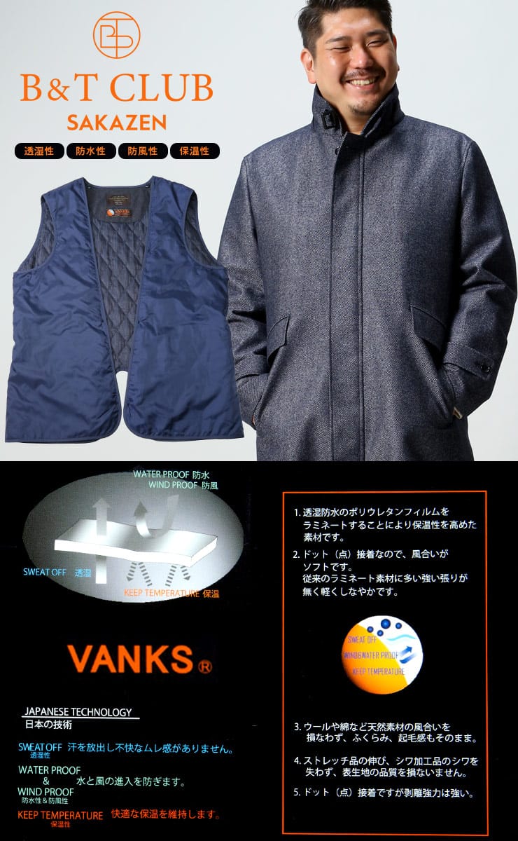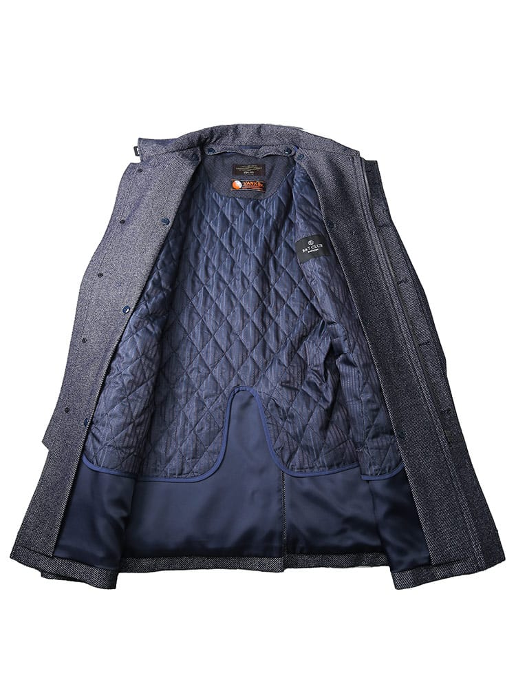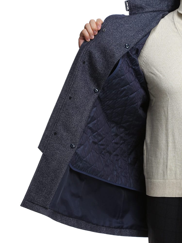 多機能素材のVANKSを採用したウール 中綿ライナー コート VANKS。ウール生地で品のあるデザイン。透湿防水のポリウレタンフィルムをラミネートすることにより保温性を高めた素材で透湿性、防水性&防風性、保温性で快適な着用感を提供します。取り外し出来る中綿ライナー付きでロングシーズンご着用いただけるのも嬉しいポイントです。バックサイドにサイズを調整出来るベルト付き。無地のベーシックなデザインでビジネスシーンに最適です。