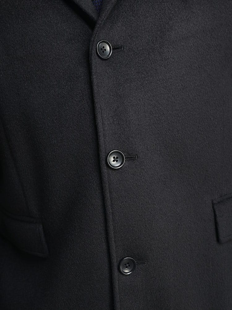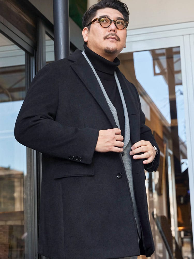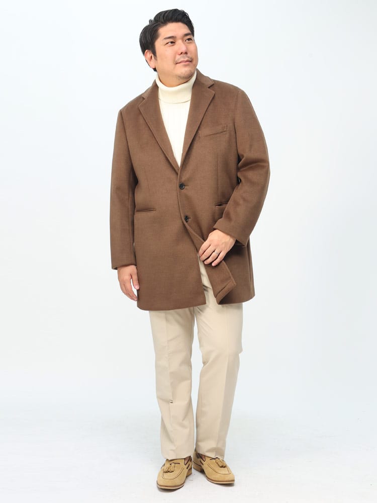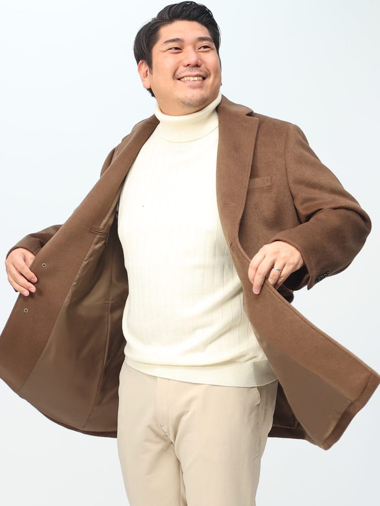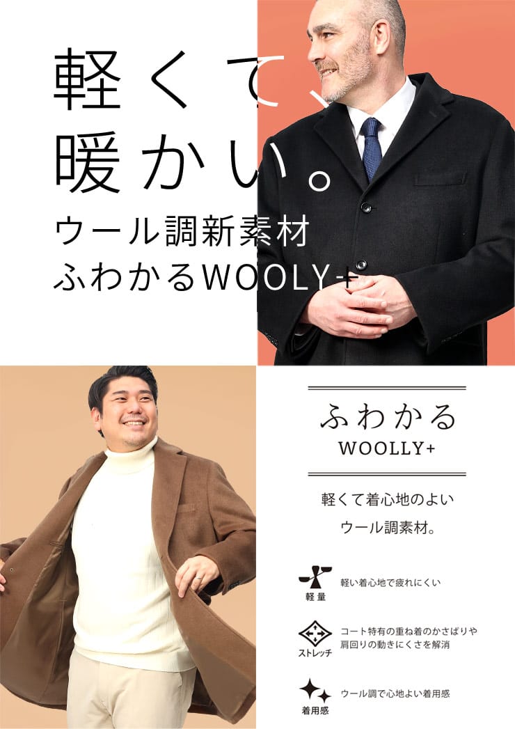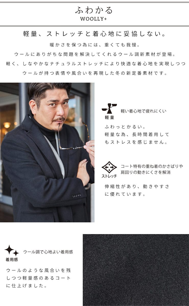 サカゼンオリジナルの「ふわかる」シリーズから、軽くて着心地のよいウール調素材「WOOLY+」を使用したチェスターコートです。ウールのような肌ざわりの上質感のある素材がポイント。ストレッチ性もあるので、コートを着た時のかさばるような動きづらさの無いつくりとなっています。脇から裾にかけての切り替えによりスマートなシルエットを形成しつつ立体的な動きやすさも備えた、ビジネスからプライベートまで活躍してくれるコートです。
