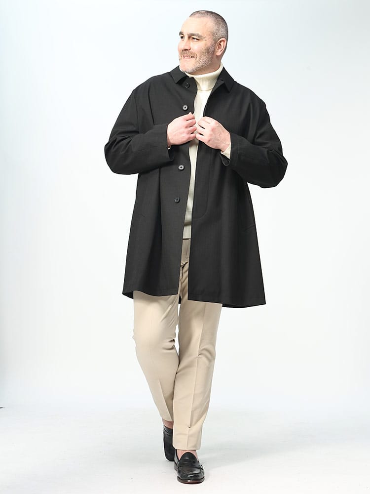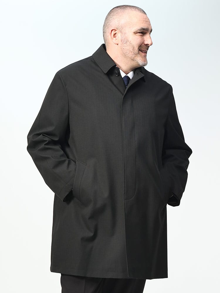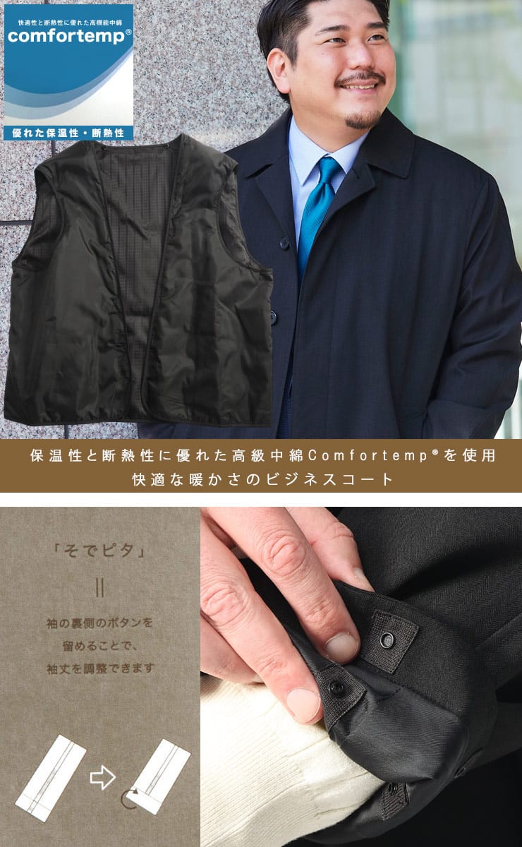 袖裏にあるボタンを留めることで、袖丈を調節できる便利な「そでピタ」ステンカラーコート。あらゆる天候に対応するComfortemp素材を使用しており、保温性を持ちながら、高い通気性を持った一着。リサイクル素材を使用しているので環境にも優しいサステナブルなビジネスコートとなっています。
