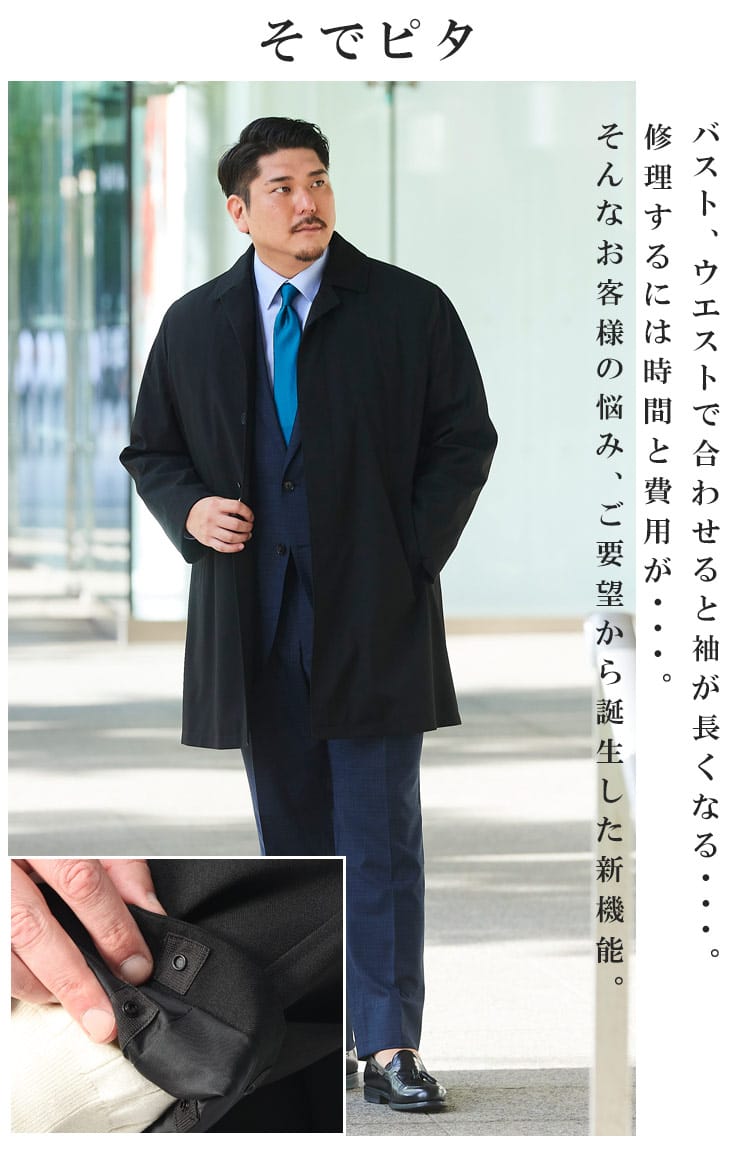 ![]() | そでピタコートシリーズ スーツやジャケットの上に羽織るものなので少しゆったりサイズを選びたいけでも、袖丈が長過ぎるのが気になる・・・ そんなお悩みを解決する"そでピタ"コート。袖裏のボタンを留めることで簡単に袖の長さが調整できる優れもの >> 商品一覧はこちら |