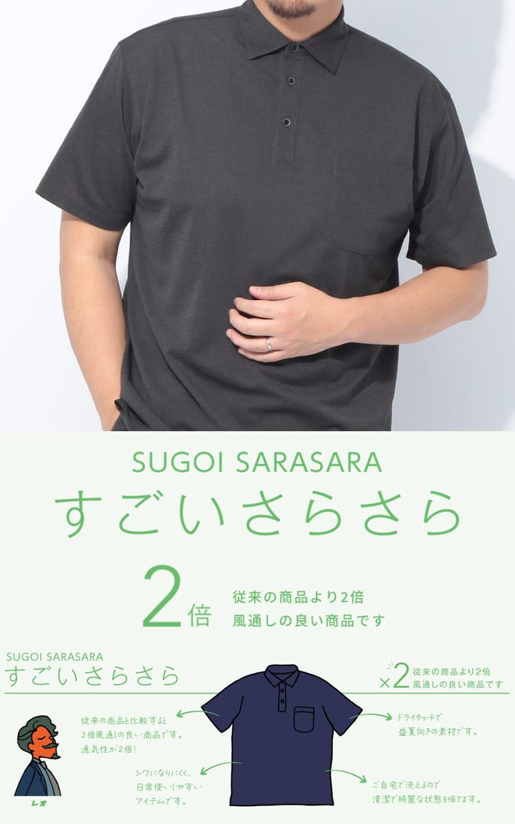 暑い季節も快適に!HYBRIDBIZの「すごいさらさら」ポロシャツで、涼しく快適なビジネススタイルを。暑い季節でも快適に過ごせる、涼しくサラッとした肌触りが特徴のポロシャツです。ポリエステル100%の生地は、吸汗速乾性に優れ、汗をかいてもすぐに乾き、サラサラとした着心地をキープします。シンプルな無地デザインで、ビジネスシーンはもちろん、カジュアルな装いにもマッチします。胸ポケット付きで、機能性も抜群。2Lから5Lまでの大きいサイズ展開で、幅広い体型の方に対応します。