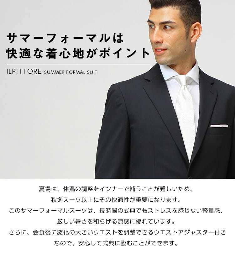 サマーシーズンに最適なサマーフォーマル仕様のシングル 2ツ釦 スーツ。軽量性で素材・裏地・縫製にわたって涼感仕立てで暑い日も快適さを提供致します。パンツのウエストはアジャスター付きでサイズ調整が出来ます。ビジネスシーンにおすすめのスーツです。