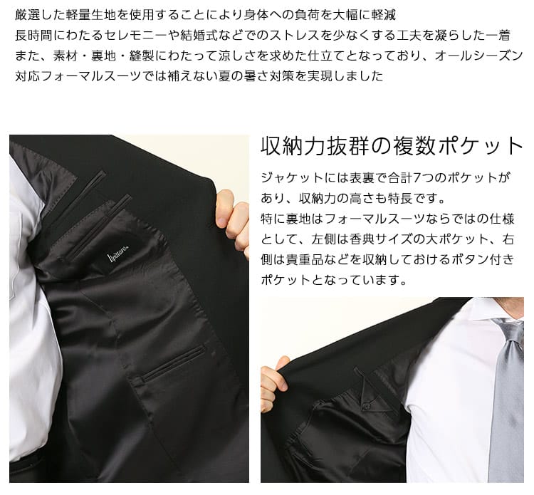 仕様 :外側ポケット数×7つ / 内側ポケット数×4つ / シングル2つボタン / 軽量 / 清涼仕立て / ウエストアジャスター付き(±6cm) / 背抜き / セッパタイプ / 額縁あり / センターベント / ワンタック