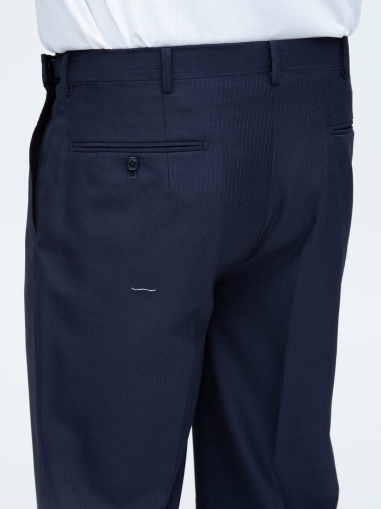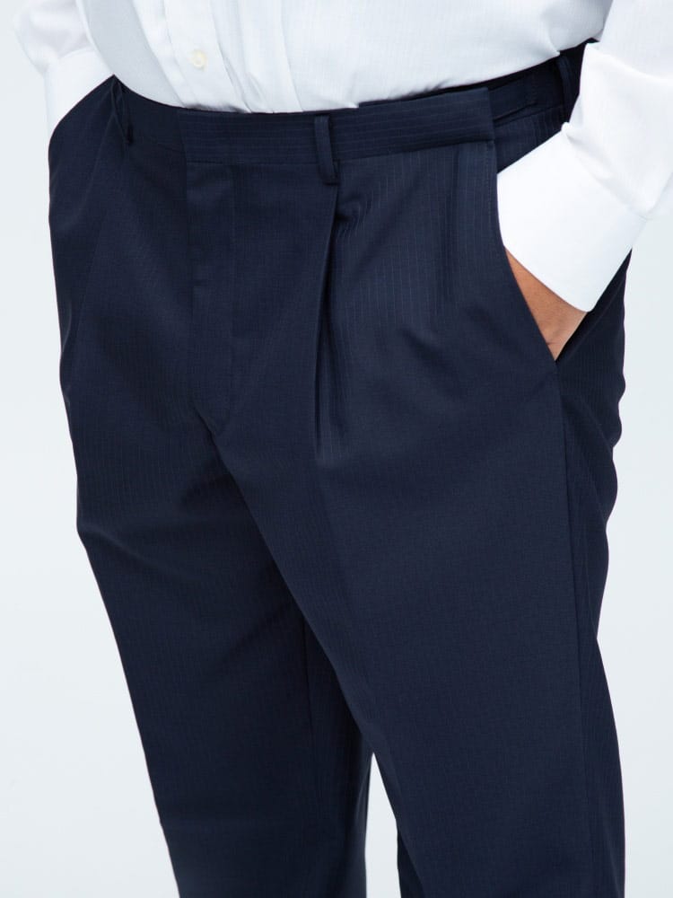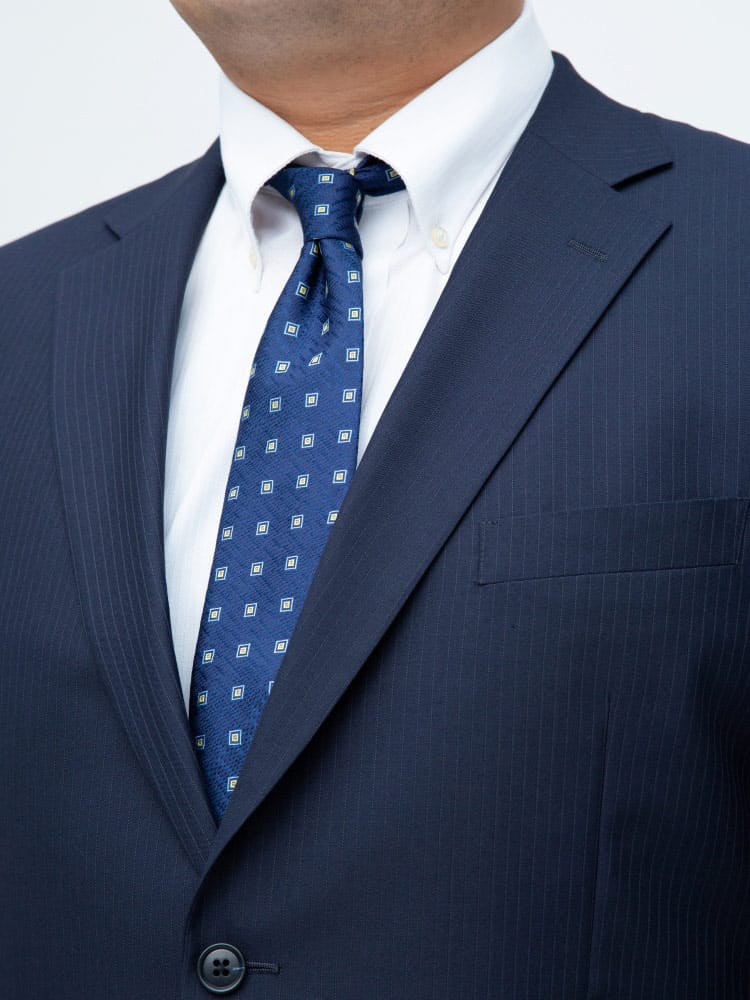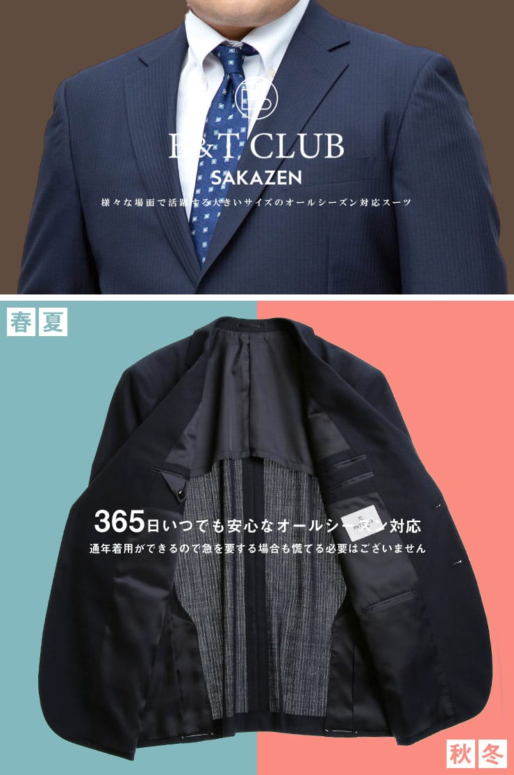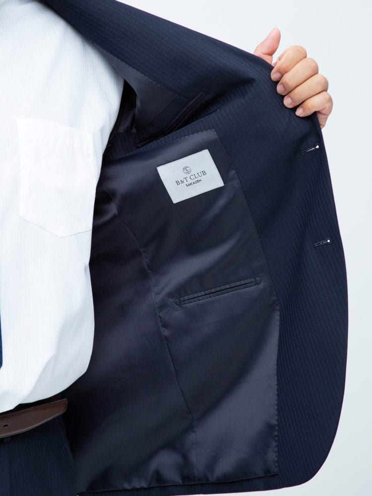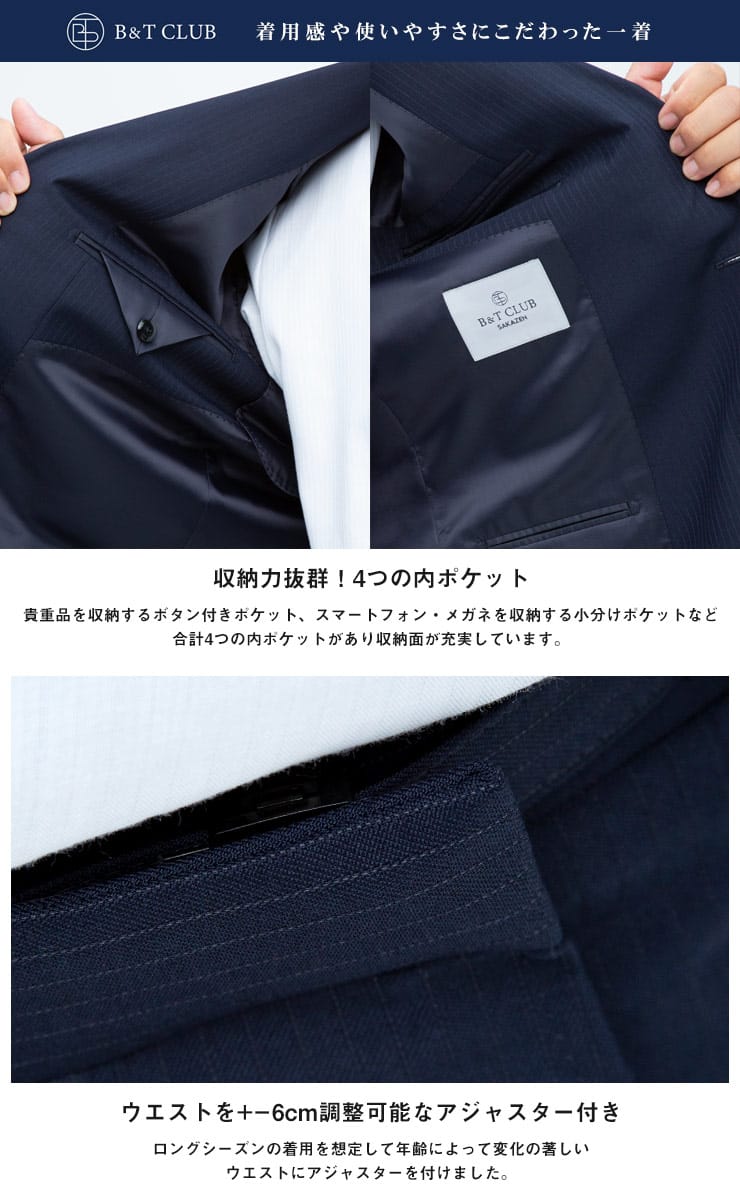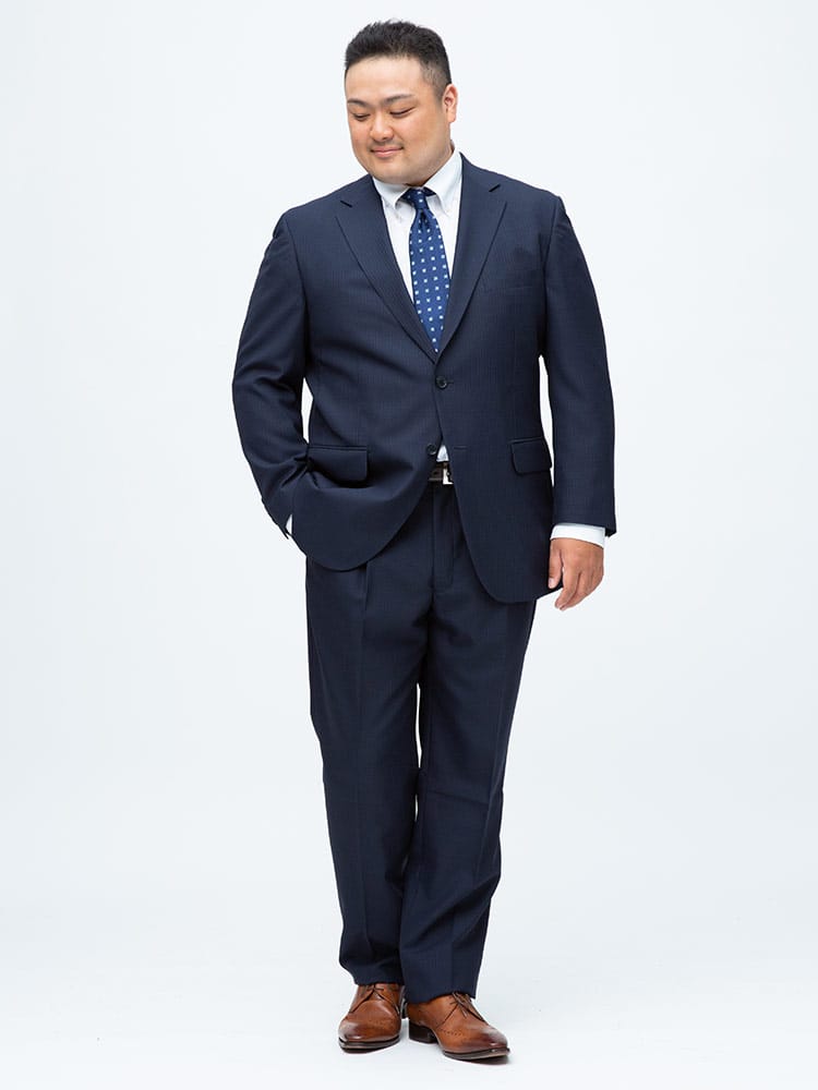 仕様 :スーツ外側ポケット数×3つ / 内側ポケット数×4つ / シングル2つボタン / 背抜き / サイドベンツ / セッパタイプ / 額縁なし / パンツポケット数×4つ / ジップフライ / ワンタック / ウォッシャブル / ツーパンツ