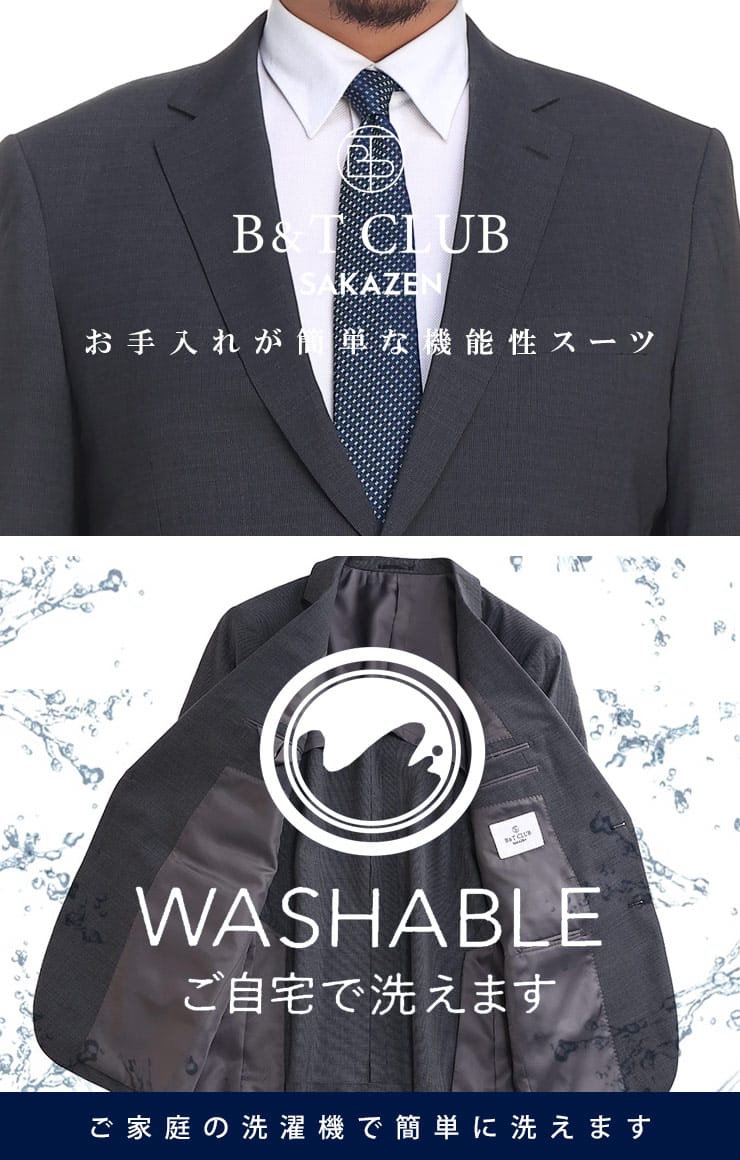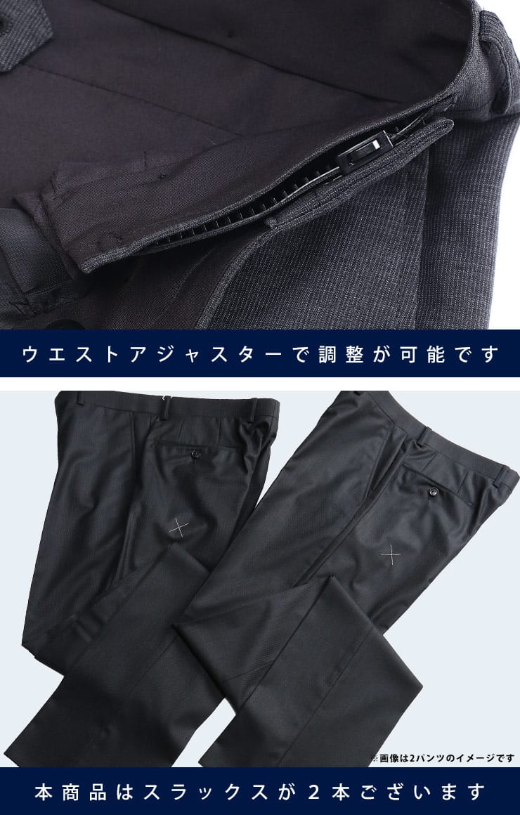 リラックスできるスタイリングで着心地抜群。長時間着用してもストレスを感じさせないウォッシャブルウエストアジャスターシングル 2パンツスーツ。ベーシックデザインなので使いやく、どんなシーンにも着用できます。ご家庭でお手入れ出来るウォッシャブル機能付きです。ウエストアジャスターでゆったりとした着用感です。毎日着るビジネスマンには嬉しい2パンツセット。