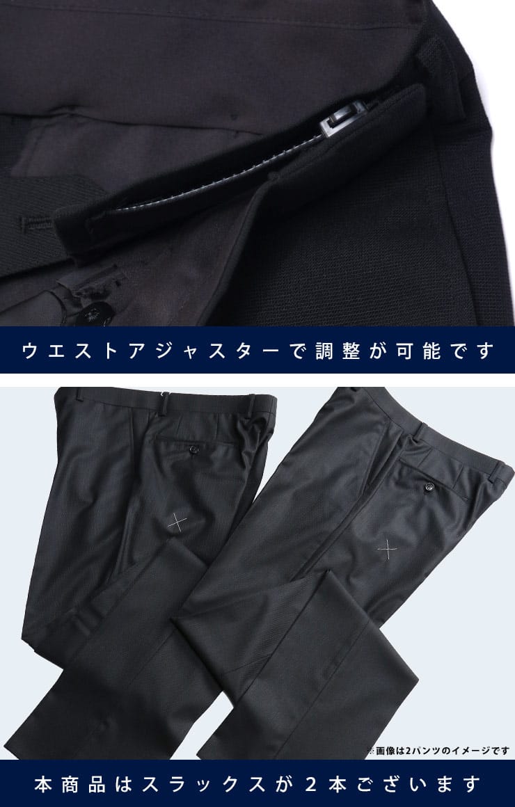 仕様 :ジャケット外側ポケット×3つ / 内側ポケット数×4つ / シングル2つボタン / 背抜き / セッパタイプ / 額縁なし / サイドベンツ / スラックス外側ポケット×4つ / ワンタック / ウォッシャブル / プリーツ加工 / ウエストアジャスター / ツーパンツ