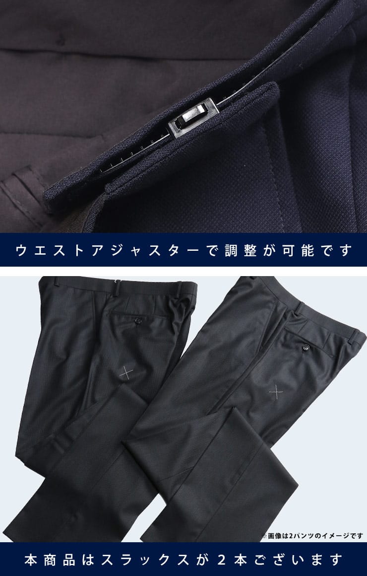 仕様 :ジャケット外側ポケット数×3つ / 内側ポケット数×4つ / シングル2つボタン / 背抜き / セッパタイプ / サイドベンツ / スラックスポケット数×4つ / ワンタック / ウエスト調節アジャスター / プリーツ加工 / ウォッシャブル / ツーパンツ
