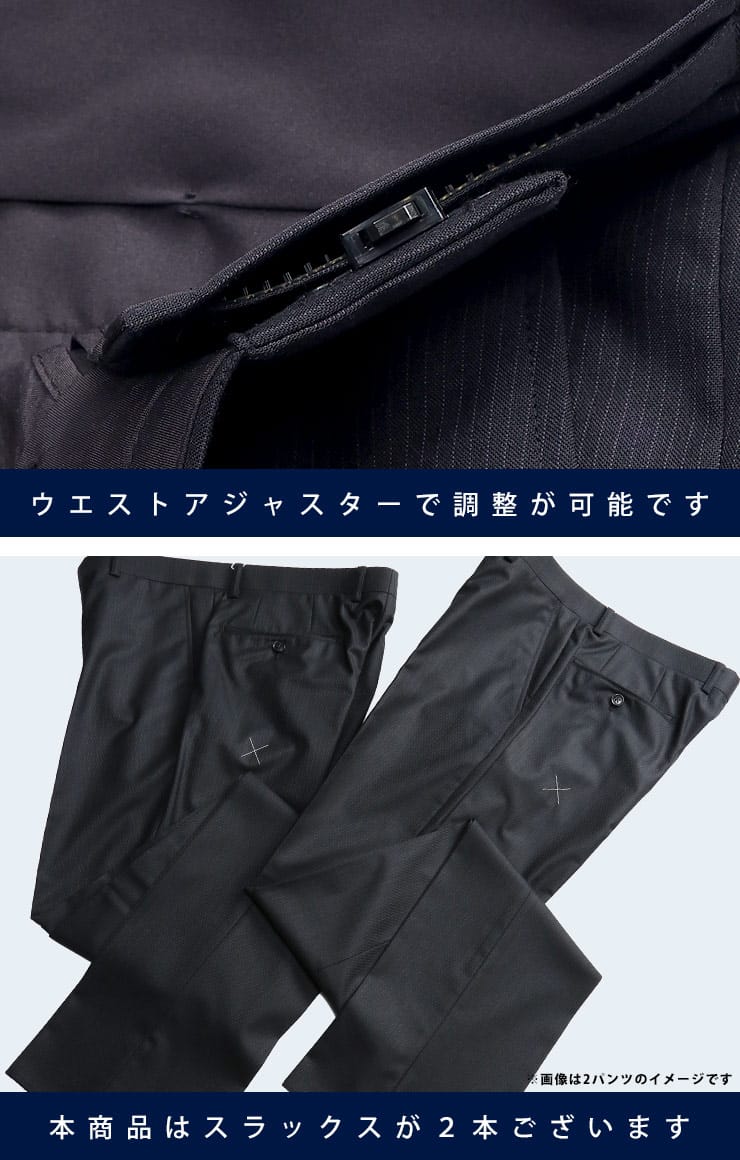 仕様 :ジャケット外側ポケット数×3つ / 内側ポケット数×4つ / シングル2つボタン / 背抜き / セッパタイプ / サイドベンツ / スラックスポケット数×4つ / ワンタック / ウエスト調節アジャスター / プリーツ加工 / ウォッシャブル / ツーパンツ