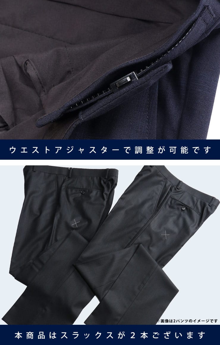 仕様 :ジャケット外側ポケット数×3つ / 内側ポケット数×4つ / シングル2つボタン / 背抜き / セッパタイプ / サイドベンツ / スラックスポケット数×4つ / ワンタック / ウエスト調節アジャスター / プリーツ加工 / ウォッシャブル / ツーパンツ