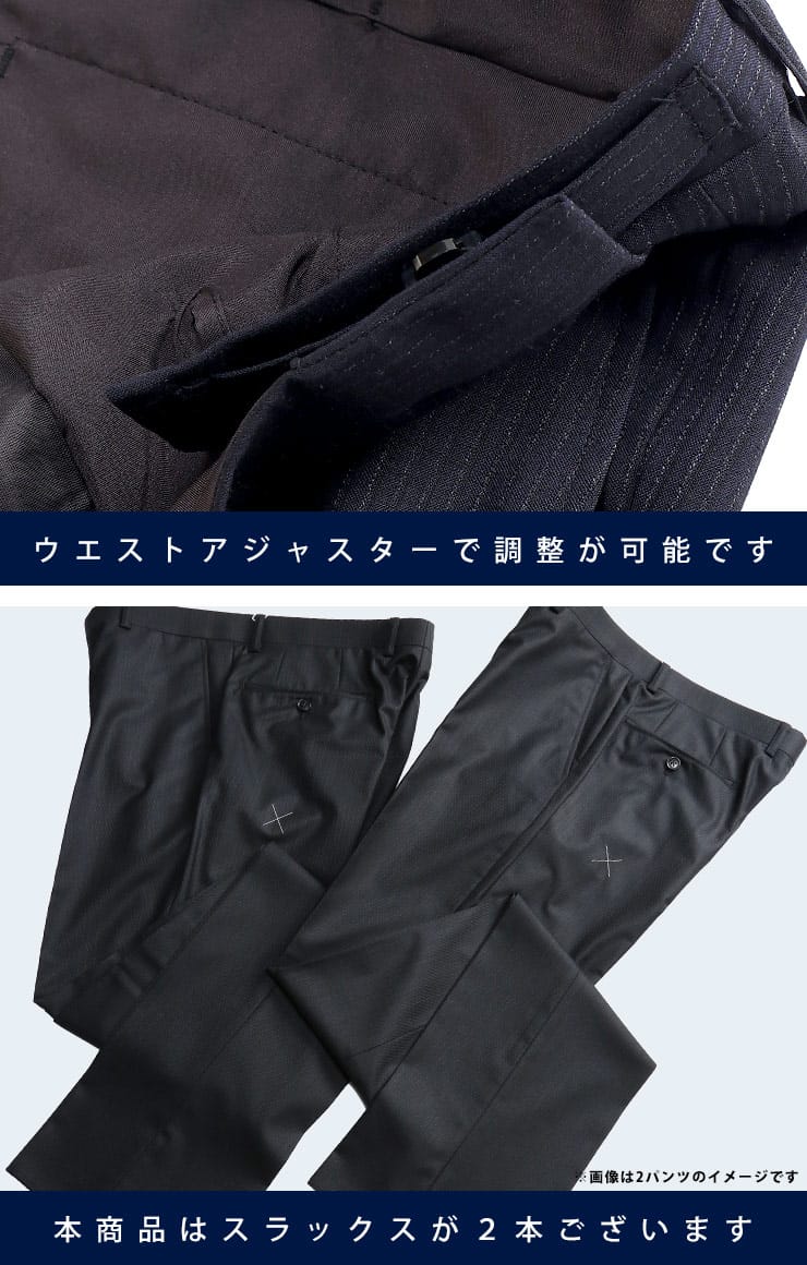 仕様 :ジャケット外側ポケット数×3つ / 内側ポケット数×4つ / シングル2つボタン / 背抜き / セッパタイプ / サイドベンツ / スラックスポケット数×4つ / ワンタック / ウエスト調節アジャスター / プリーツ加工 / ウォッシャブル / ツーパンツ
