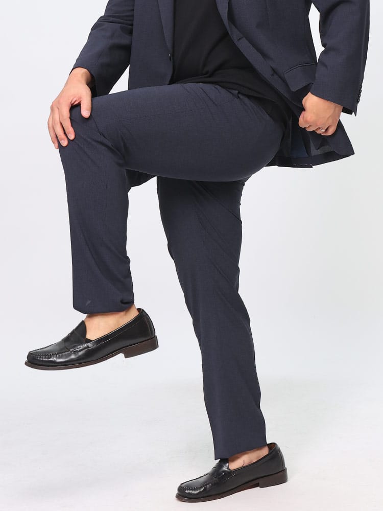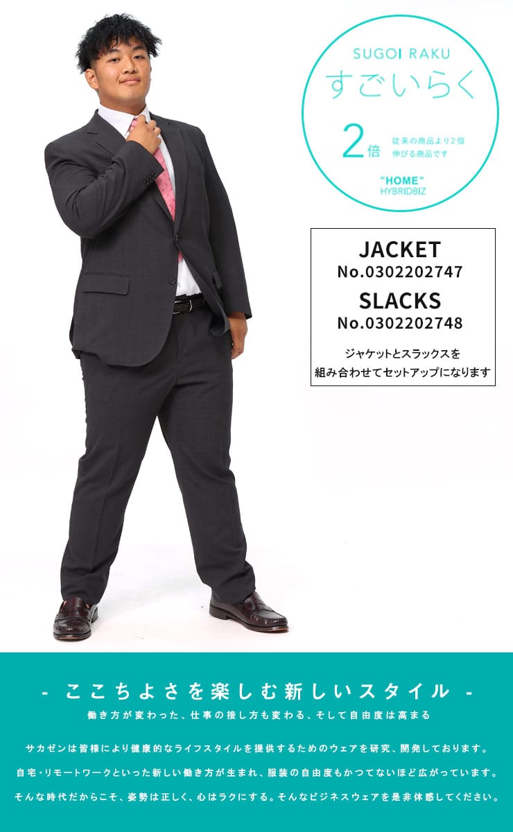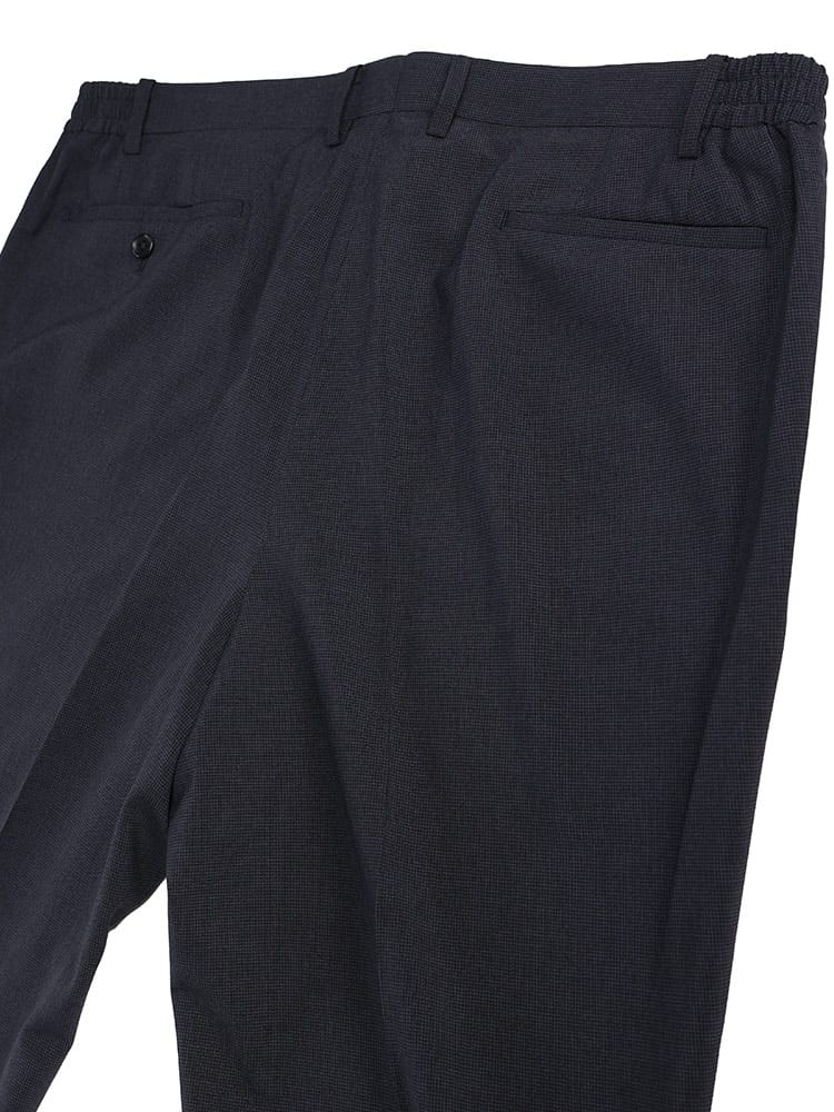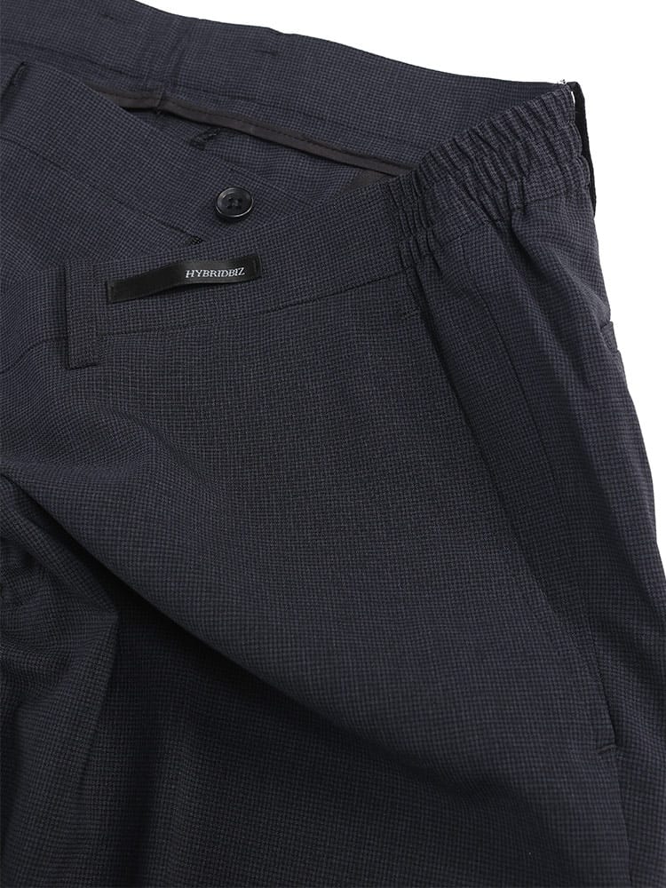 HYBRIDBIZ HOMEのチェック柄ノータックスラックスは、従来品より2倍伸縮性があり、サイドゴムとウエストシャーリング仕様で締め付け感を軽減します。通気性がよく、蒸れを防ぐ素材を使用しており、自宅での洗濯が可能です。リモートワークや日常のビジネスシーンにも最適なアイテムです。