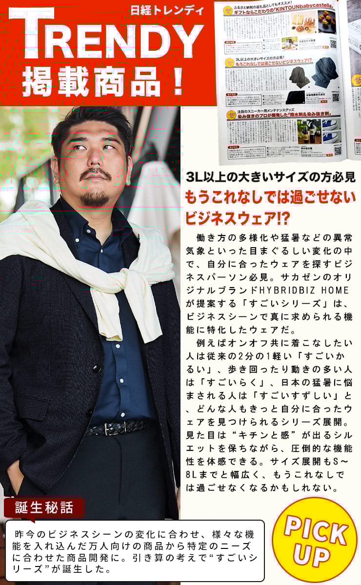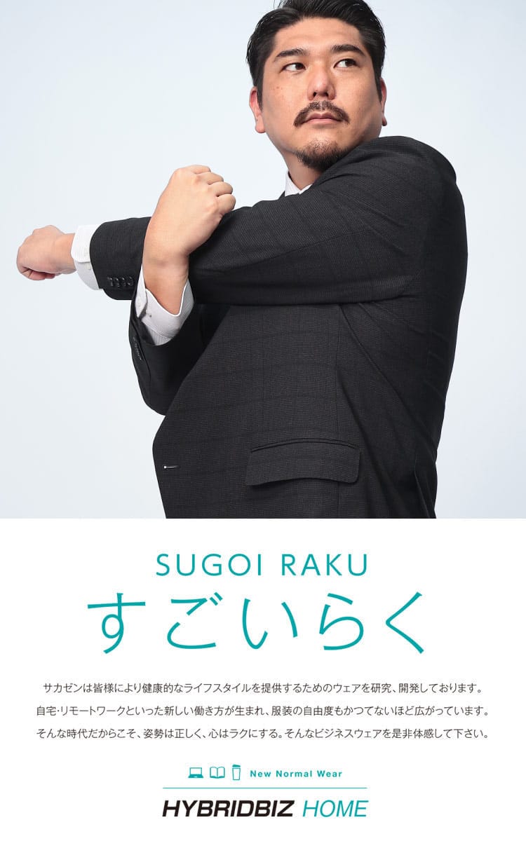 「ハイブリッドビズ (HYBRIDBIZ)」は、スタイリッシュでありながら、ビジネスウェア特有の窮屈さや動きにくさを解消することを目指したシリーズ。その中でも着心地を重視した、従来の商品より2倍伸びる「すごいらく」シリーズです。